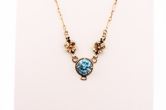 Art Deco Yellow Gold Necklace with Blue Zircon & Flower Accents