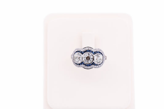 Exceptional Art Deco Platinum Diamond 3-Stone Ring with Sapphire Accents