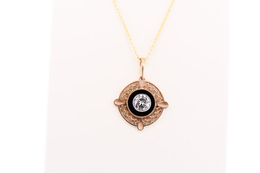 Rare Art Deco Yellow Gold Target Pendant with Onyx & Old European Cut Diamond