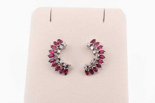Vintage Half Moon Shaped Ruby & Diamond Cluster Stud Earrings