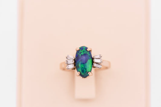 Blue-Green Black Opal Engagement Ring with Baguette Diamonds