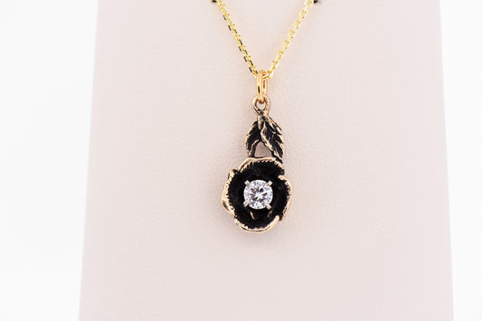Vintage 1970s Carved Rose Flower Pendant with Diamond Center & Black Antiqued Gold