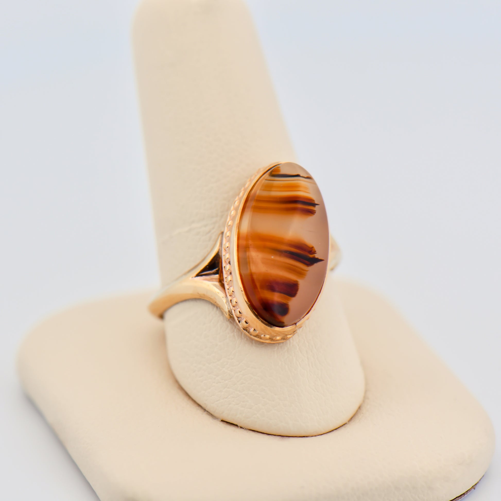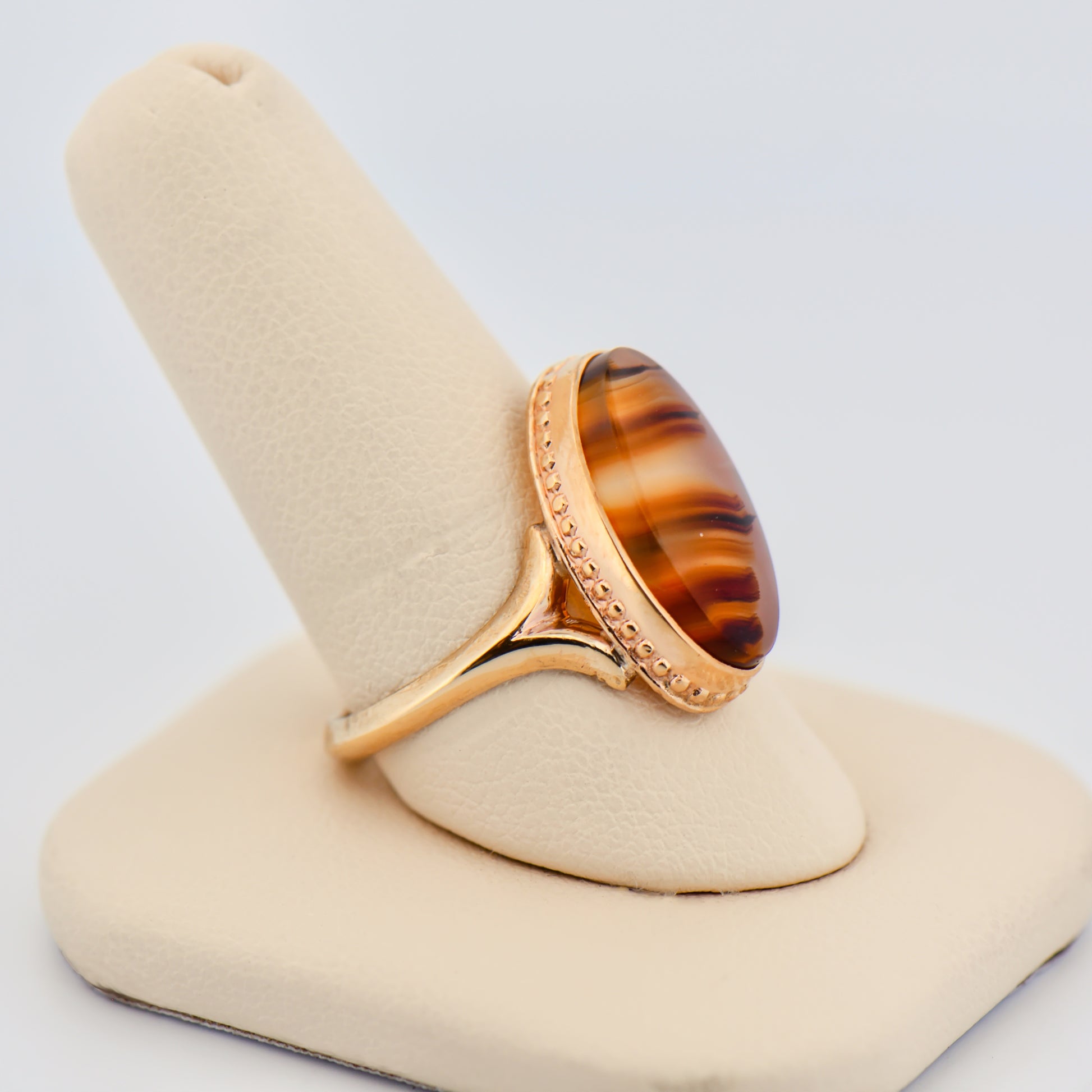 Details: Vintage banded agate bezel-set ring in 10k gold featuring oval banded agate; circa 1960s; estate piece.