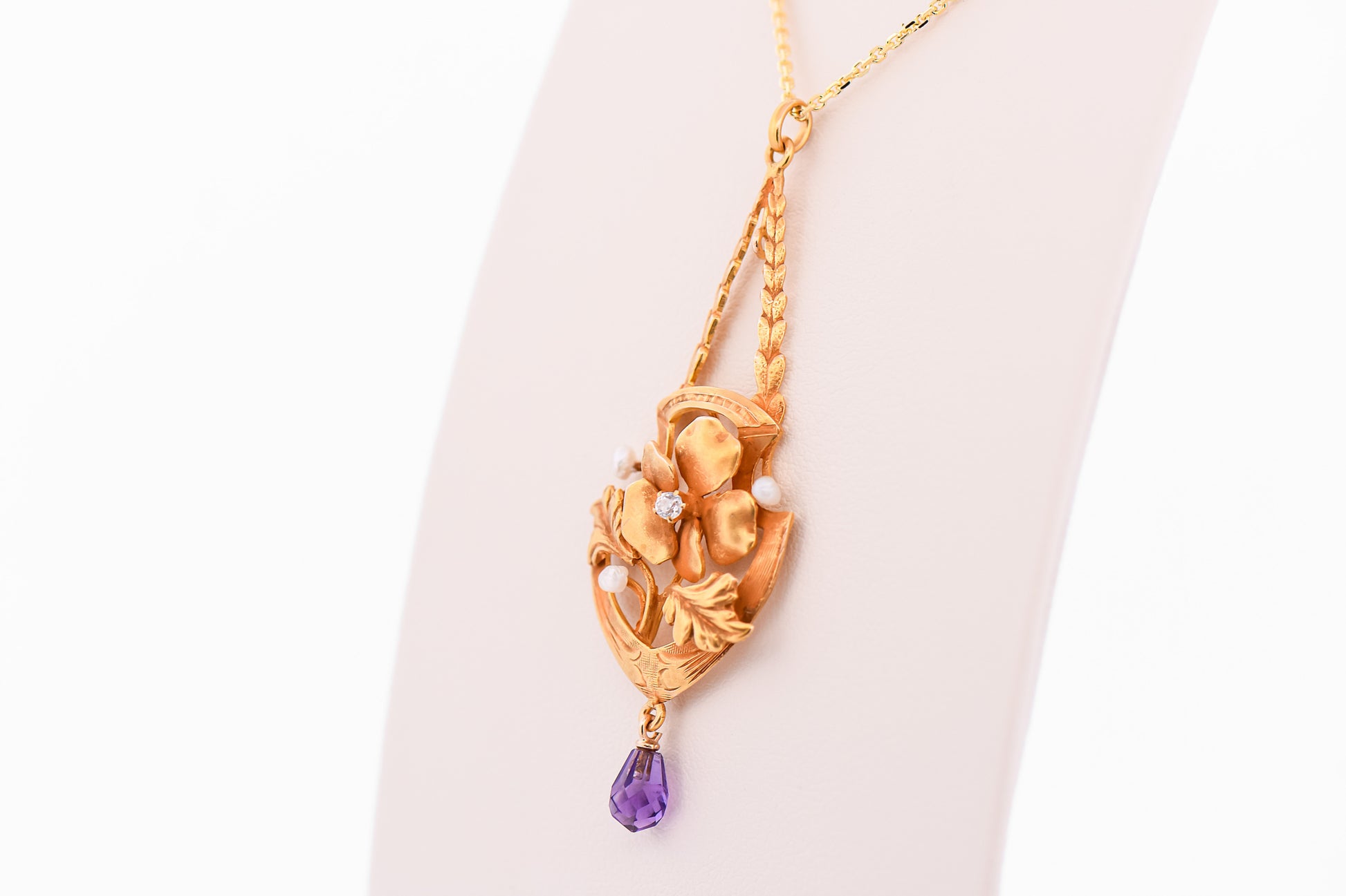 Details: Art Nouveau floral lavalier pendant crafted in bloomed 14k yellow gold featuring amethyst, diamond, and pearl accents; total weight approximately 3.2 grams; circa 1915.