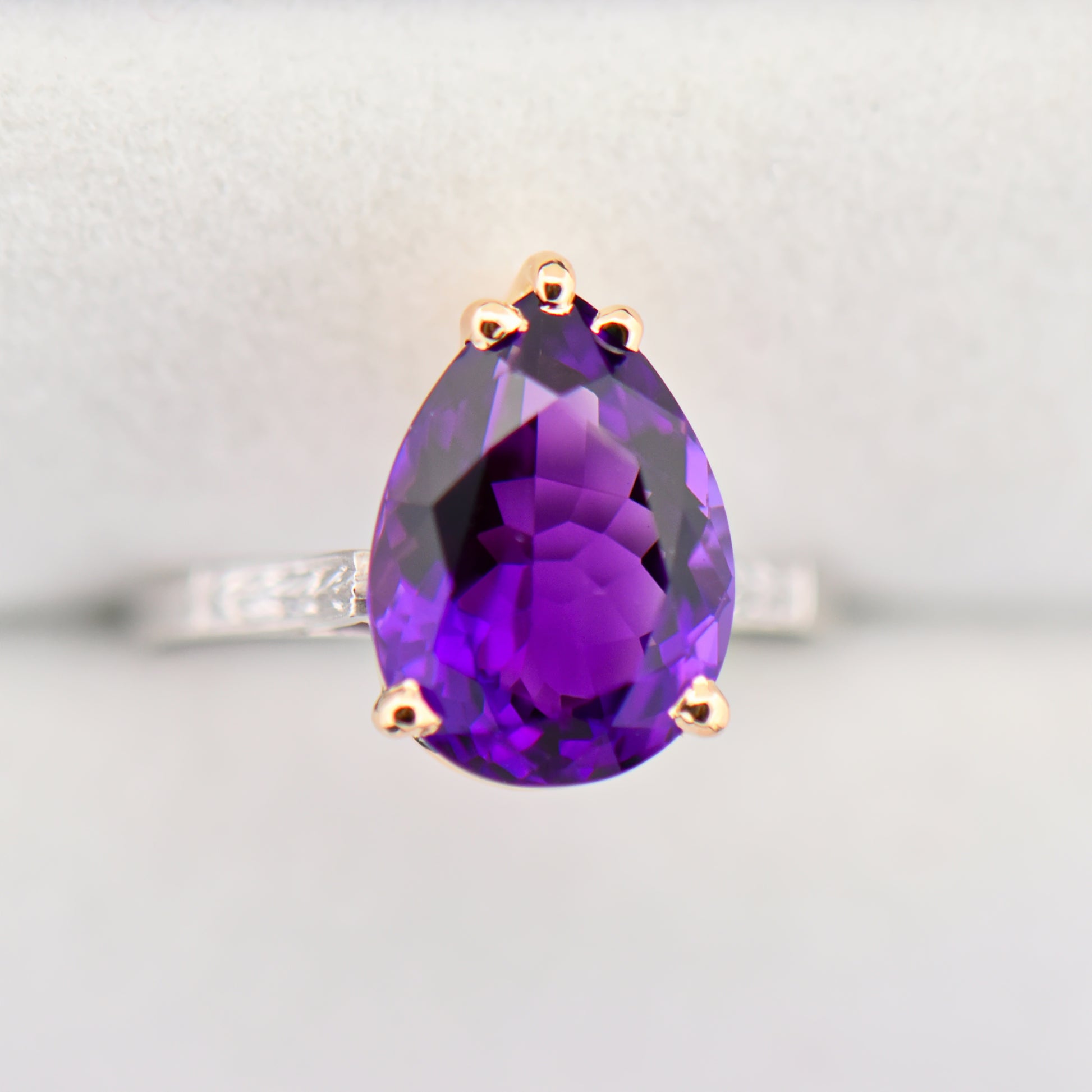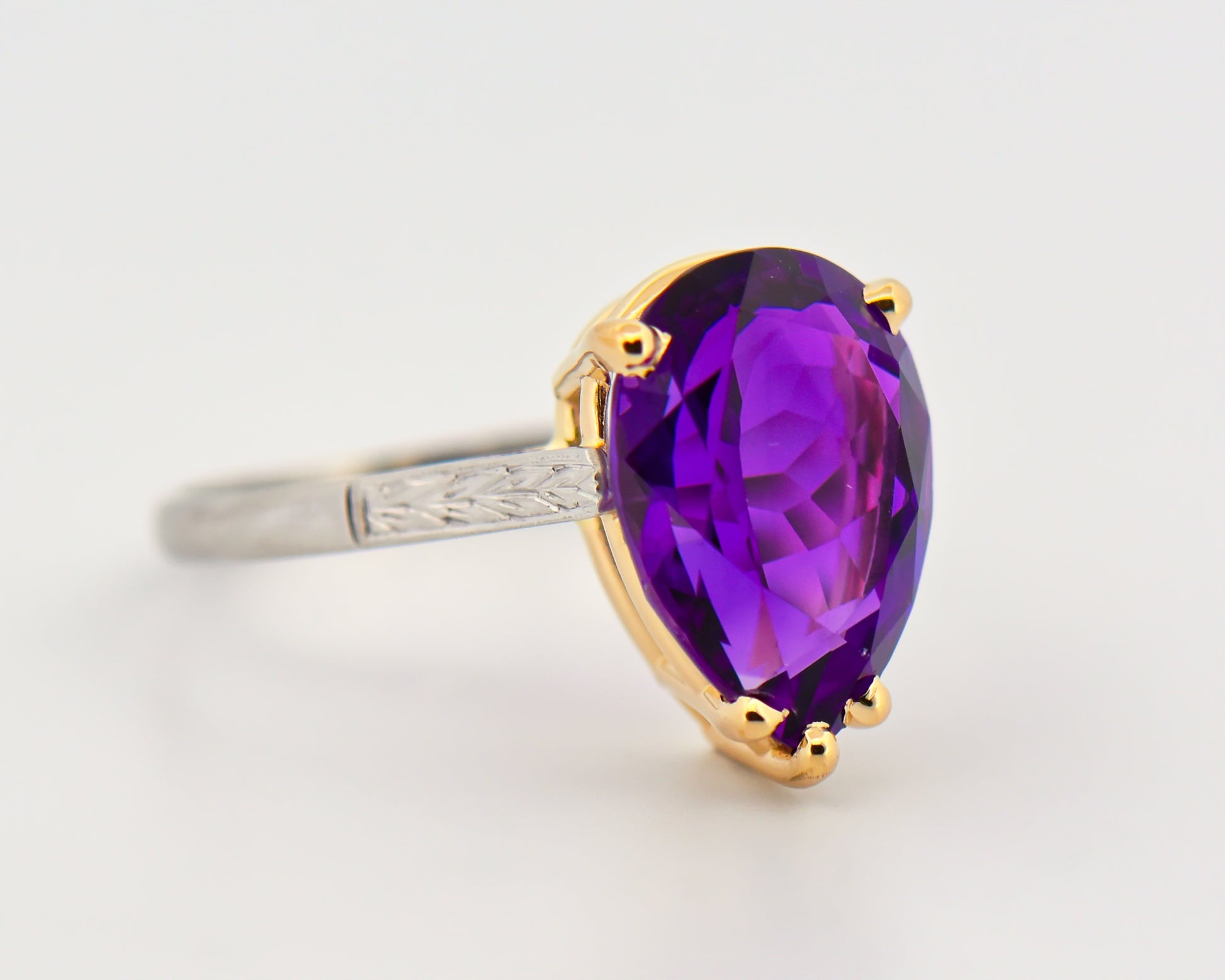 Details: Antique solitaire ring in 900 platinum with 14k yellow gold prongs, set with one 4.20ct pear-shaped natural amethyst; ring circa 1930s.