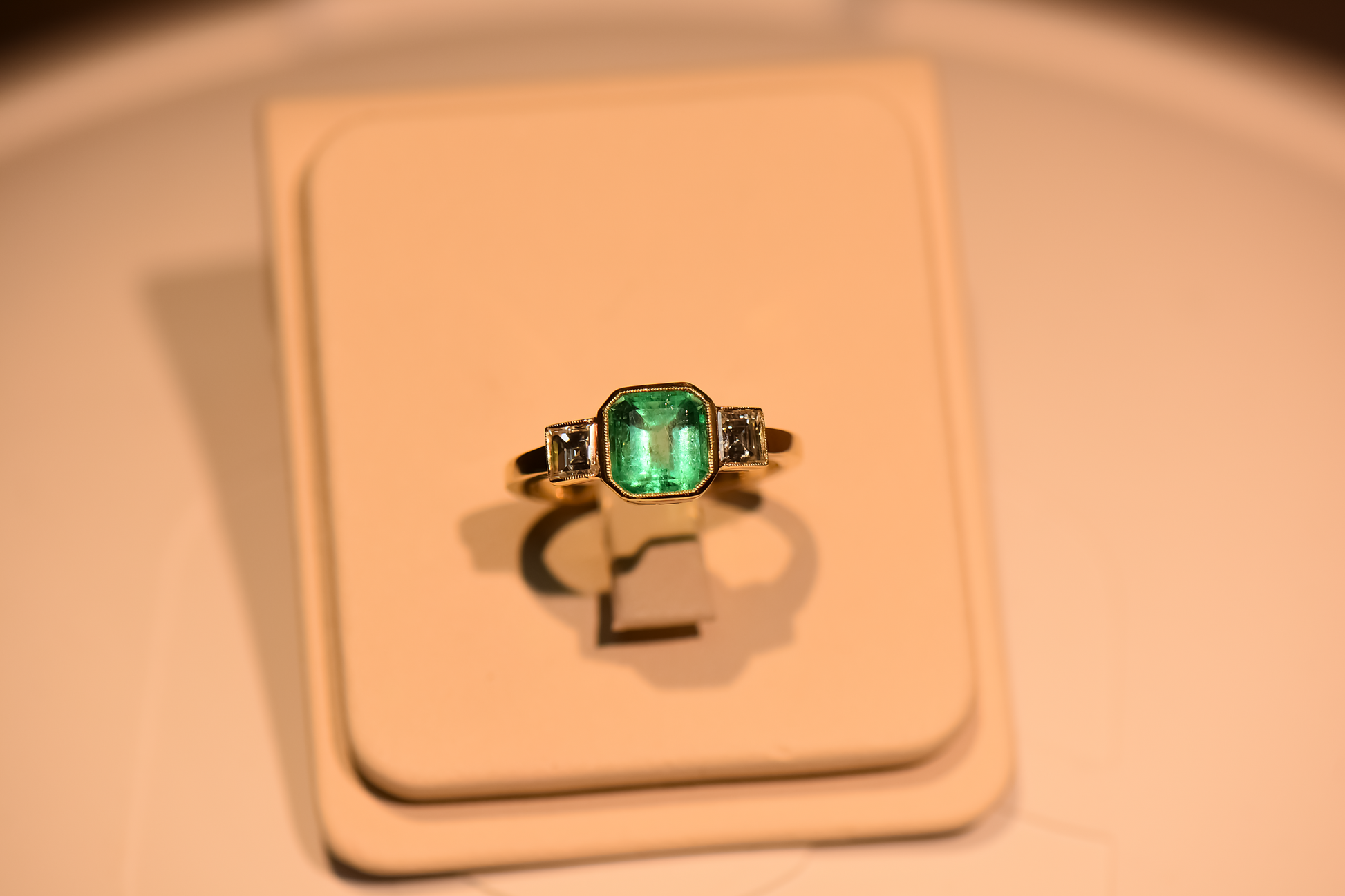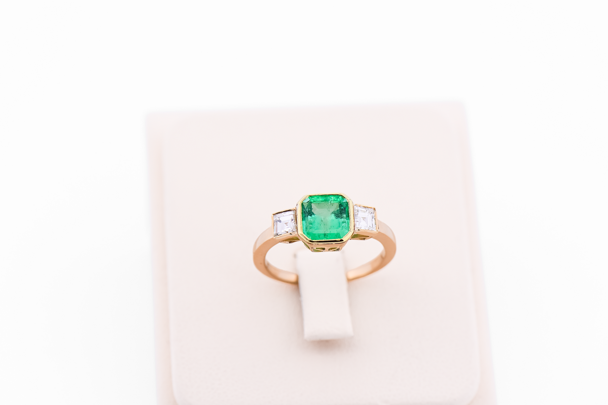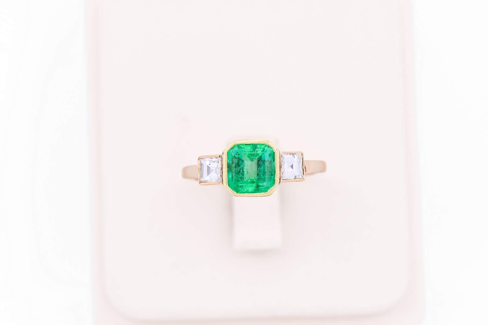 Flanking the center stone are carré-cut diamonds, their crisp, geometric lines providing a refined contrast to the emerald’s lush color. The balanced three-stone composition creates a harmonious silhouette, blending bold color with understated brilliance.