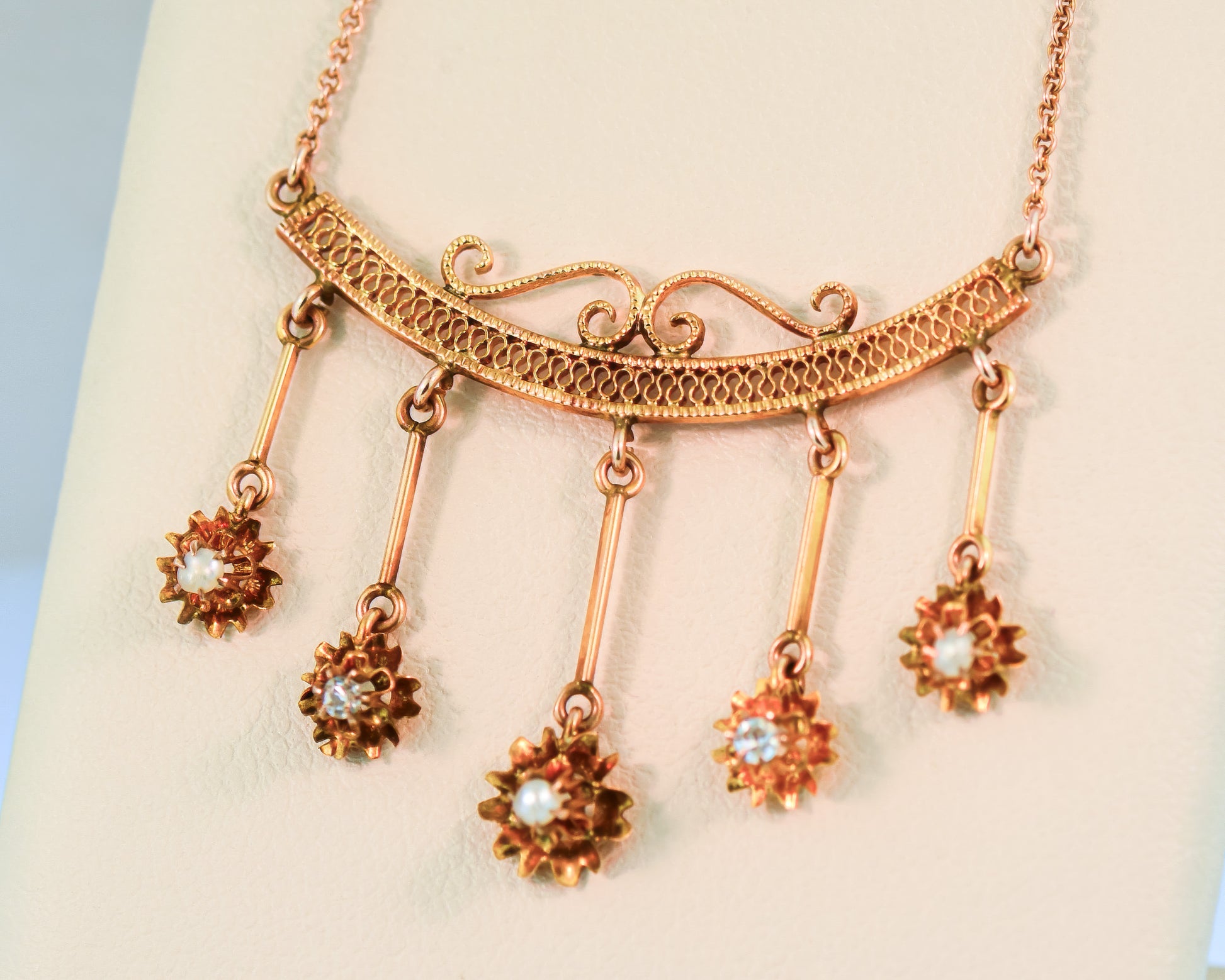 Antique Diamond and Pearl Buttercup Fringe Necklace