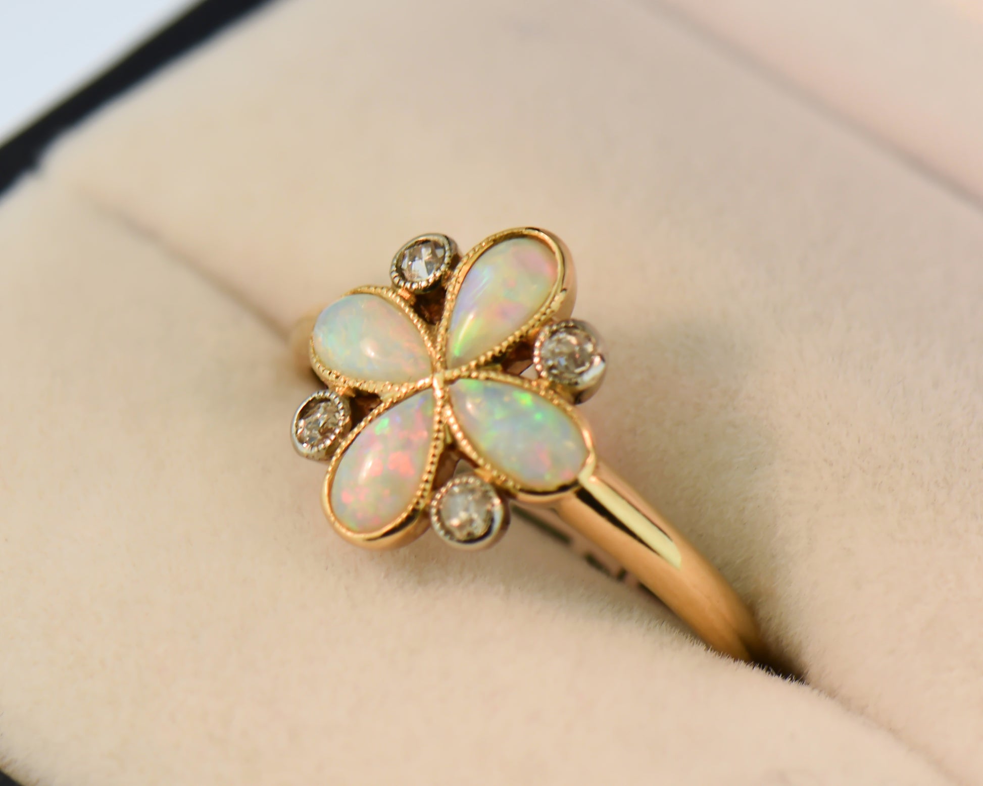 This gorgeous Edwardian ring showcases a quatrefoil design featuring natural opals arranged in a stylized four-leaf clover motif. While it may not possess the intricate details of later Art Deco pieces, jewelers of the Edwardian and Art Nouveau periods, around 1910, brought a level of finesse to their craft that is unmatched by many other eras.