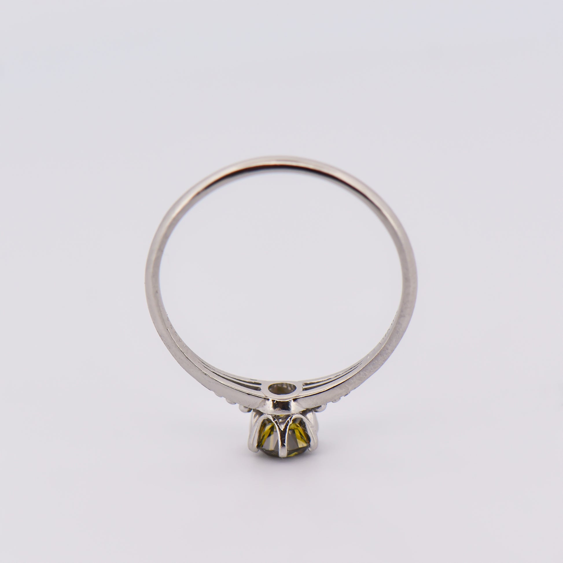 Details: Size 8 antique platinum solitaire engagement ring set with a 0.54ct round natural diamond, GIA certified as untreated “fancy deep green-yellow” color, circa 1910.