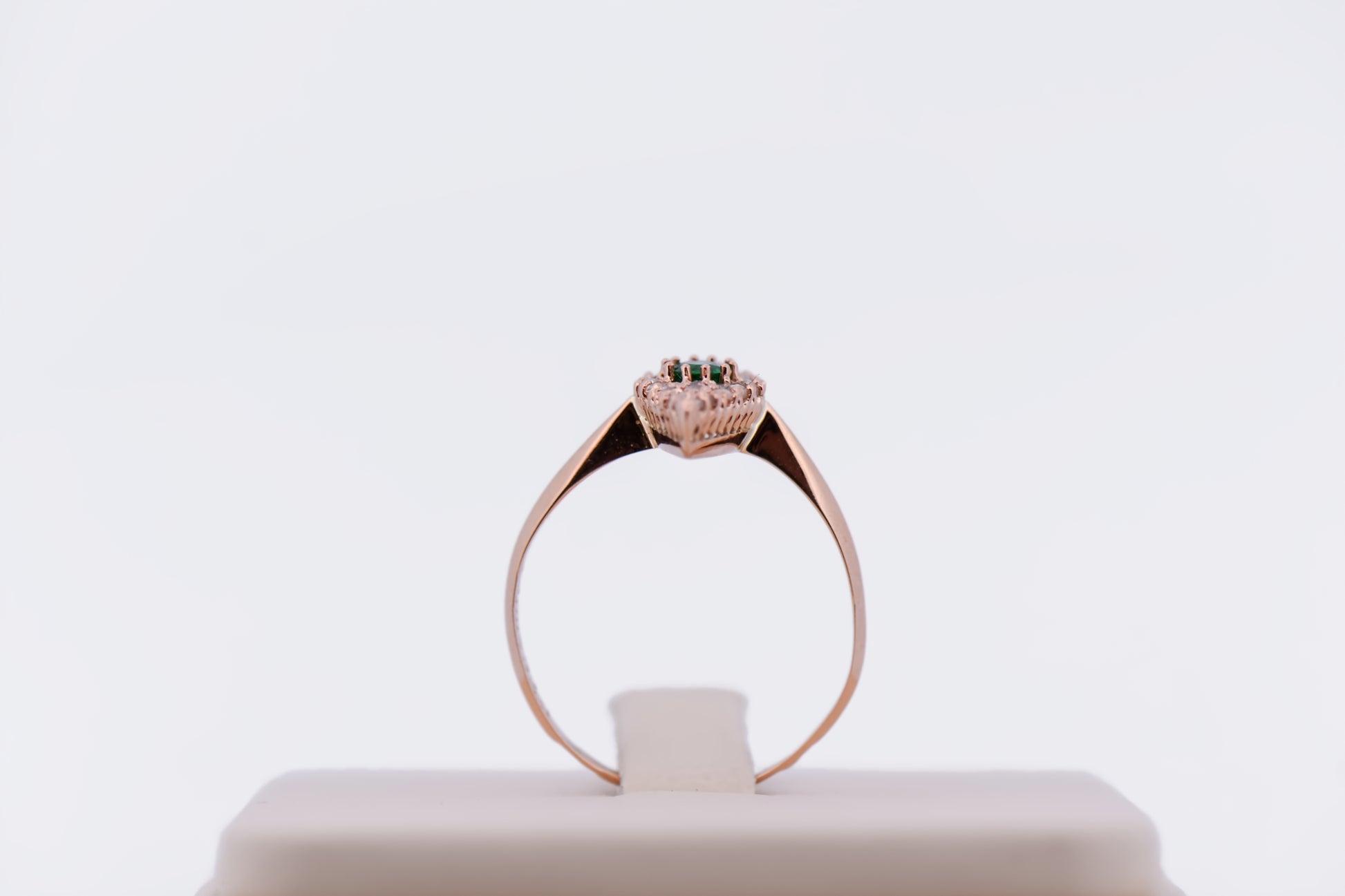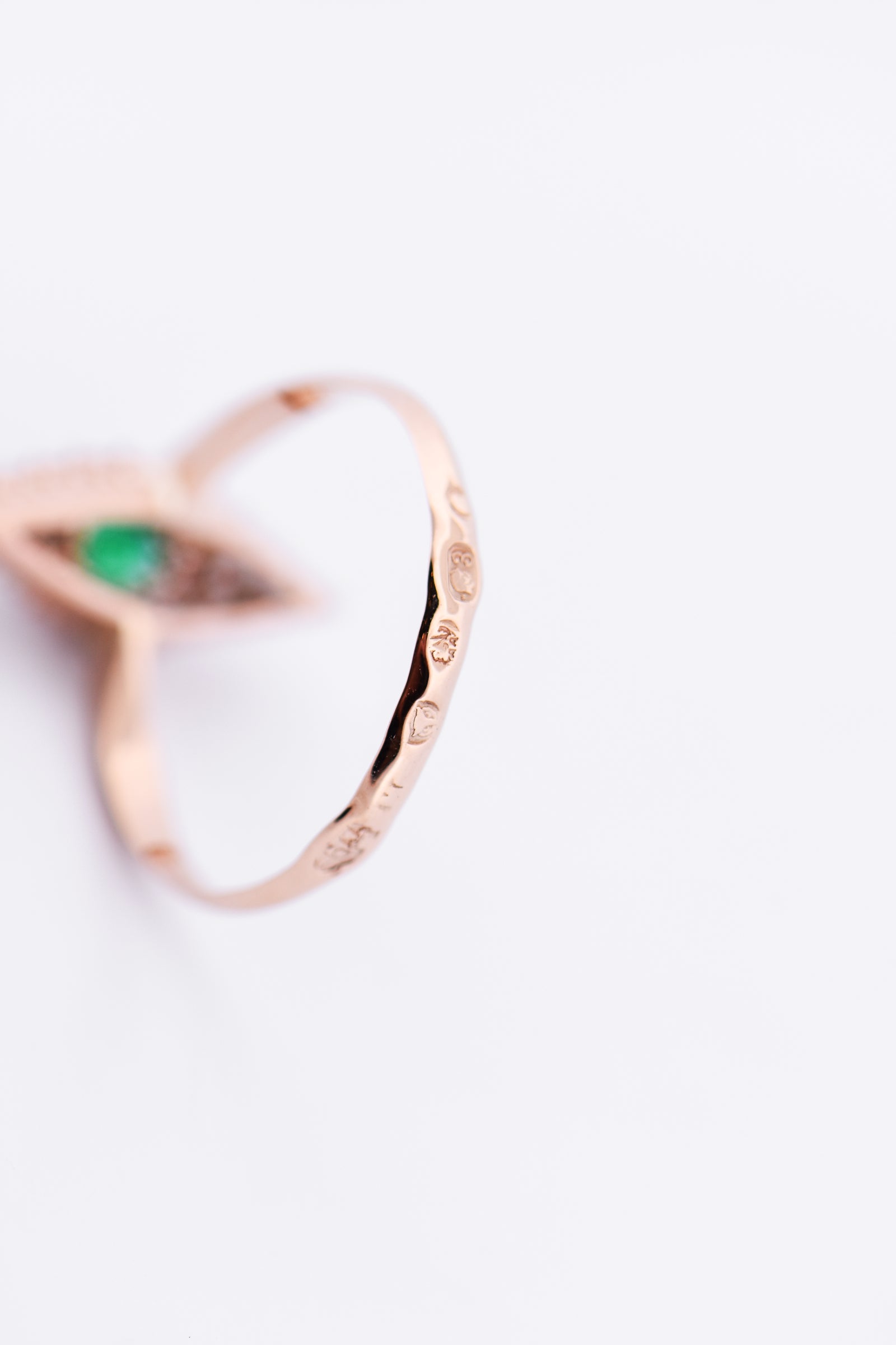 Antique Russian Red Gold Navette Ring with Emerald & Rose Cut Diamonds