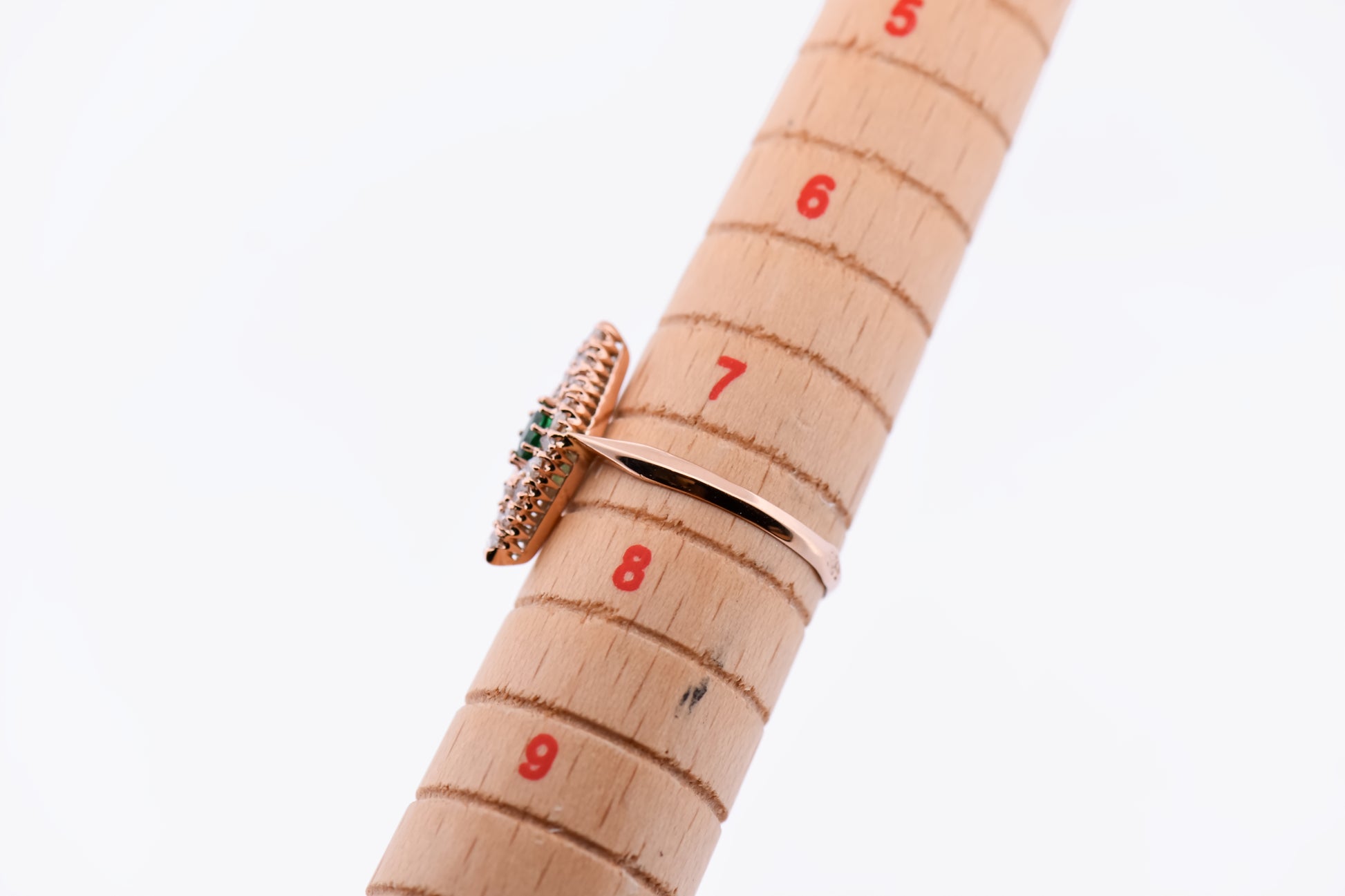At the center rests a vivid, deep green emerald, full of life and character. Surrounding it is an elegant array of old-cut and rose-cut diamonds, each one carefully placed to enhance the ring's distinctive navette shape. The combination of rich red gold, antique diamond cuts, and the emerald's jewel-tone vibrance gives this piece a romantic, unmistakably historic presence.