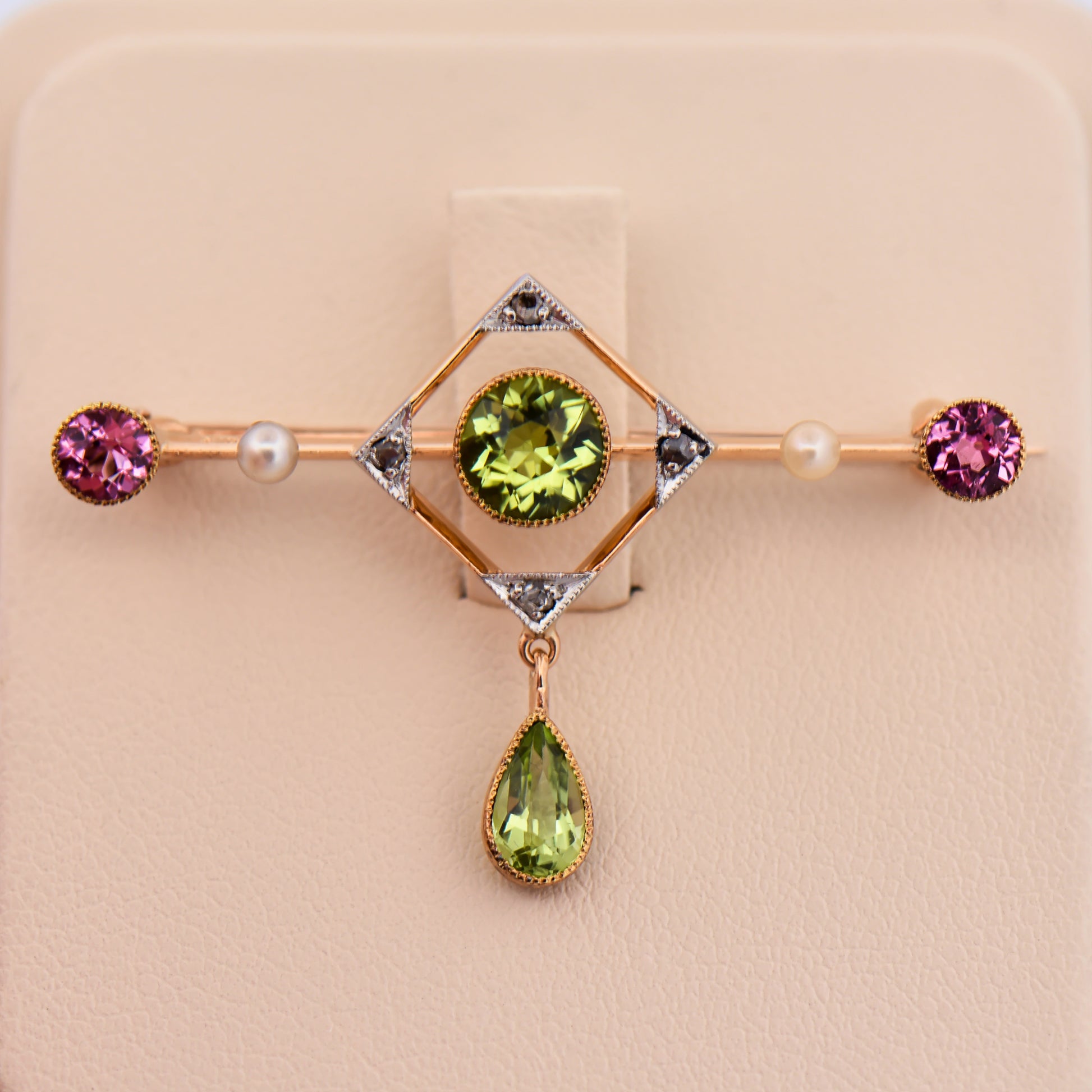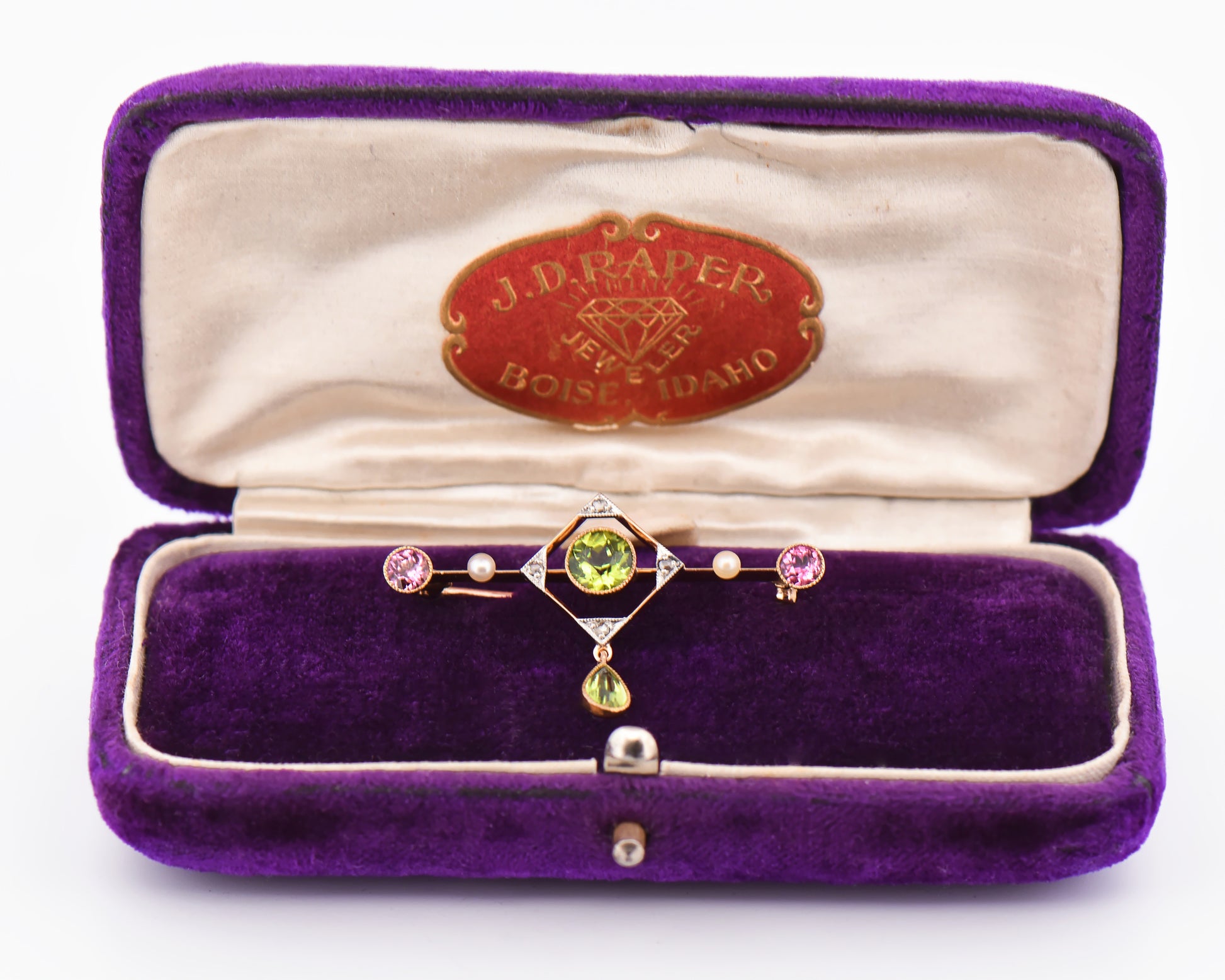 Details: Antique suffragette brooch, circa 1905. Crafted in 15k yellow gold and platinum, featuring peridot, pink tourmaline, old-cut diamonds, and natural seed pearls. British origin. Approx. 1.5 carats total gemstone weight.