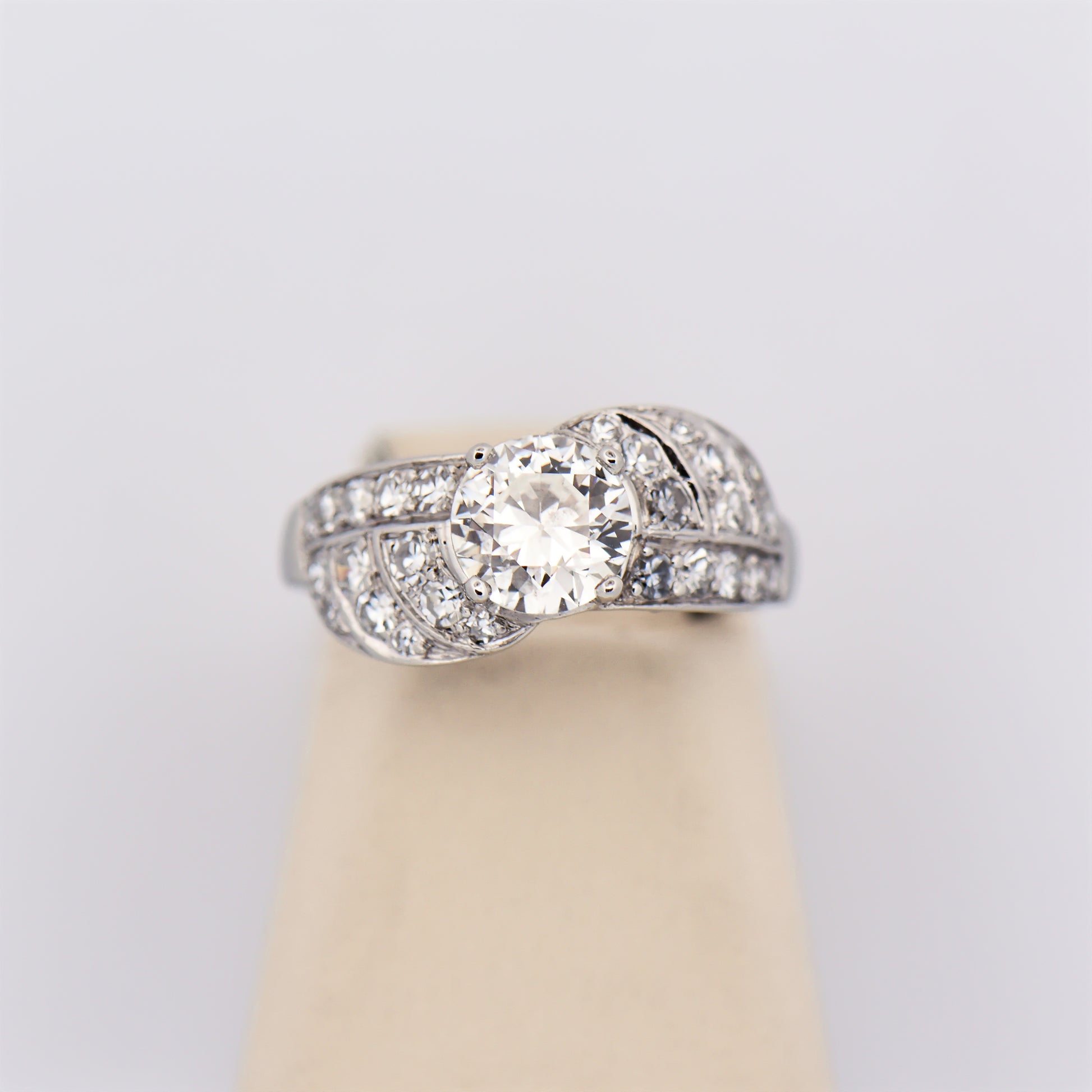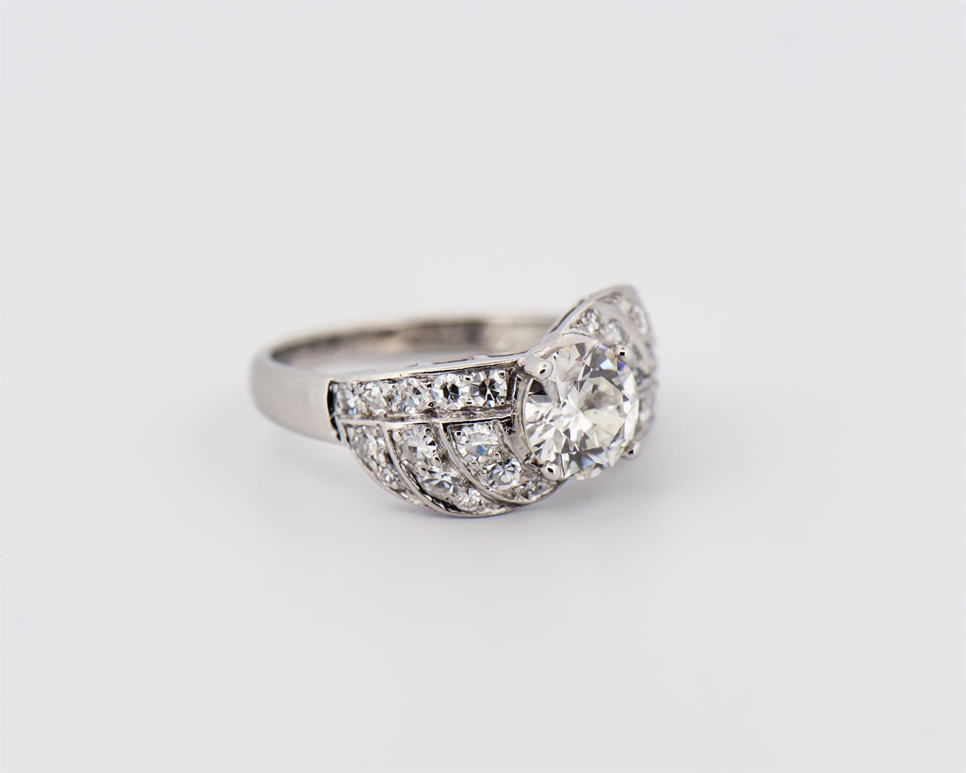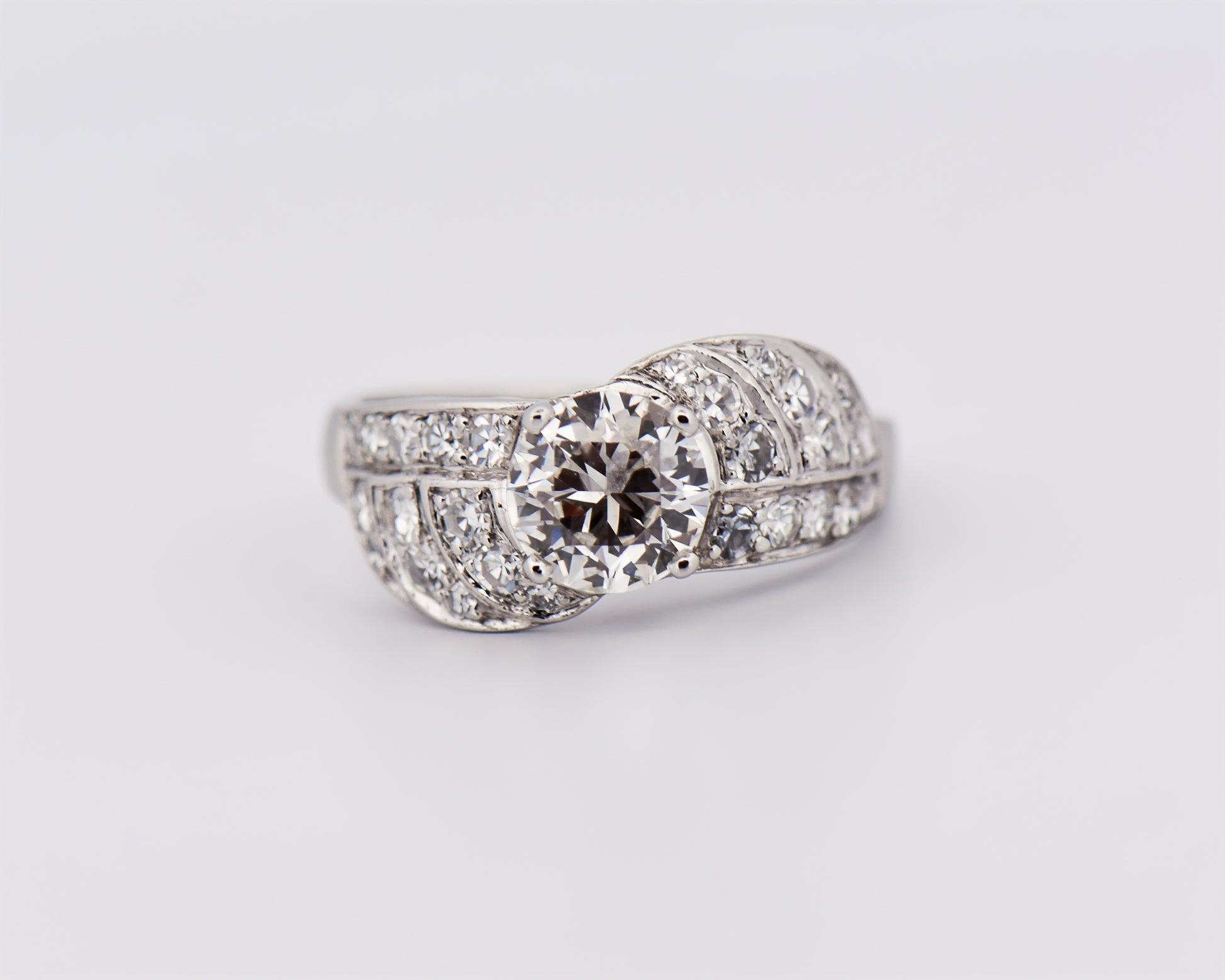 Details: Art Deco diamond engagement ring in platinum featuring 1.03ct European-cut center diamond (SI1 clarity, I color) with approx. 0.78ctw accent diamonds (SI–I1 clarity, G–H color); estate piece, circa 1930.