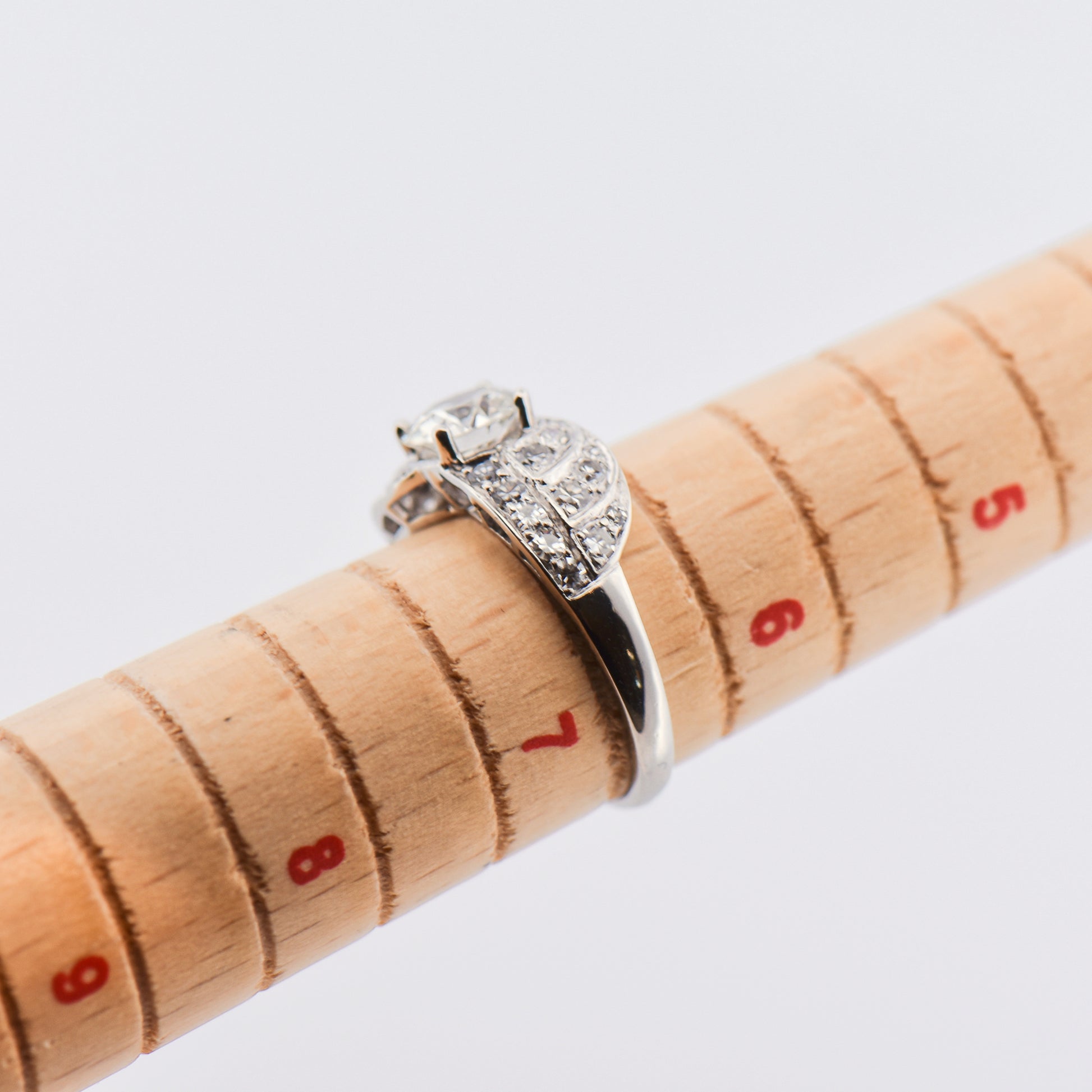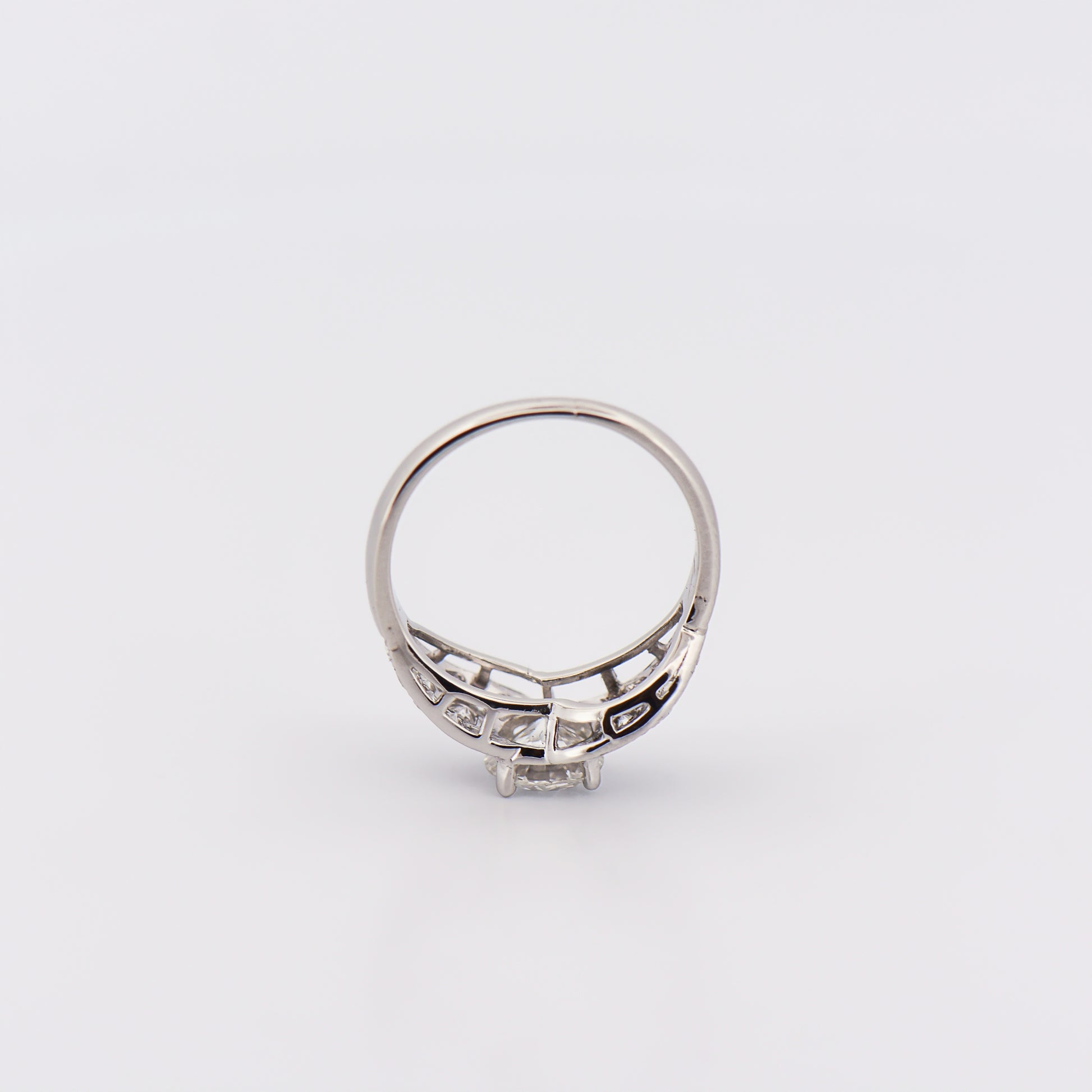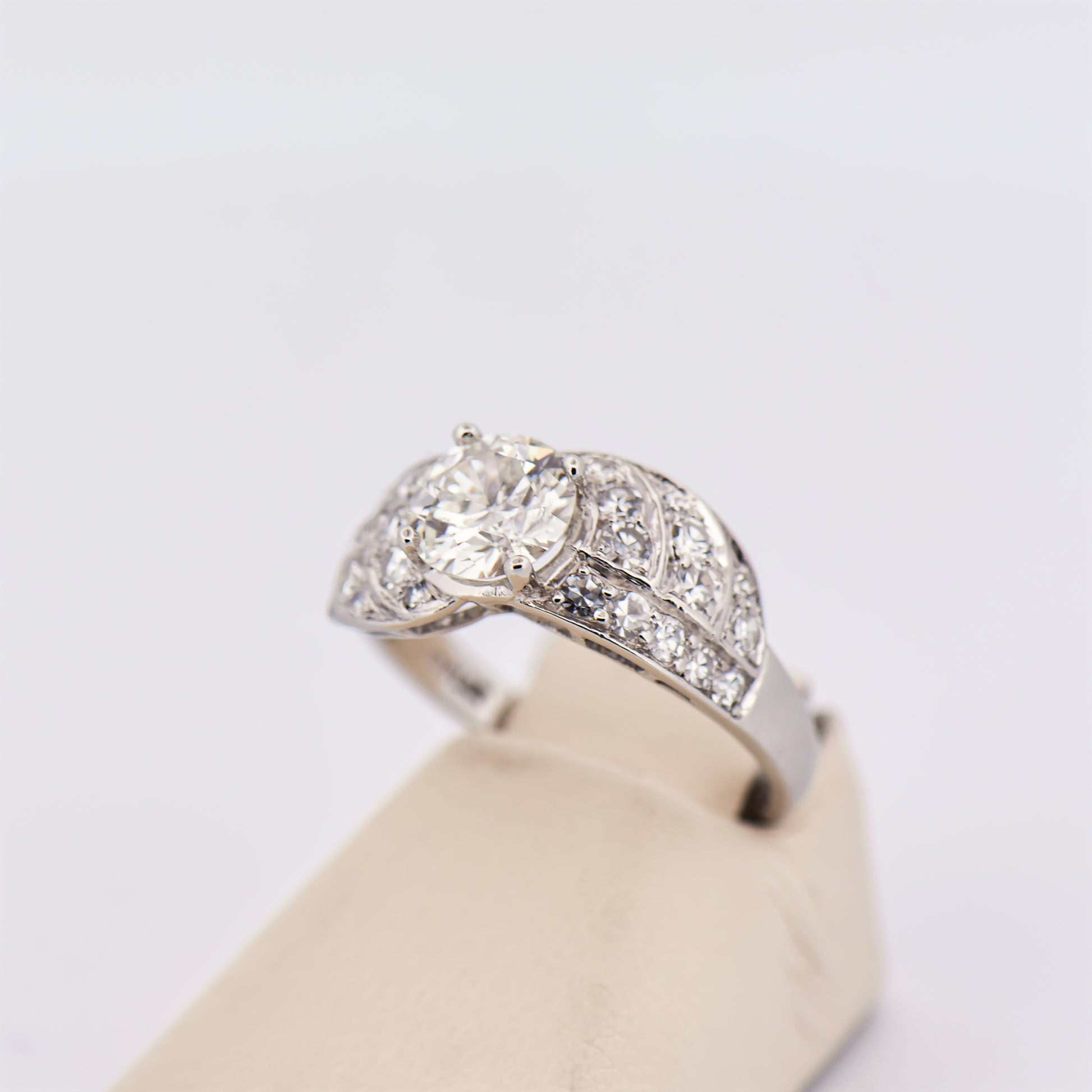 Details: Art Deco diamond engagement ring in platinum featuring 1.03ct European-cut center diamond (SI1 clarity, I color) with approx. 0.78ctw accent diamonds (SI–I1 clarity, G–H color); estate piece, circa 1930.