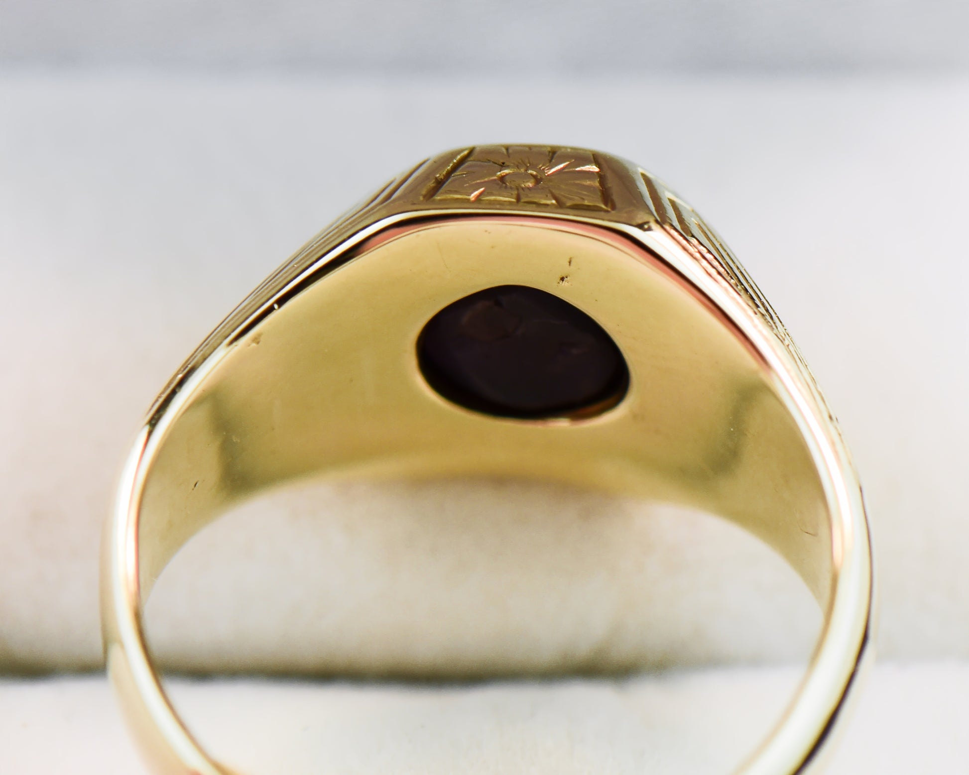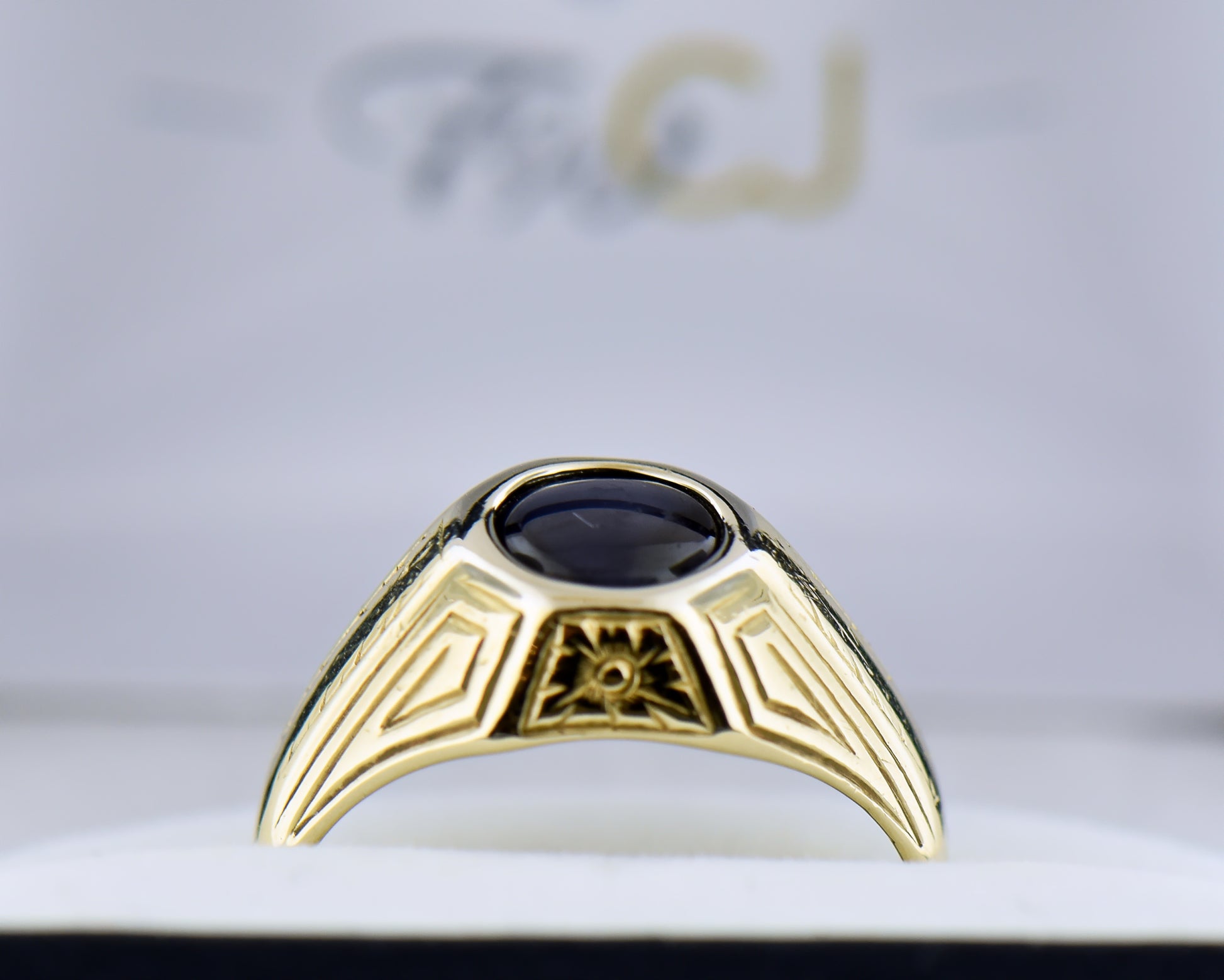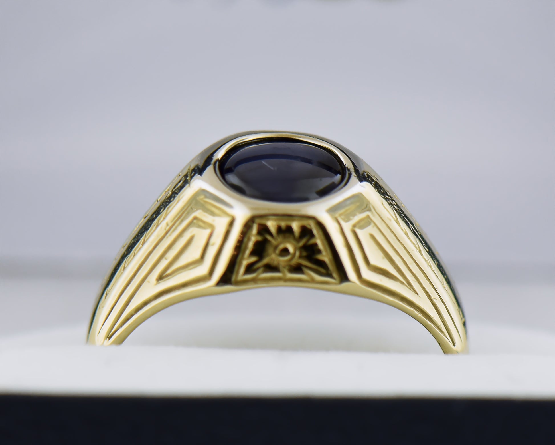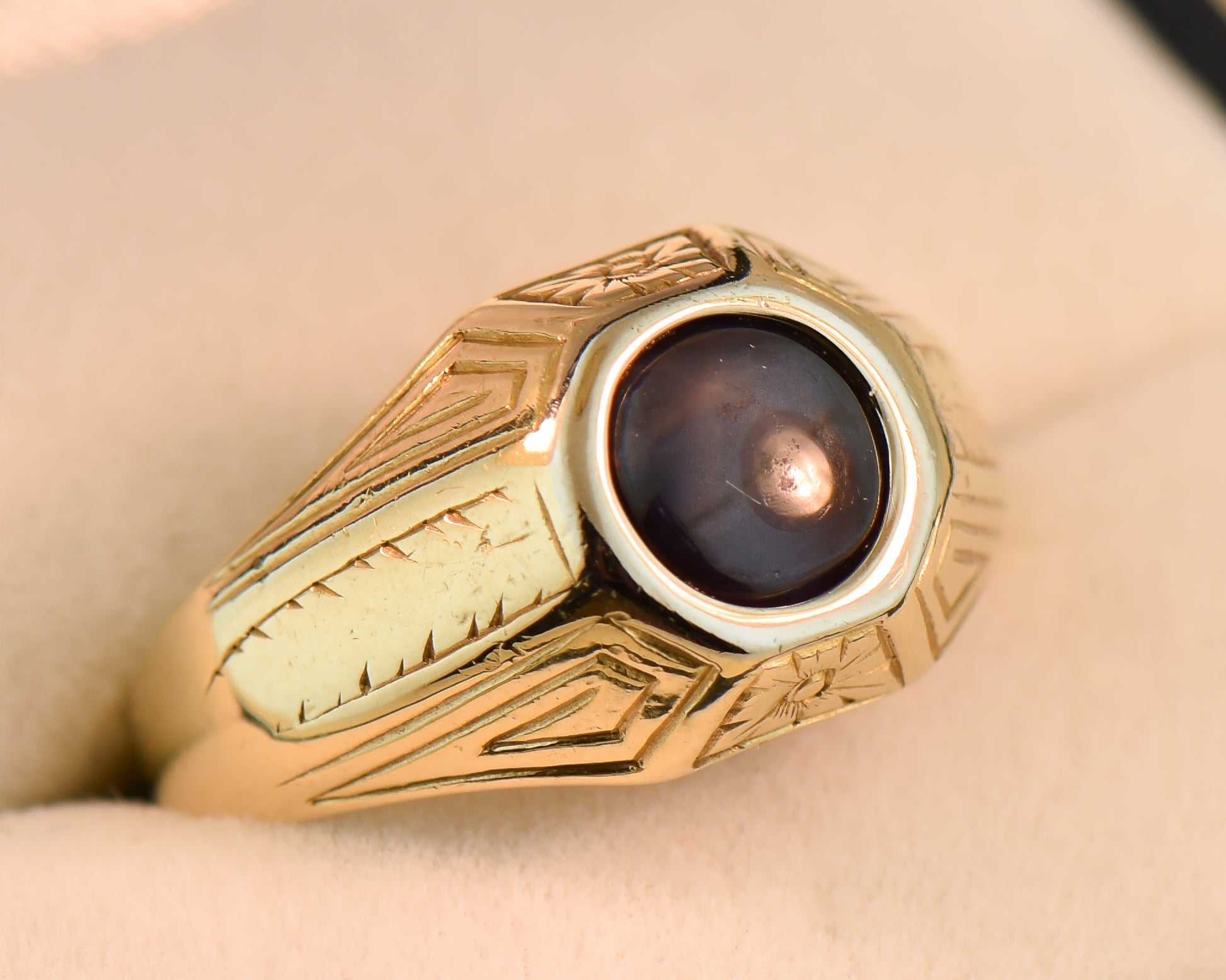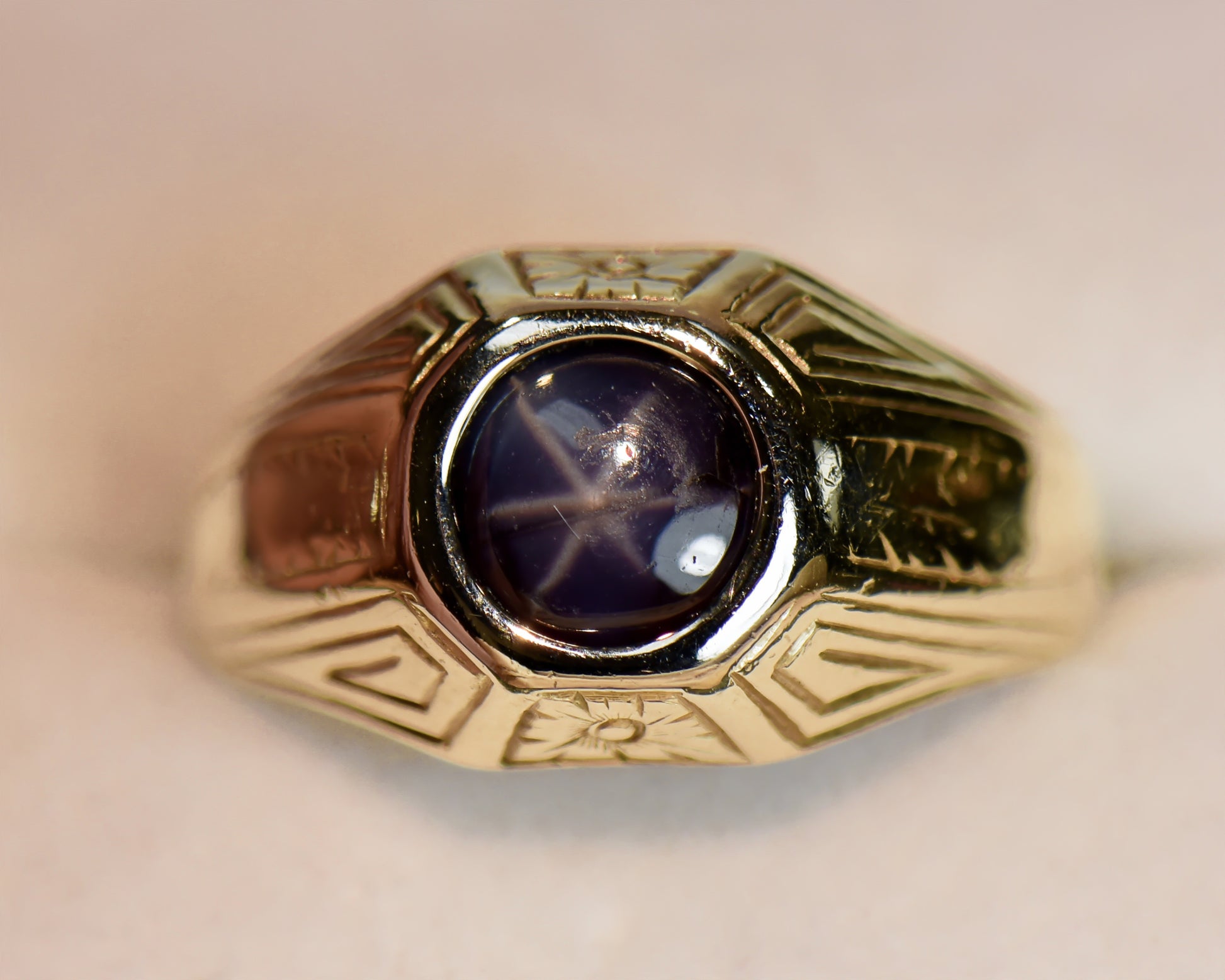 Celestial beauty meets geometric design in this Art Deco star spinel ring, a striking example of 1930s craftsmanship that captures the era's fascination with bold geometry and rare gems. At its center rests a 1.75-carat navy blue star spinel, displaying a natural asterism that shimmers across the surface like starlight as it catches the light. The bold gem is framed by a 14k yellow gold band, detailed with angular engravings that reflect the clean lines and artistry of the Art Deco period.