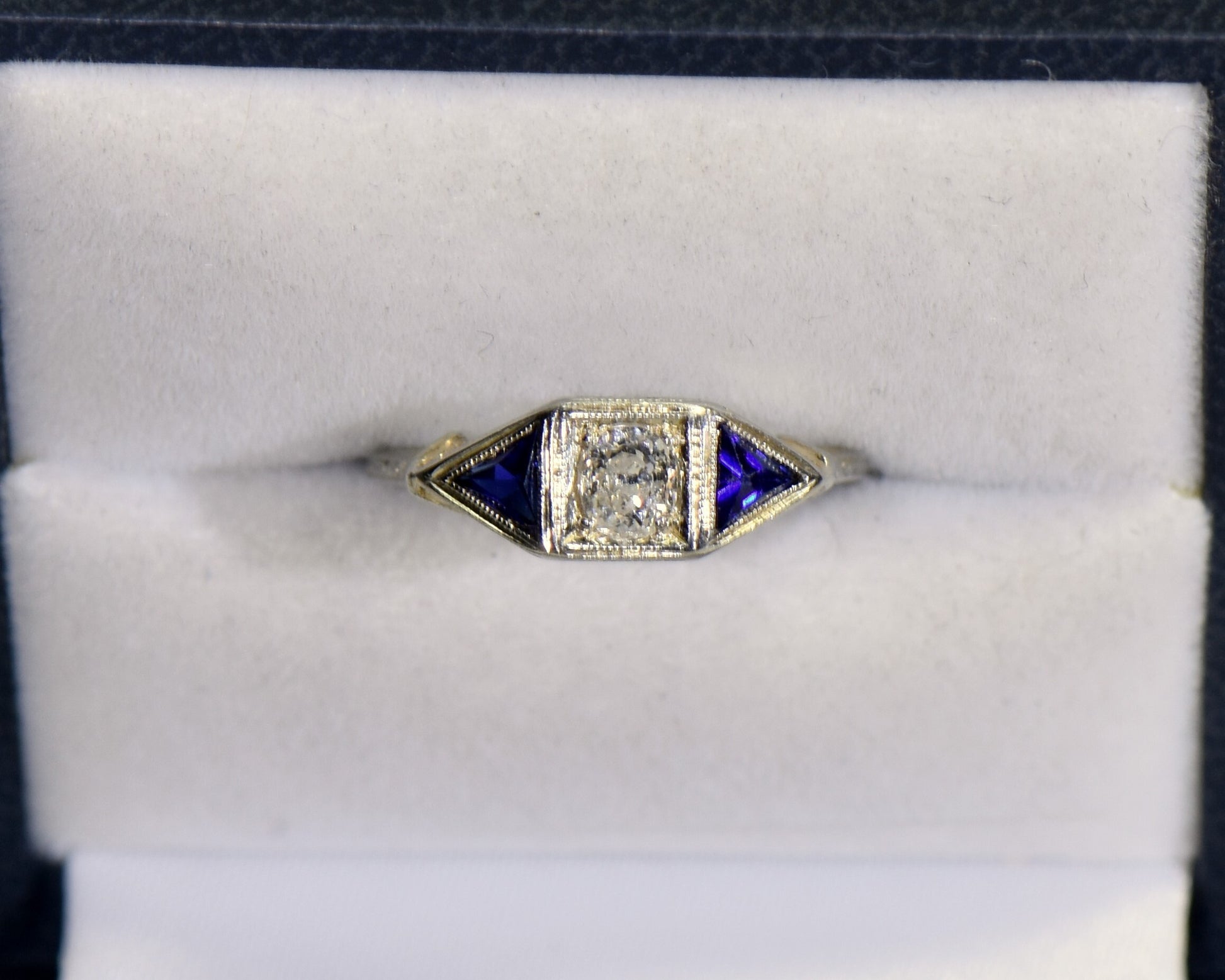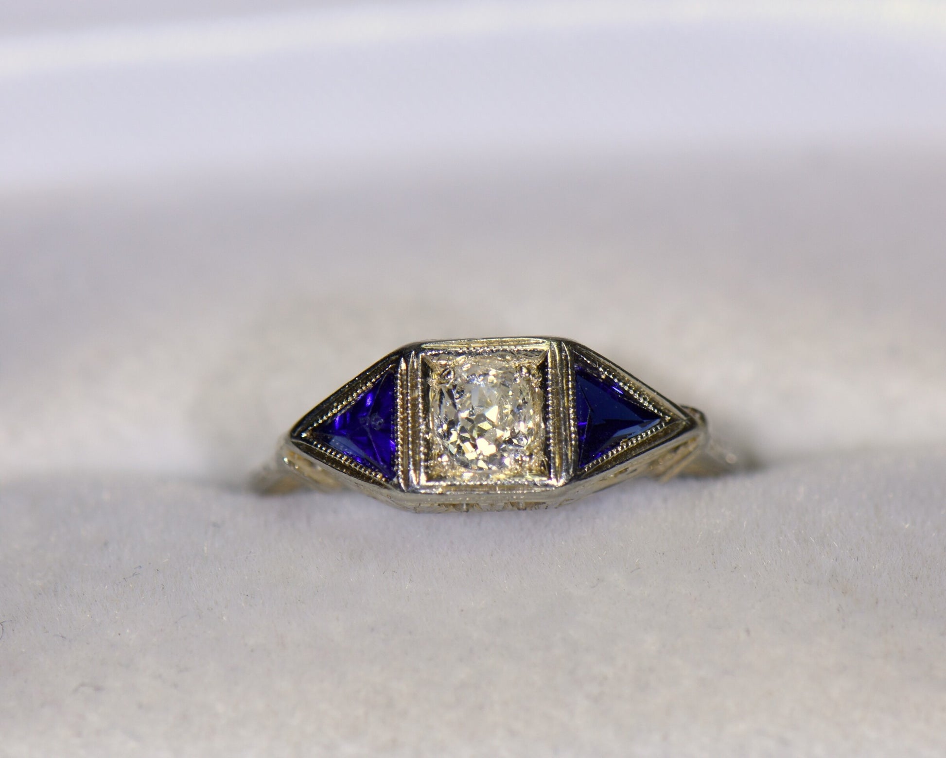 Details: Antique 18k white gold engagement ring set with a .25ct old mine cut diamond (SI IJ) and .30ctw trilliant synthetic blue sapphire, made by "Belais" circa 1925.