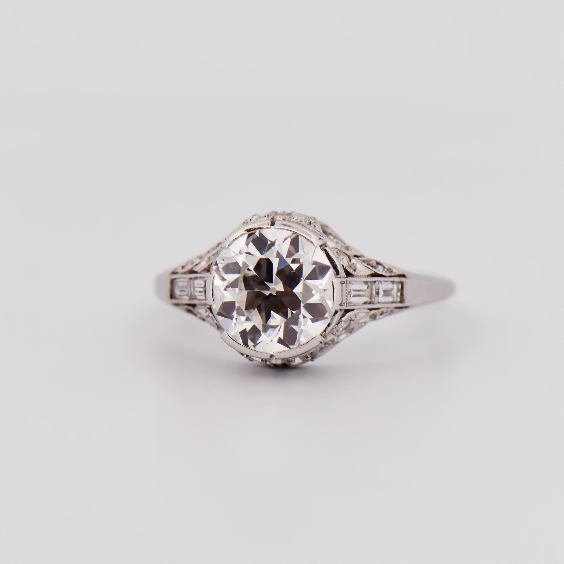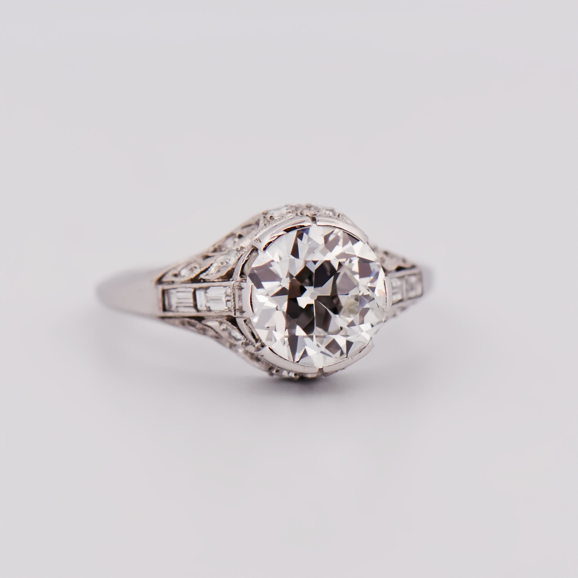Details: Art Deco ring in platinum featuring a 2.36ct Old European Cut diamond (VVS2, G color) accented by approximately 0.56ctw diamonds (VS clarity, F–G color); estate piece, circa 1920s; size 8.