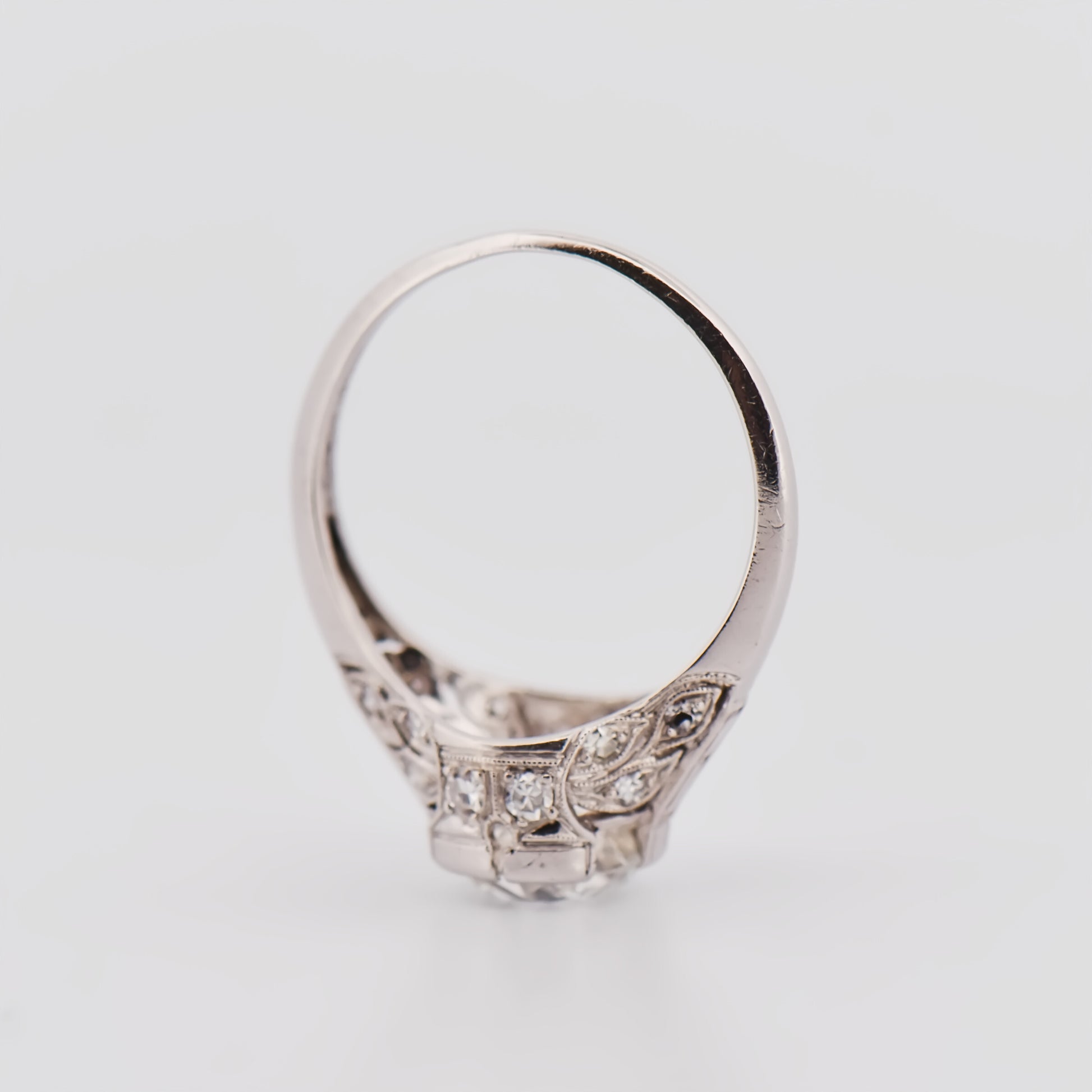 Timeless, glamorous, and full of character, this Art Deco old European cut diamond ring captures the sophistication and sparkle of a bygone era. Handcrafted in platinum, it features graceful filigree detailing and delicate accent diamonds that showcase the refined geometry and artistry of the 1920s.