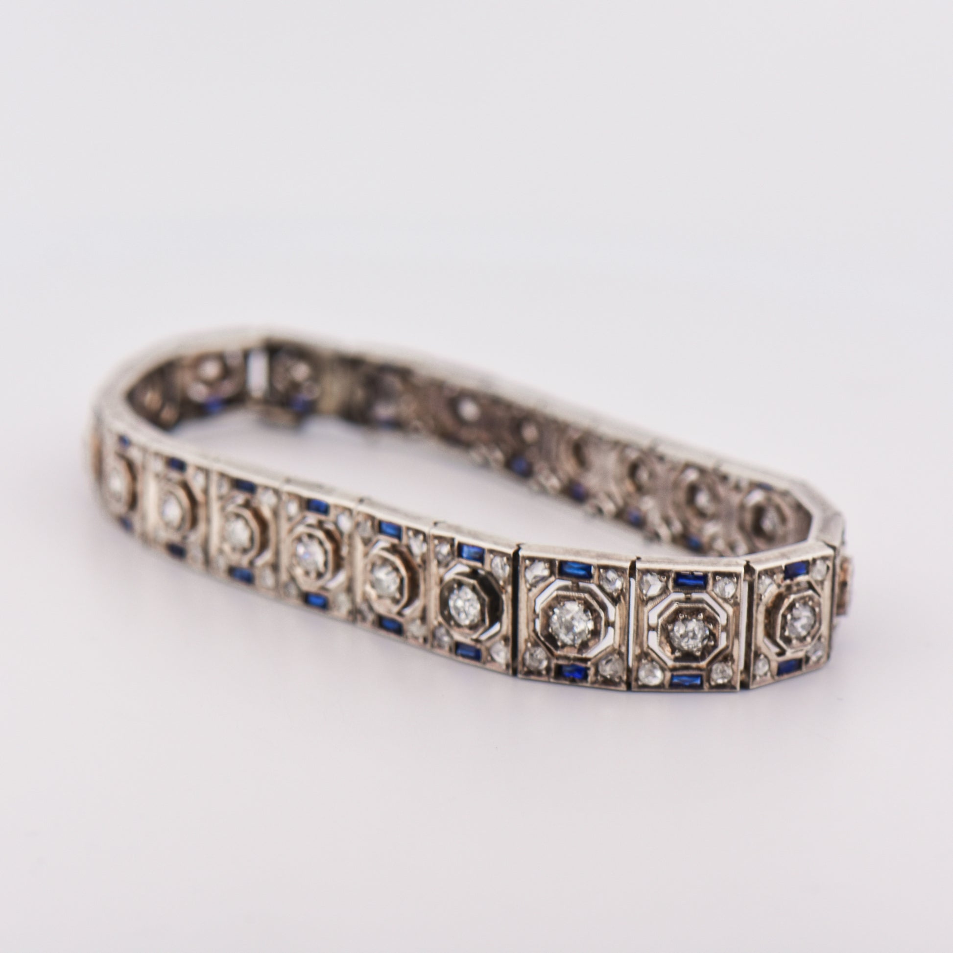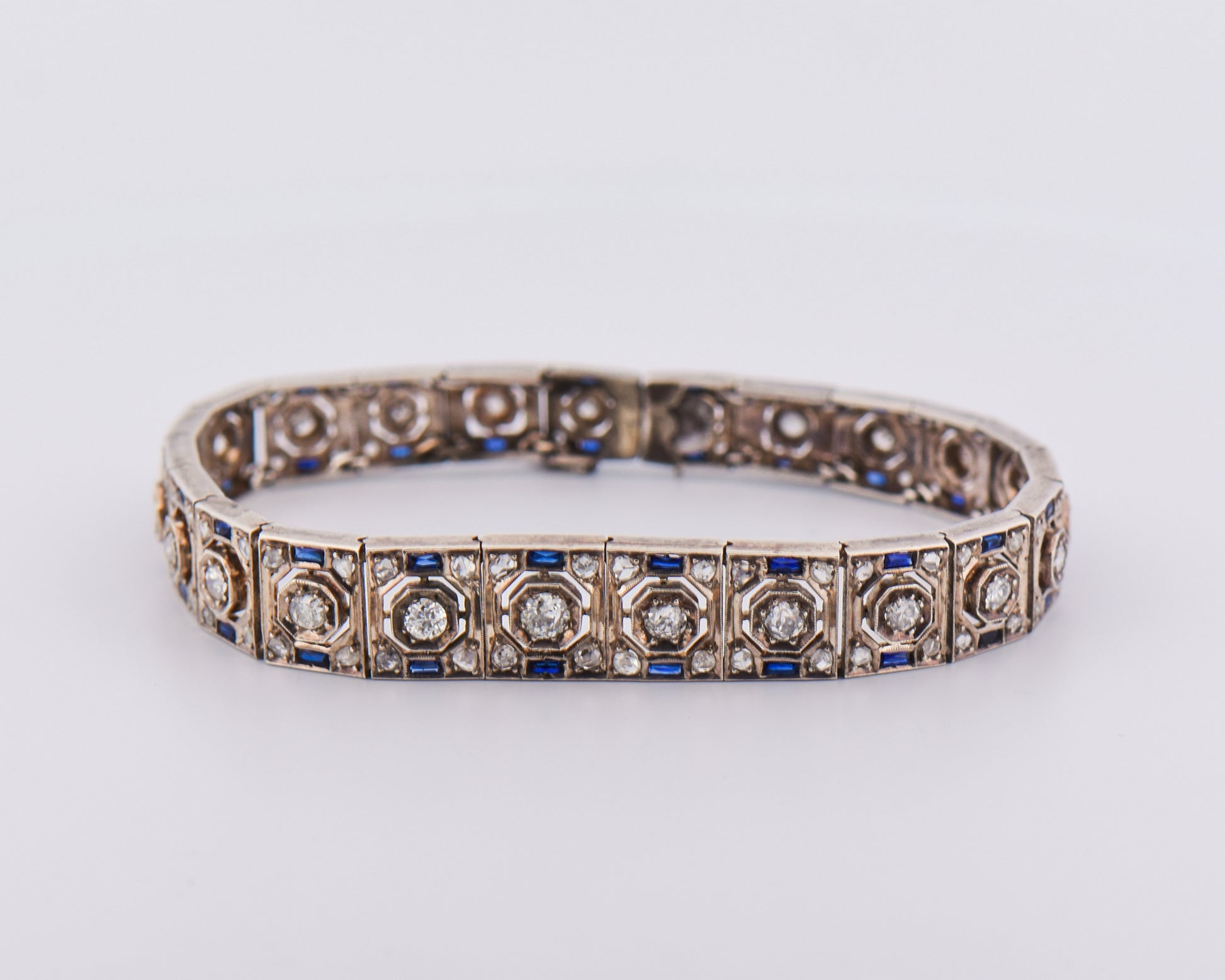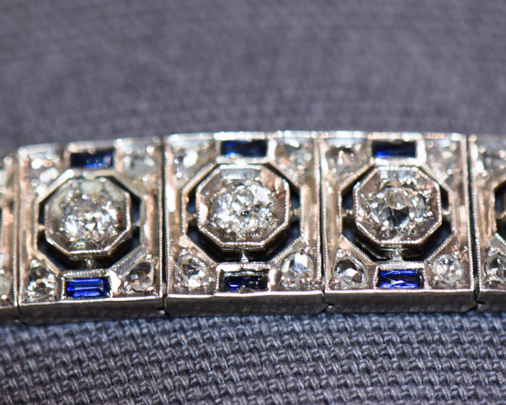 The contrast between the deep blue sapphires and the sparkling antique diamonds creates a look that feels both classic and distinctive. Whether worn for a formal occasion or cherished as an heirloom, this bracelet is a graceful nod to the golden age of glamour.