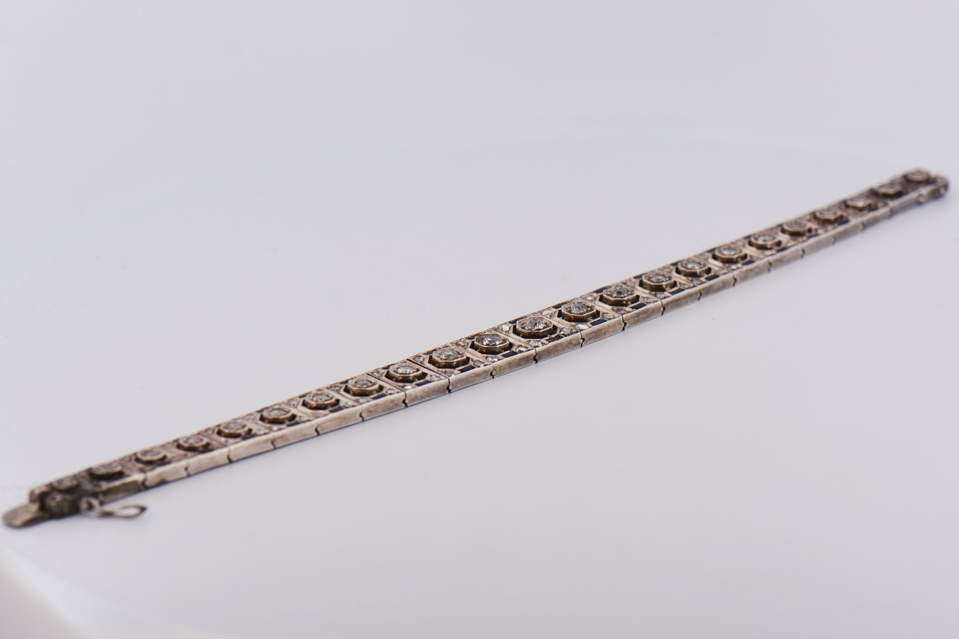 Timeless in its vintage allure, this Art Deco bracelet captures the elegance of the 1920s in every detail. Intricately crafted in 900 sterling silver, the design features 3.00 carats of old-cut diamonds and 2.00 carats of synthetic sapphires, arranged in a geometric panel motif that reflects the bold aesthetic of the era.