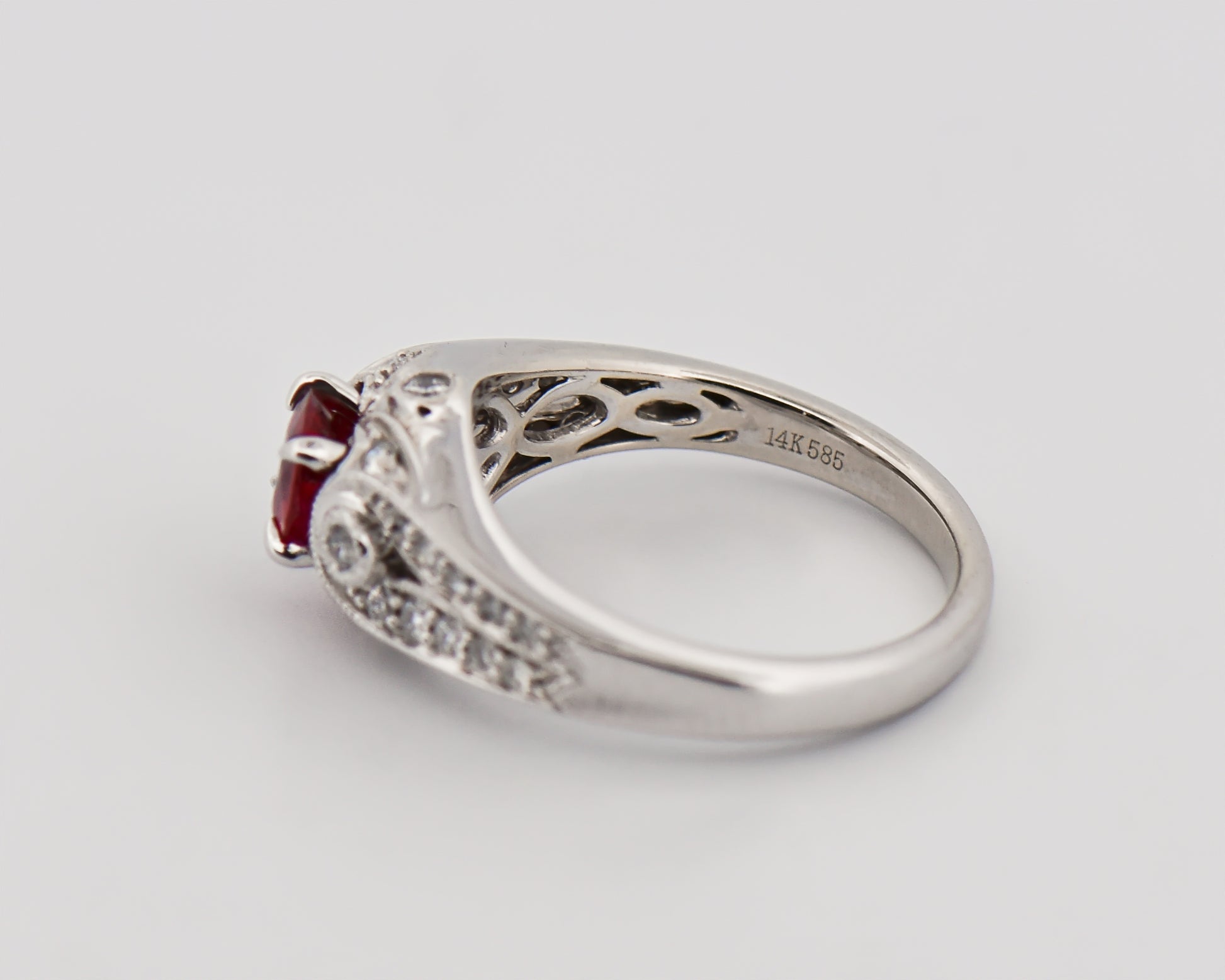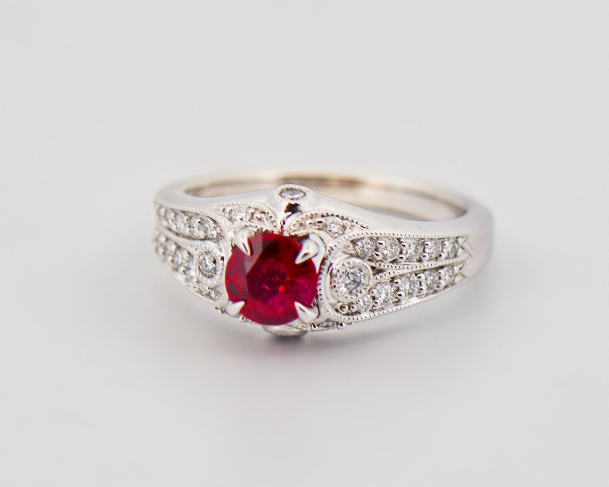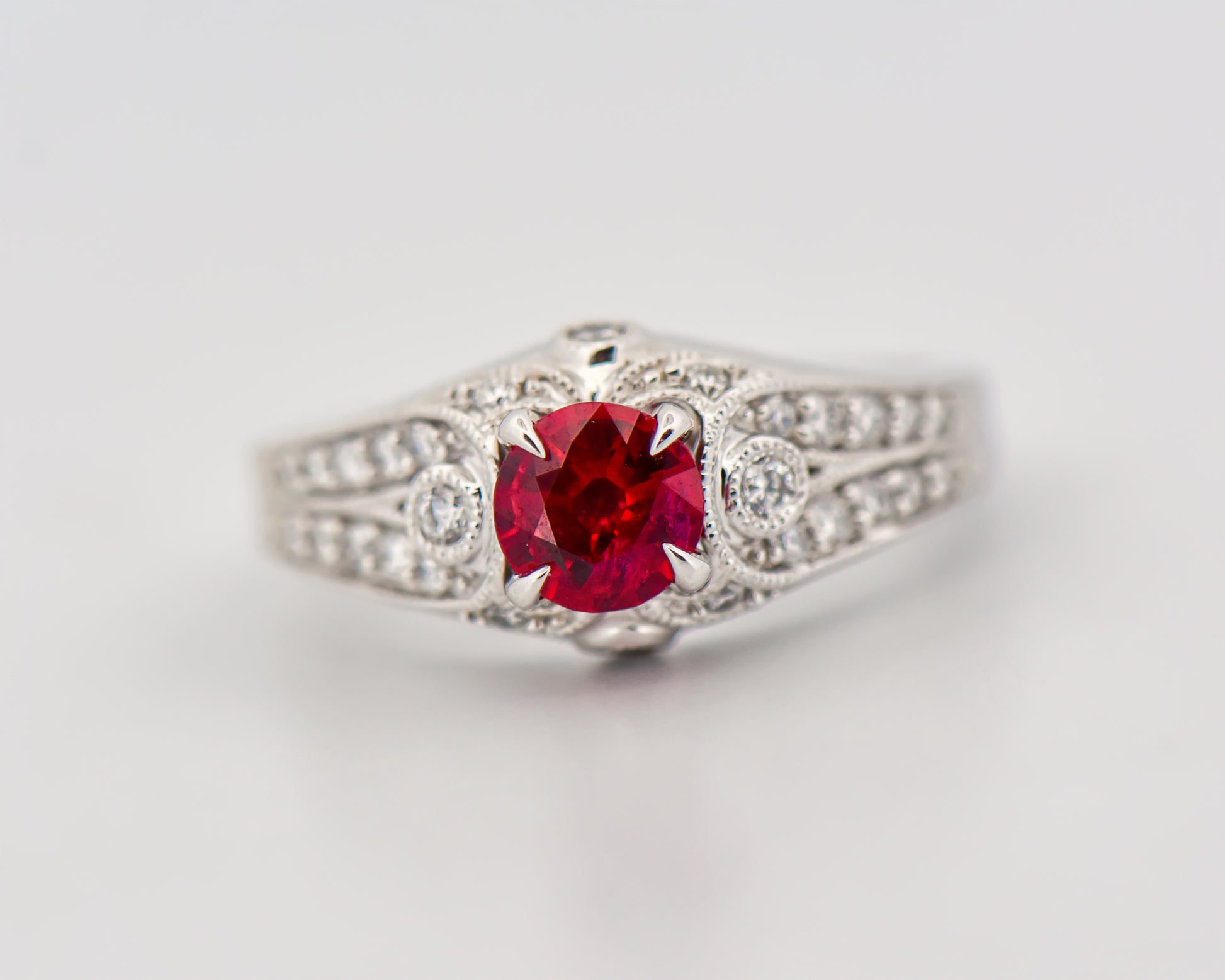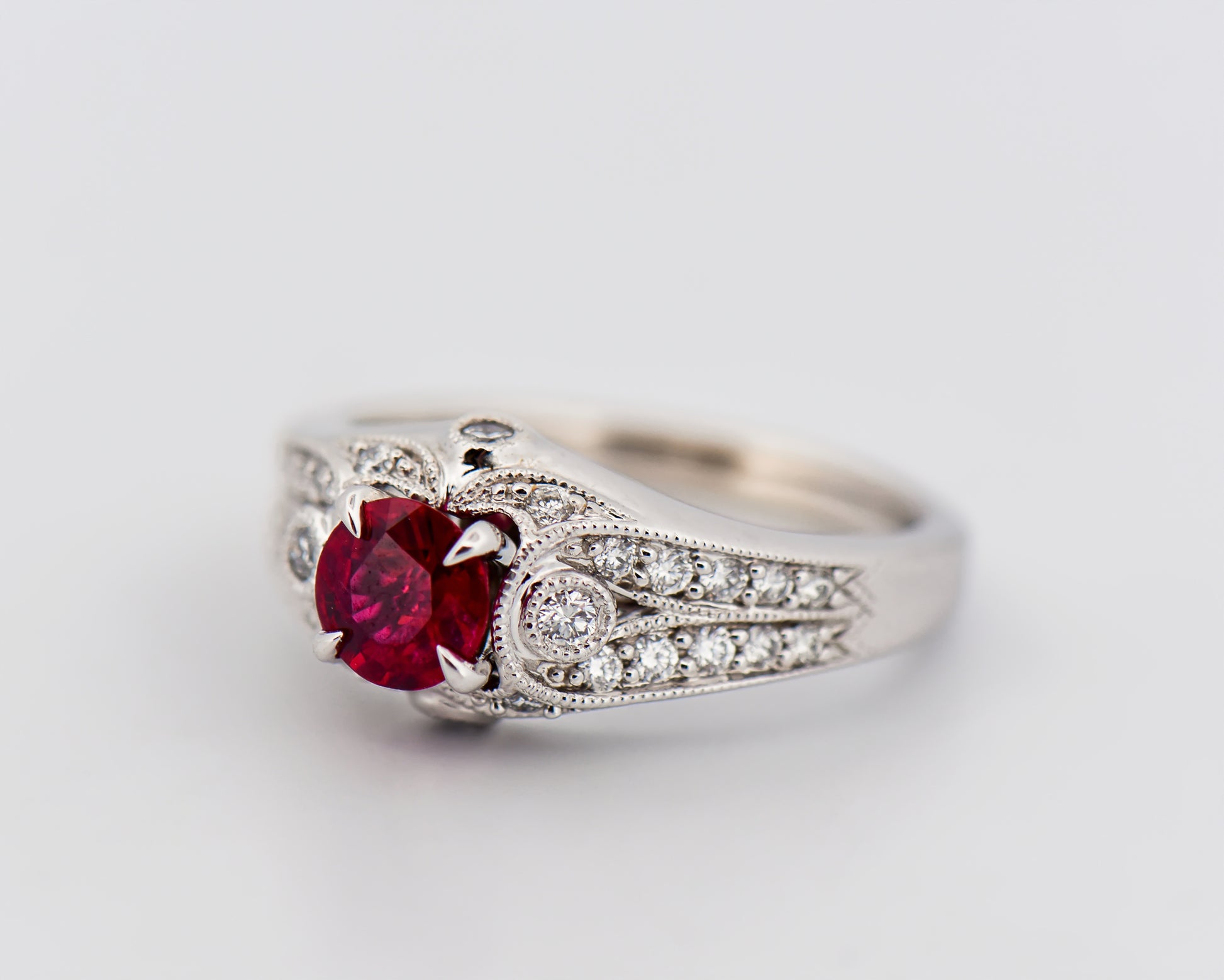 Details: Custom vintage-style ring in 14k white gold, featuring a natural .70ct ruby (5mm round, Burmese, heat-treated) and .33ctw natural diamond accents (VS, GH). Complimentary lab paperwork accompanies this ring.