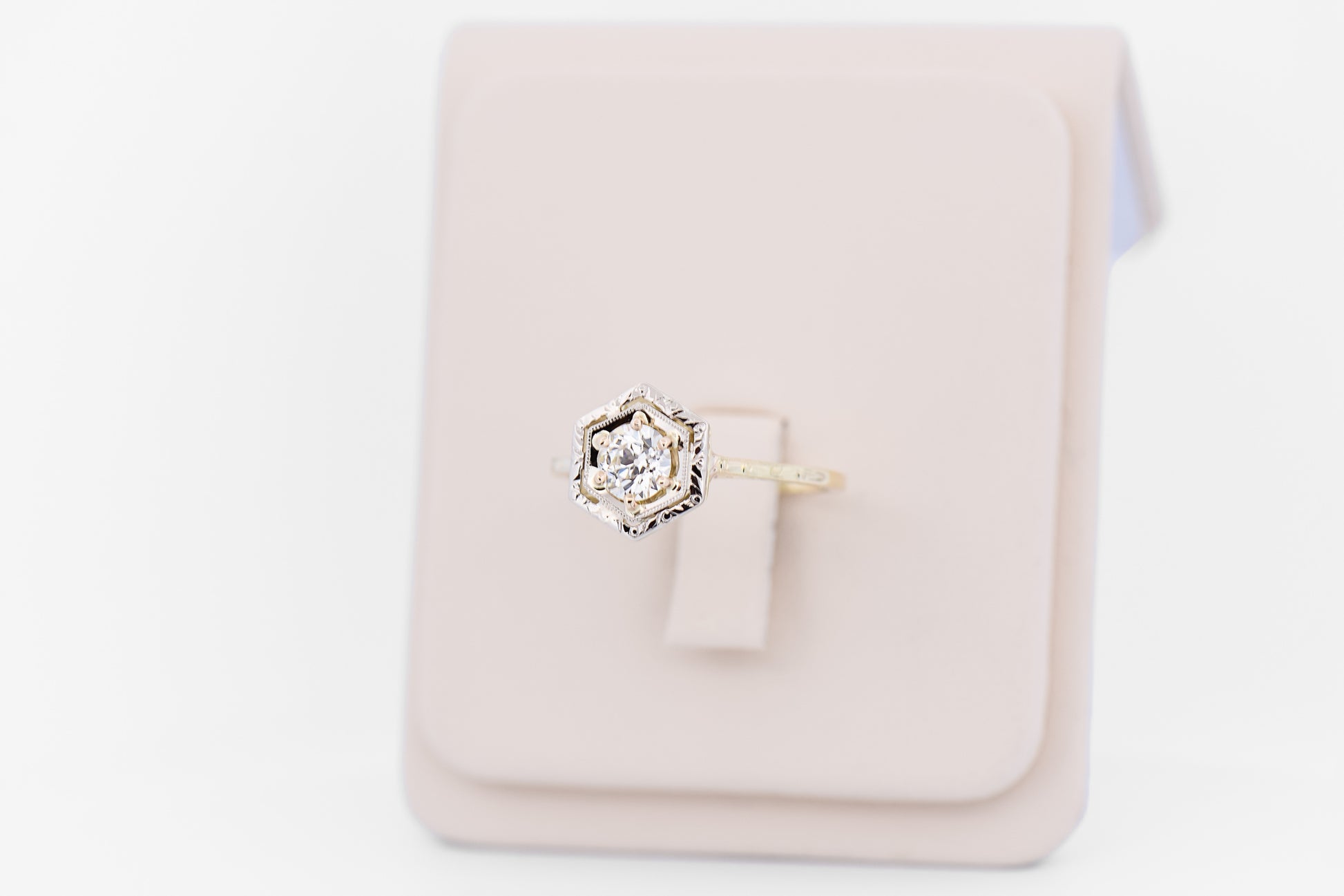 Details: Art Deco hexagon ring crafted in 14k two-tone gold featuring a 0.62ct old European cut diamond (VS2 clarity, J–K color); carved shoulder details; circa 1925, size 8.5.