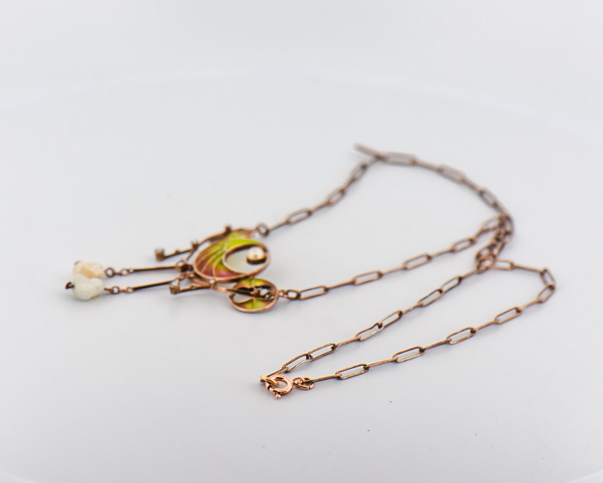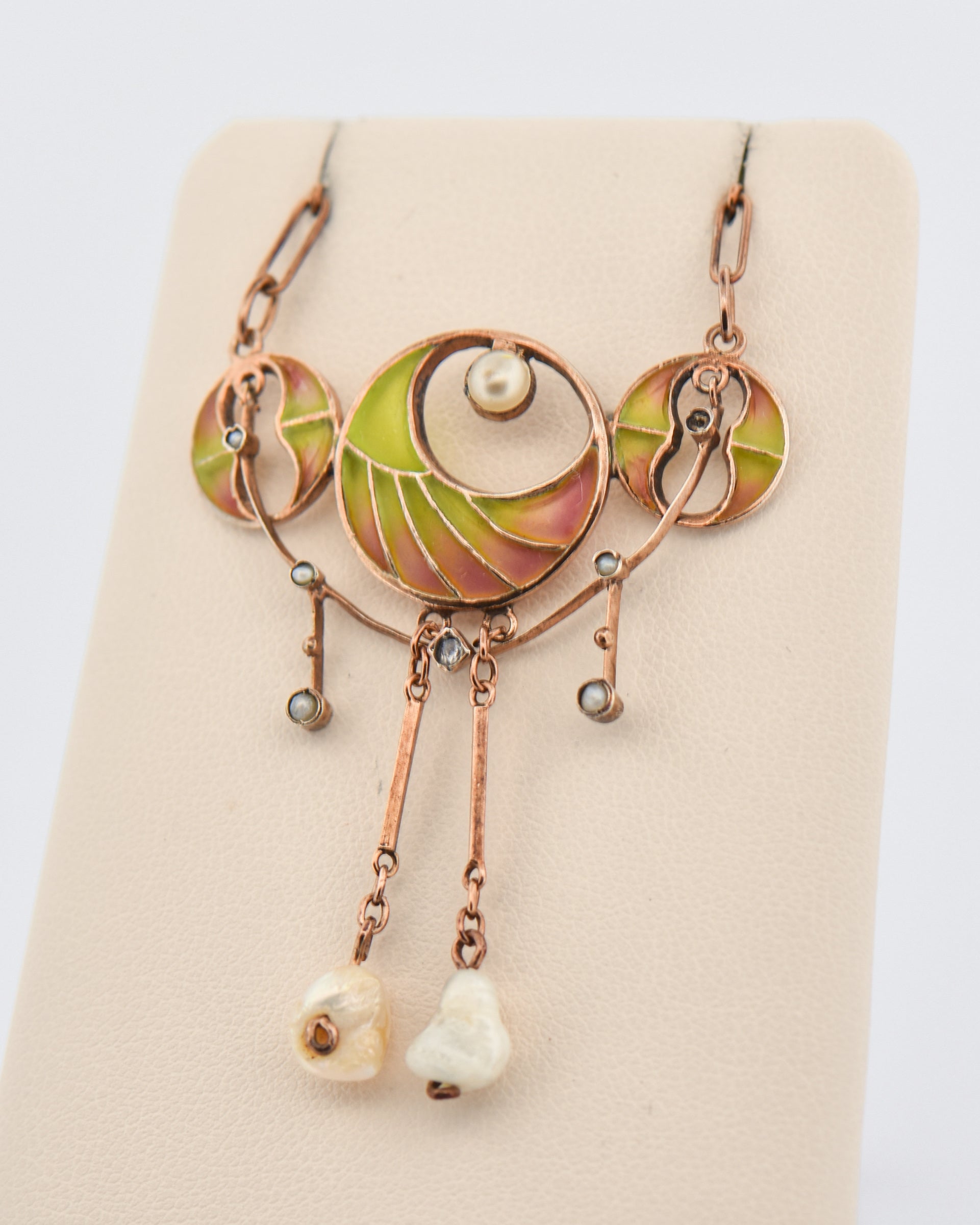 Crafted around 1900, this piece showcases enamel in rosy pink and light green tones, delicately placed in a crescent-inspired silhouette. Natural pearls and a rose-cut diamond add luster and light, while the graceful drop design enhances its felinity and movement. The necklace is a stunning example of the Art Nouveau era's focus on organic lines and natural forms.