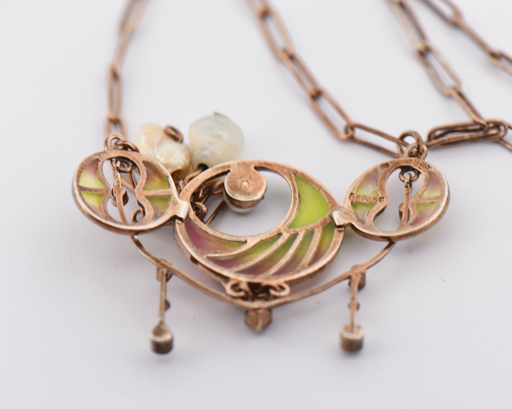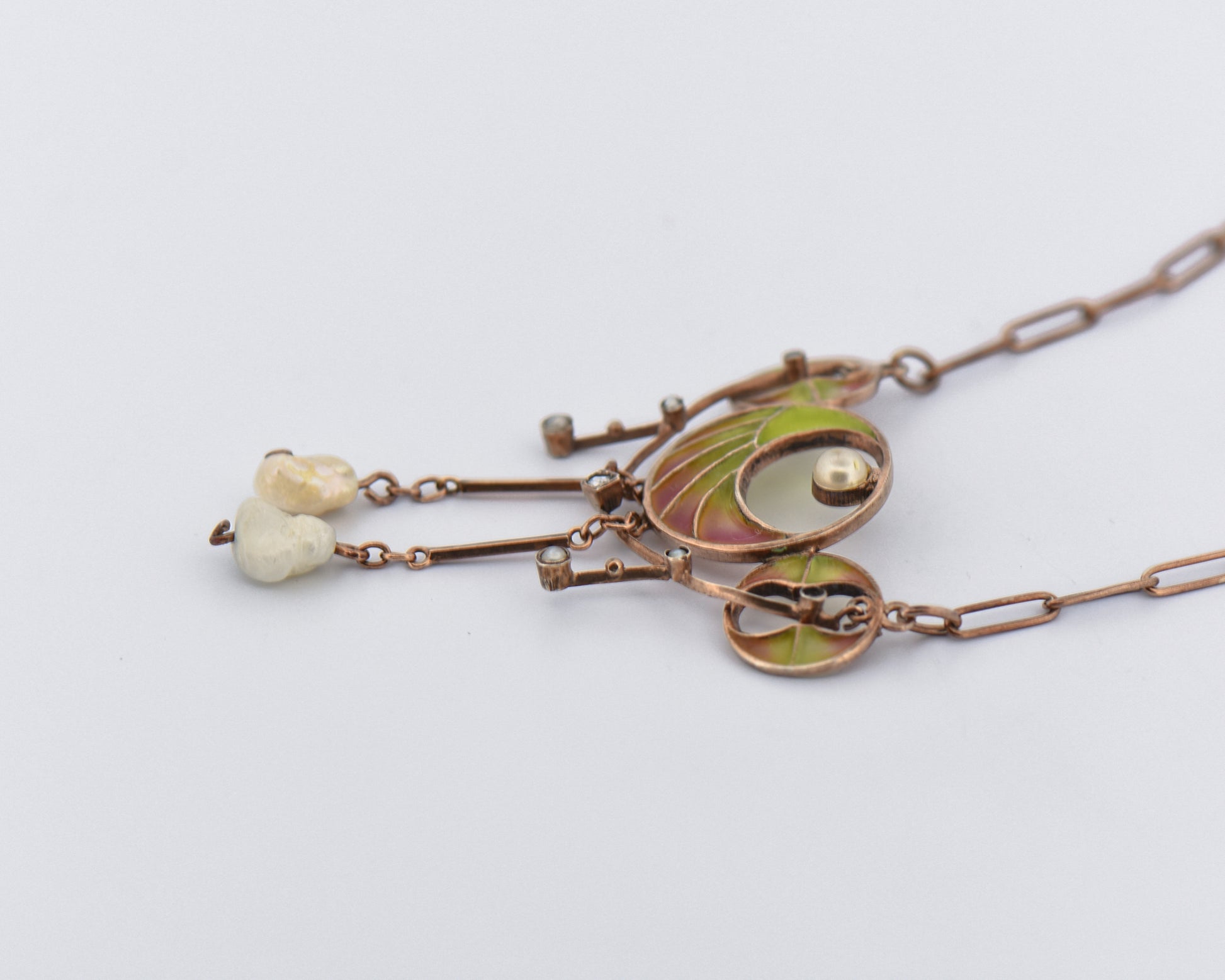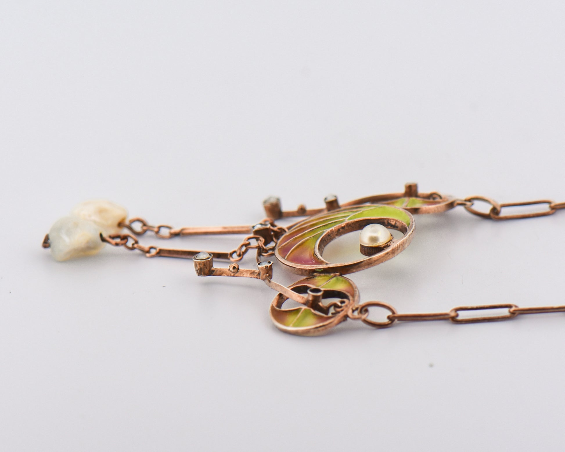 Details: French Art Nouveau necklace, circa 1900. Crafted in 14k rose gold and sterling silver, featuring enamel, natural seed pearls, baroque pearls, and a rose-cut diamond.