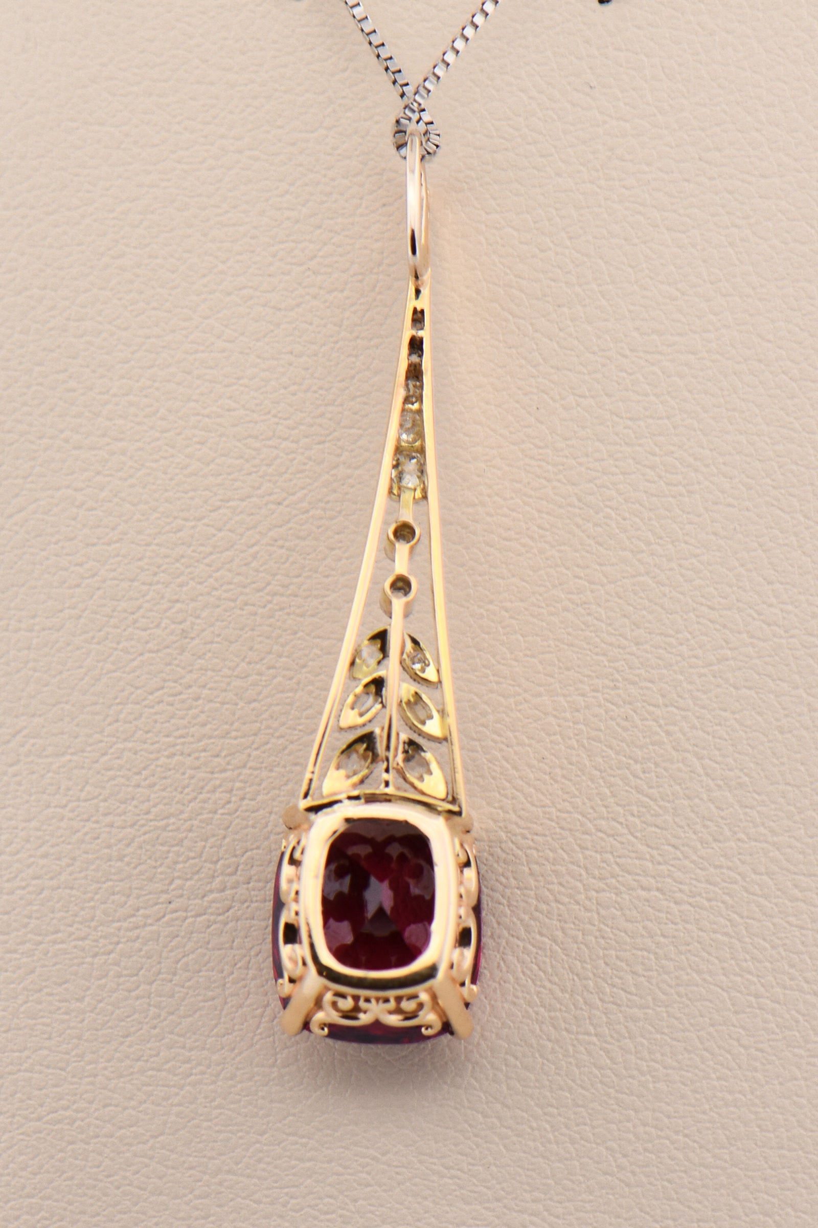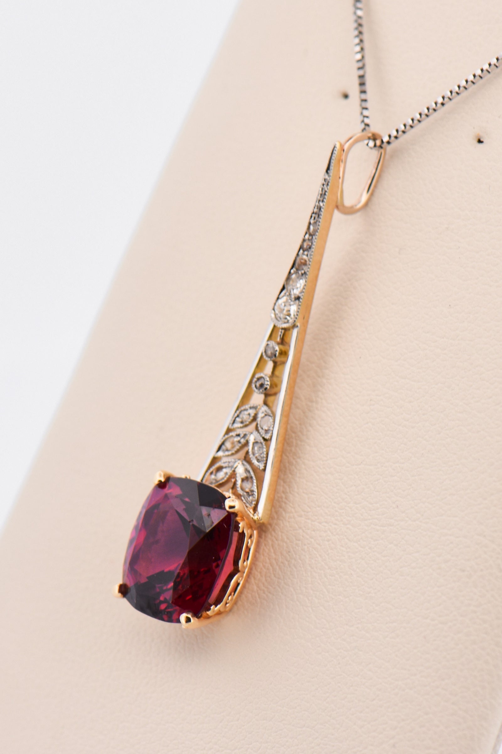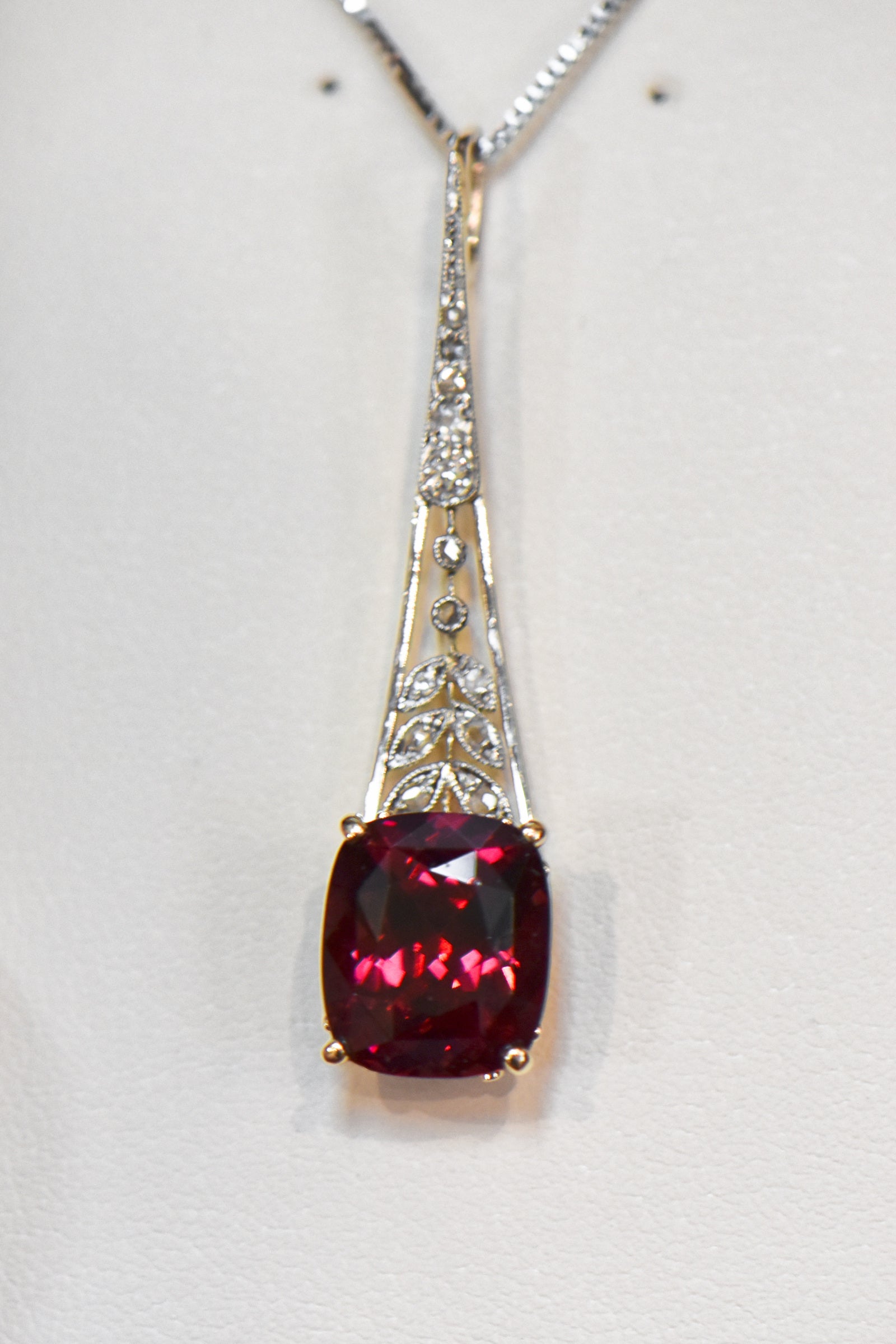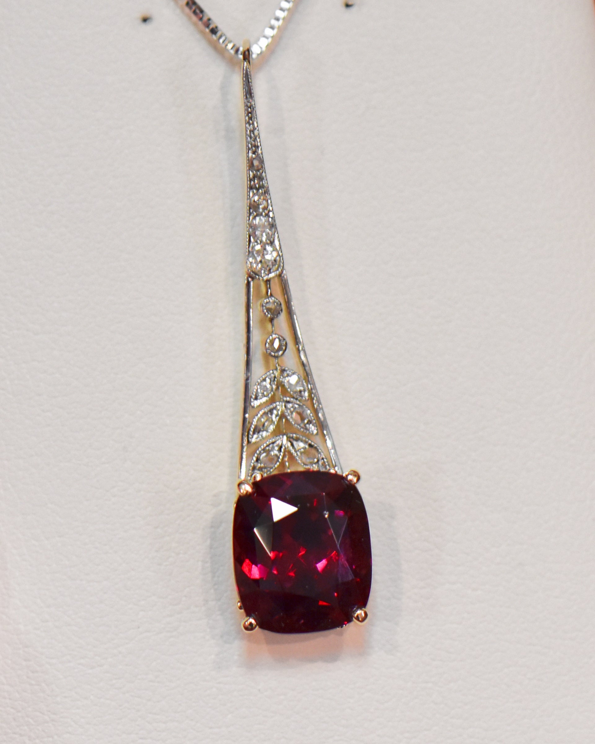 Details: Art Nouveau pendant in platinum-topped 14k gold featuring approx. 6.80ct cushion-cut rhodolite garnet and 0.15ctw diamonds (SI clarity, J–K color); circa 1910; estate piece.
