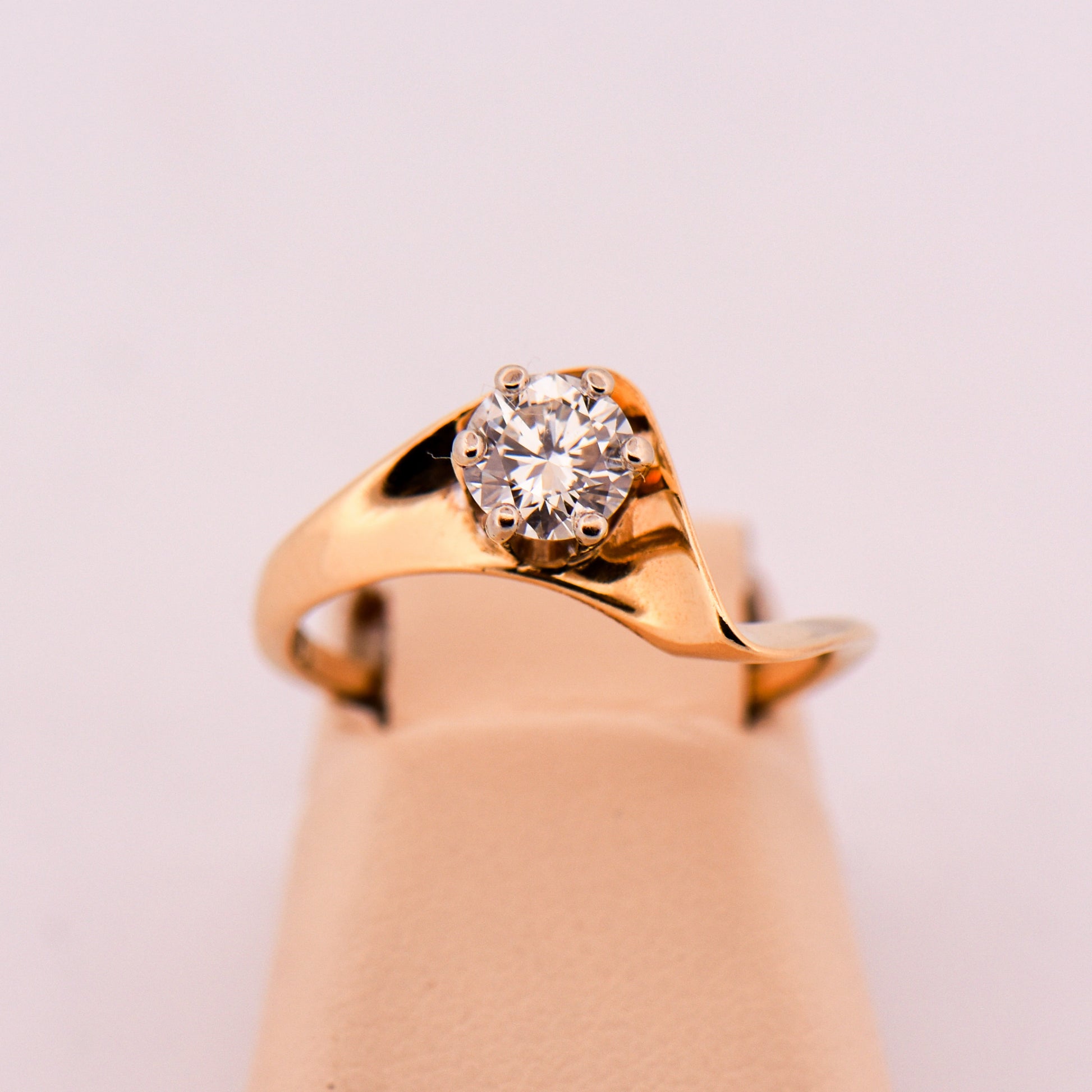 The ring is expertly crafted from a flowing piece of yellow gold, featuring a single white diamond offset at the center. The gold has a sculptural elegance, with high-polished surfaces that reflect light beautifully. The fine-quality diamond sparkles brilliantly, secured in a classic six-prong setting. This vintage diamond engagement ring would make a stunning choice for an engagement, but it could also be worn as a right-hand ring.