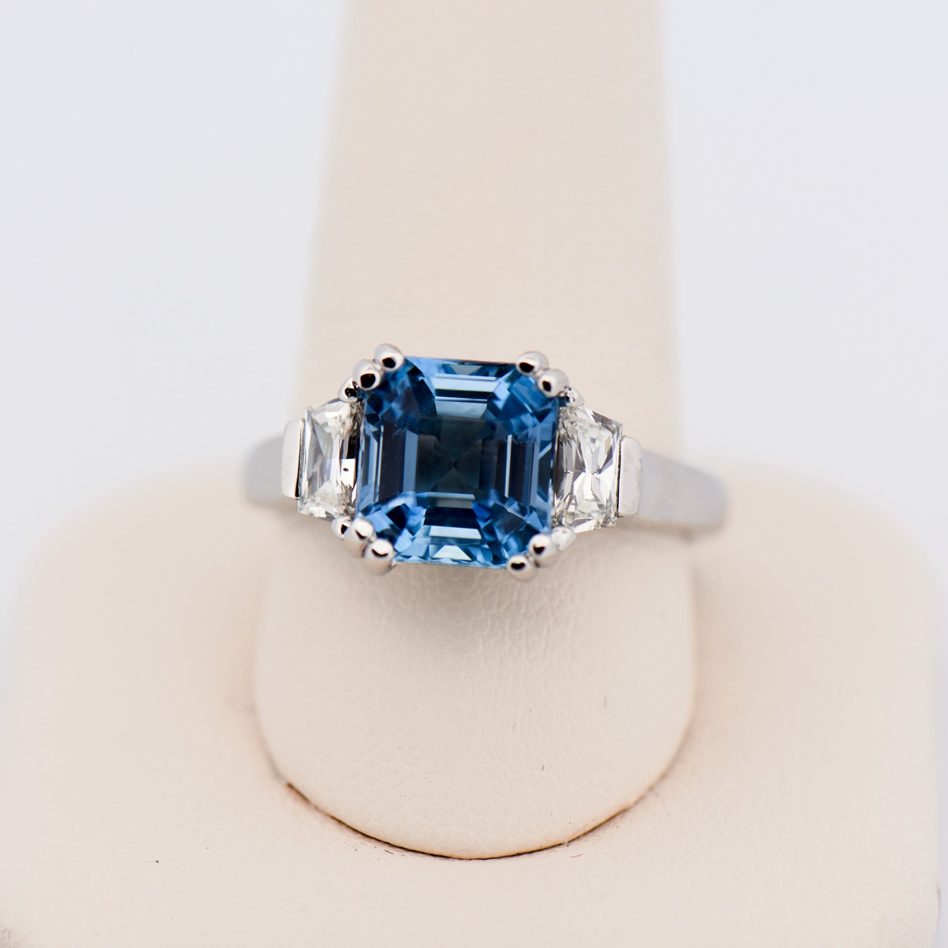 Details: Custom platinum ring set with a 2.61ct Asscher aquamarine (Brazil, assumed heated) and 0.49ctw trapezoid diamond accents (natural, VS, HI).