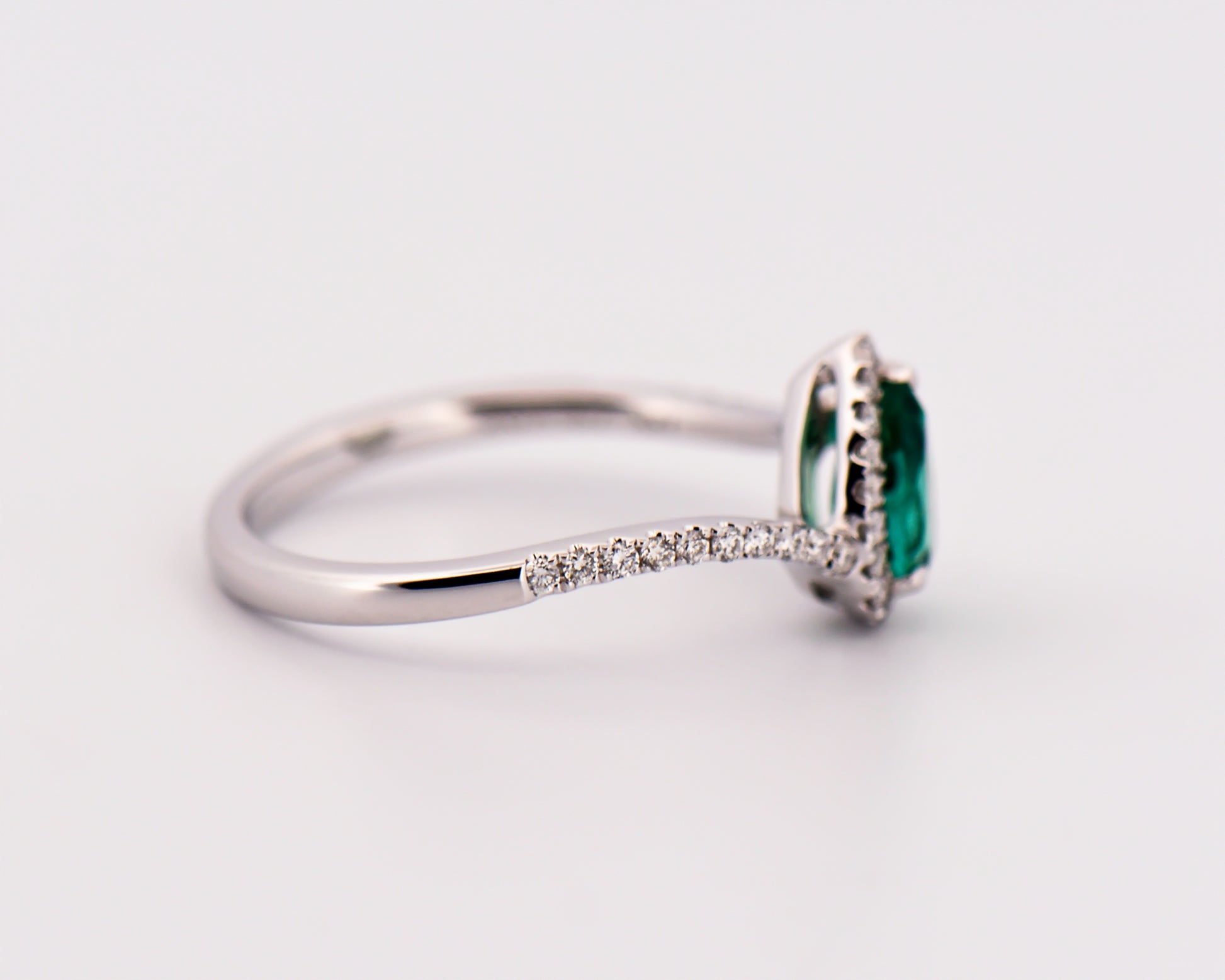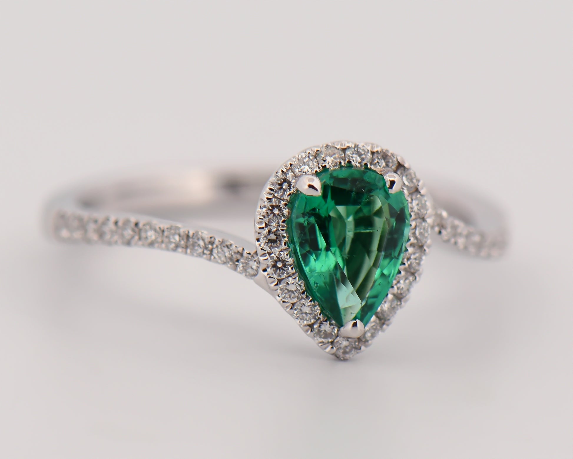 Details: Custom 18k white gold bypass ring set with a 0.64ct pear-shaped emerald (Zambia, oil only) and 0.24ctw of round diamond accents (SI1 GH).