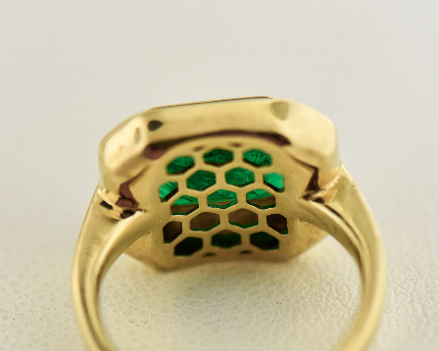 Although the origins of this modern estate ring remain a mystery, the quality of workmanship is undeniable. The setting is solid and well-constructed, complete with a custom under-gallery beneath the emerald. The design allows the ring to sit low on the finger while accommodating the large emerald.
