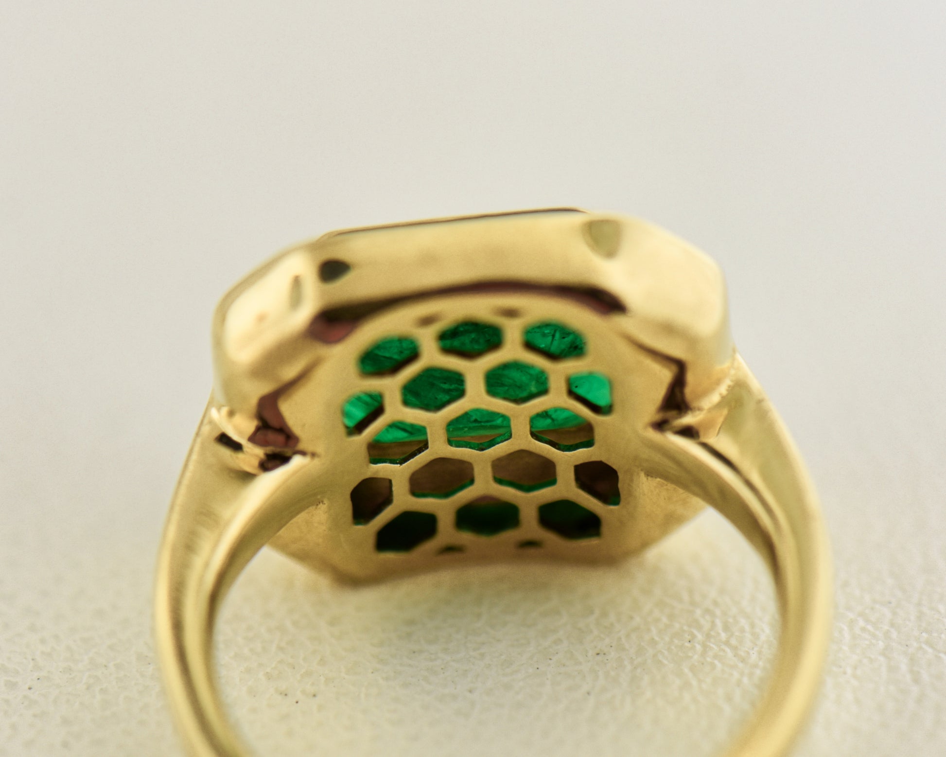 The emerald is high quality, showcasing the coveted deep and rich emerald green color. While the natural emerald has moderate inclusions, typical for most emeralds, its color is exceptional, and the inclusions do not detract from its beauty. Overall, this ring features an unusual design and a stunning emerald.