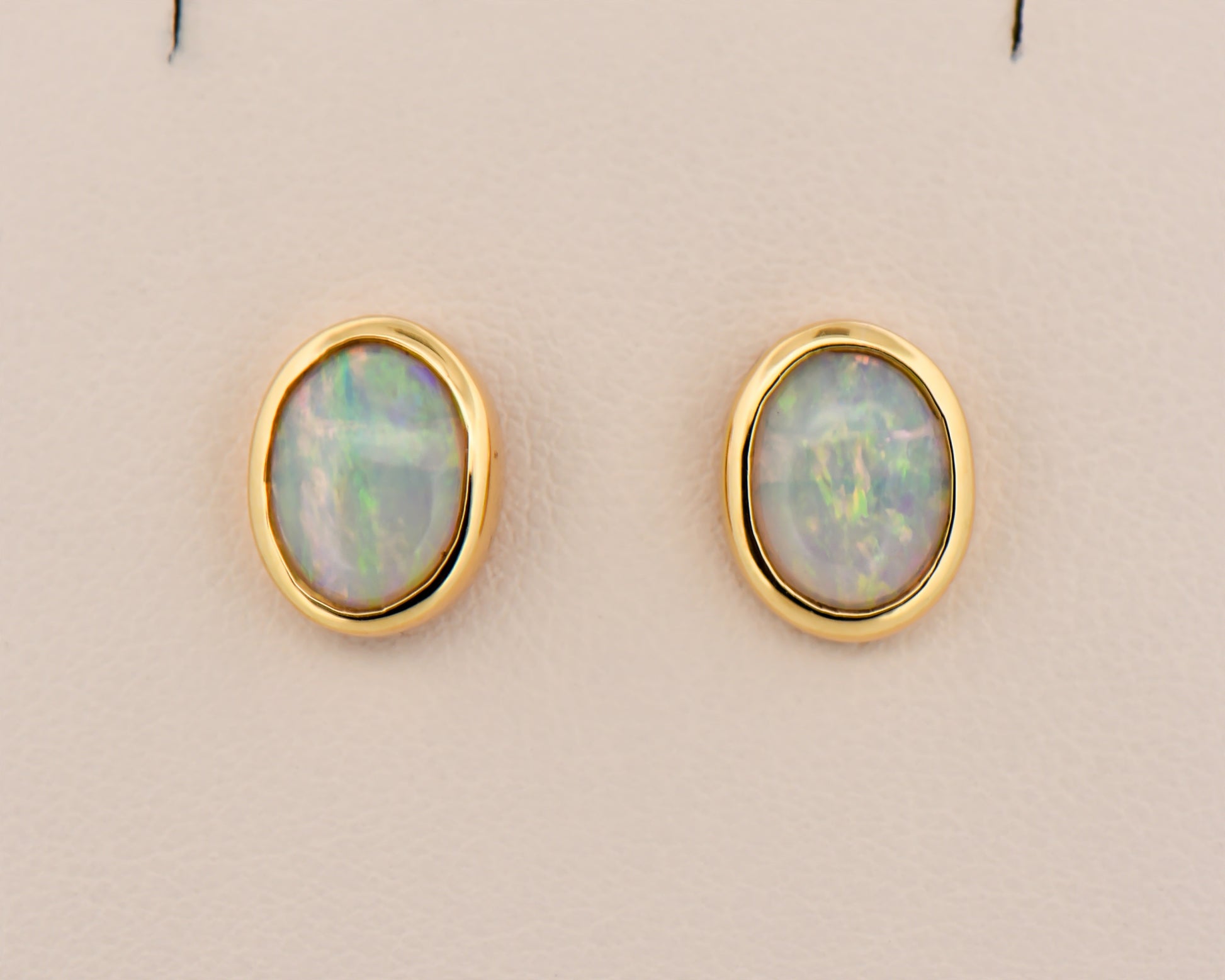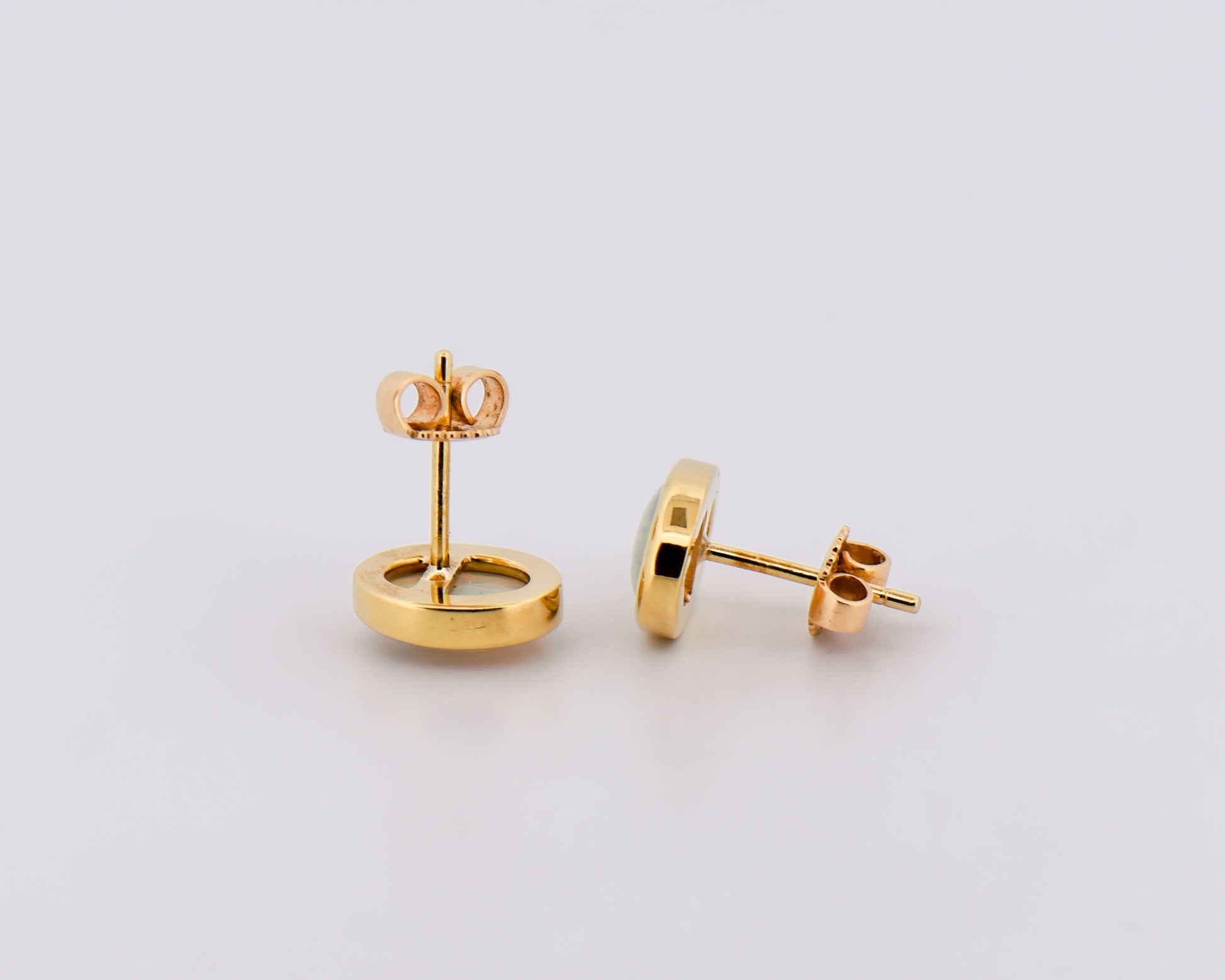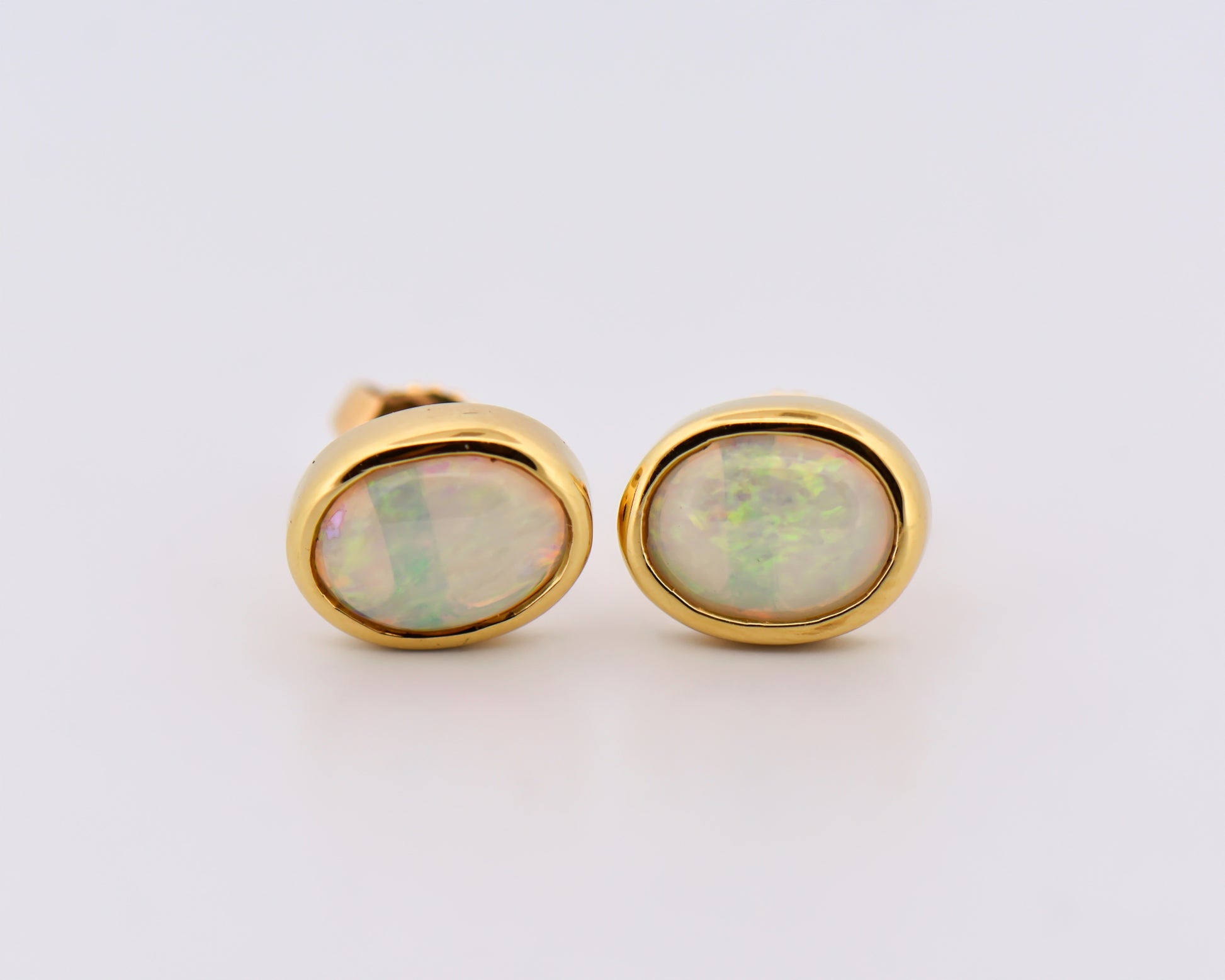 Colorful and captivating, these opal studs are the perfect everyday accessory. Set in luxurious 18k yellow gold, each earring features a lustrous Australian opal, with a combined total weight of 2 carats. The bezel setting offers both security and a clean, modern silhouette, allowing the stones to take center stage.