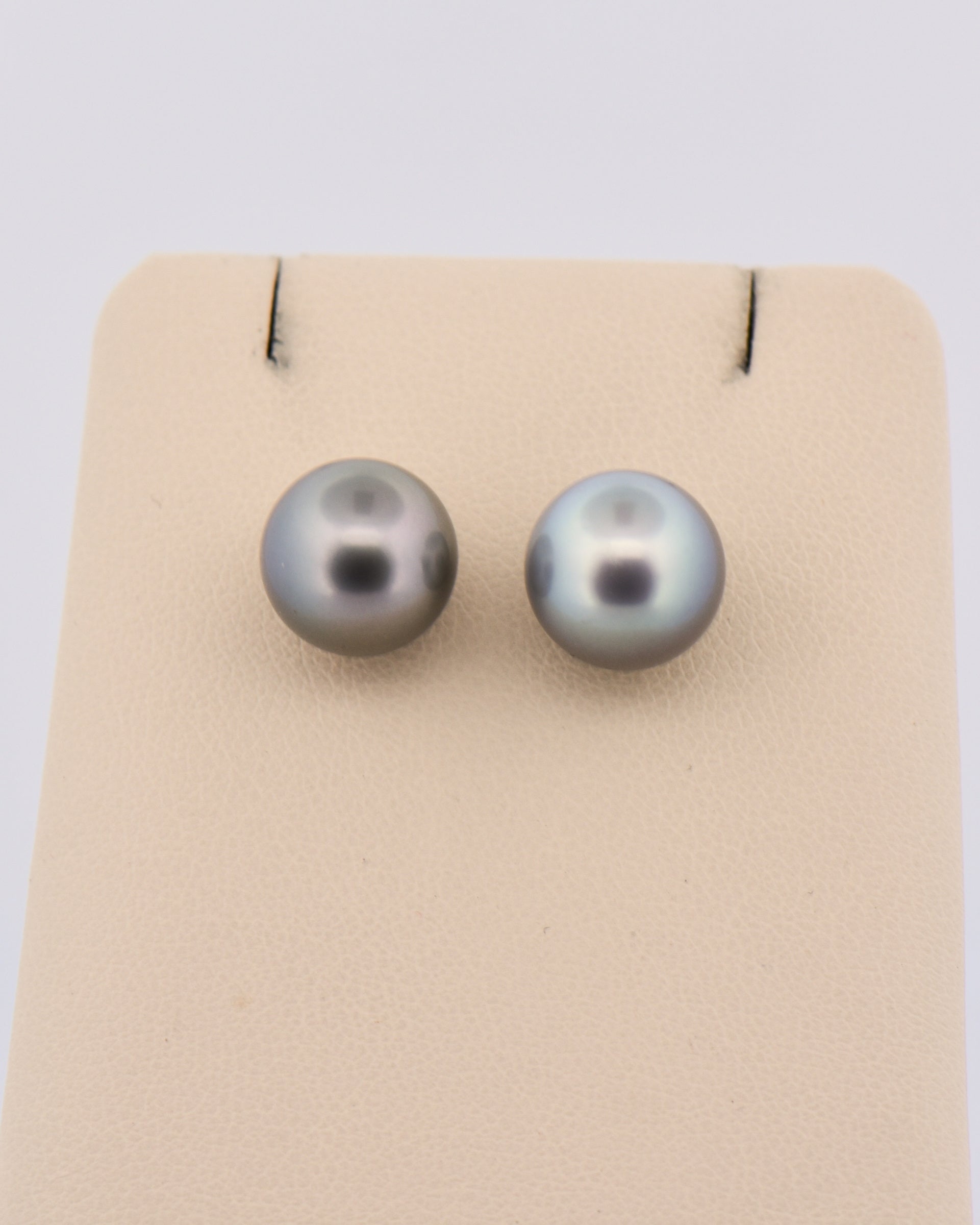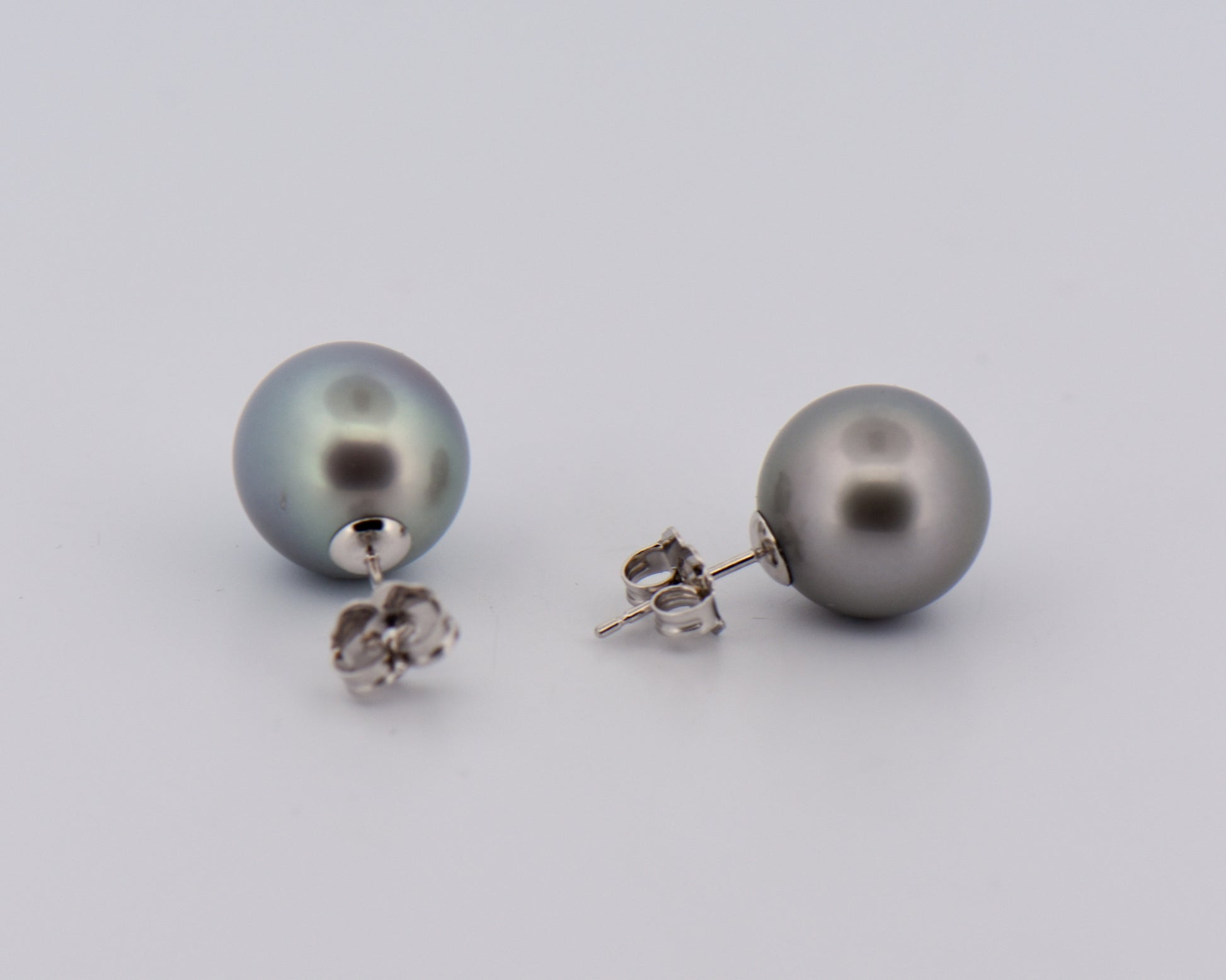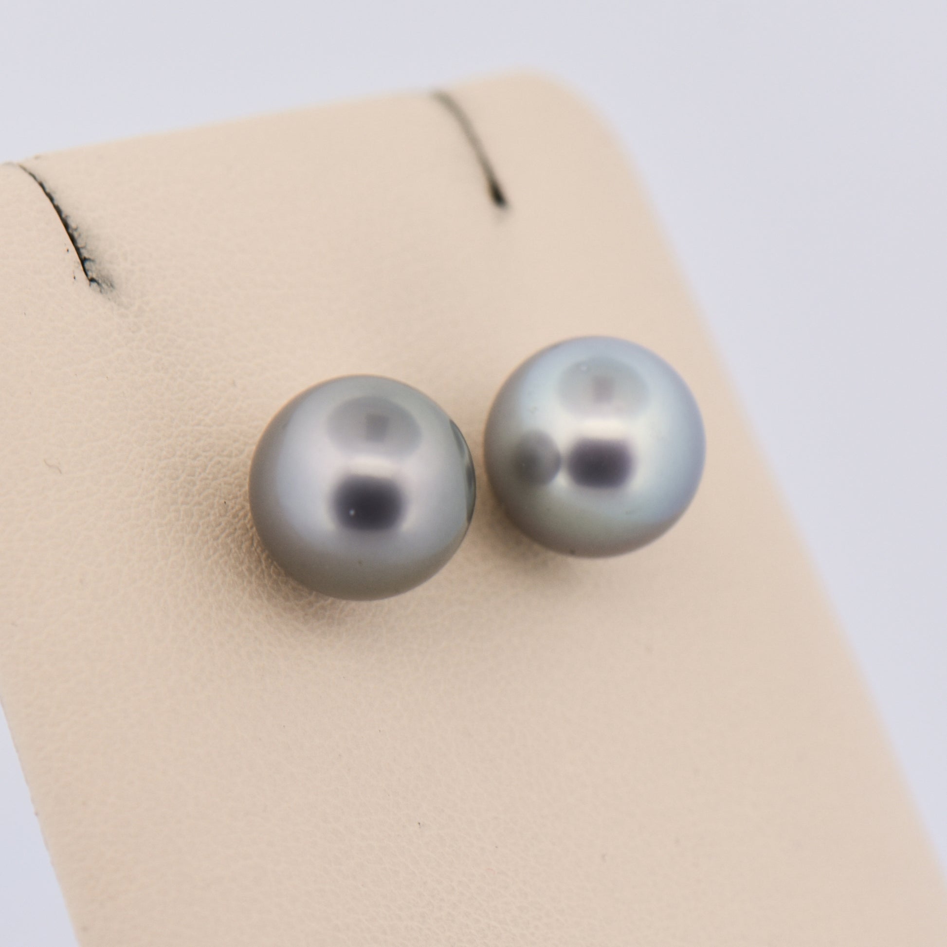 Details: 14k white gold stud earrings set with 8mm natural Tahitian pearls in grey-purple tones.