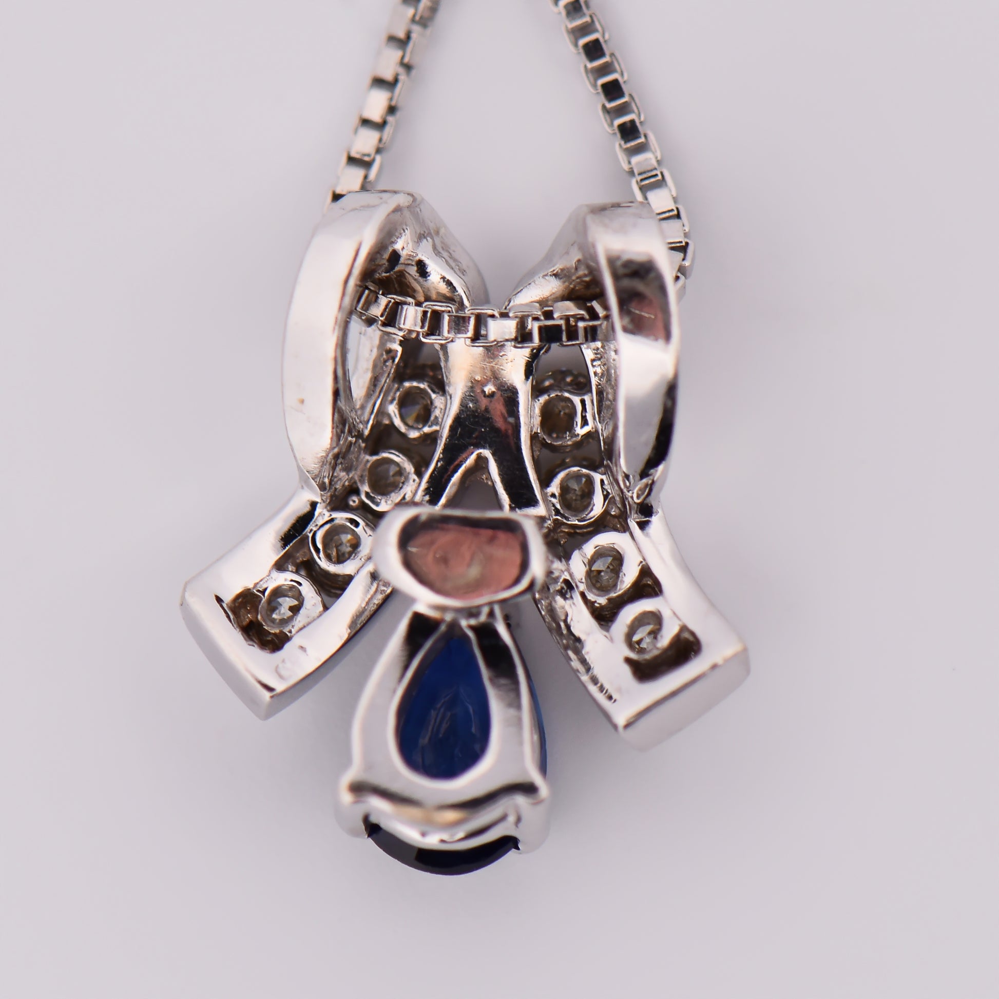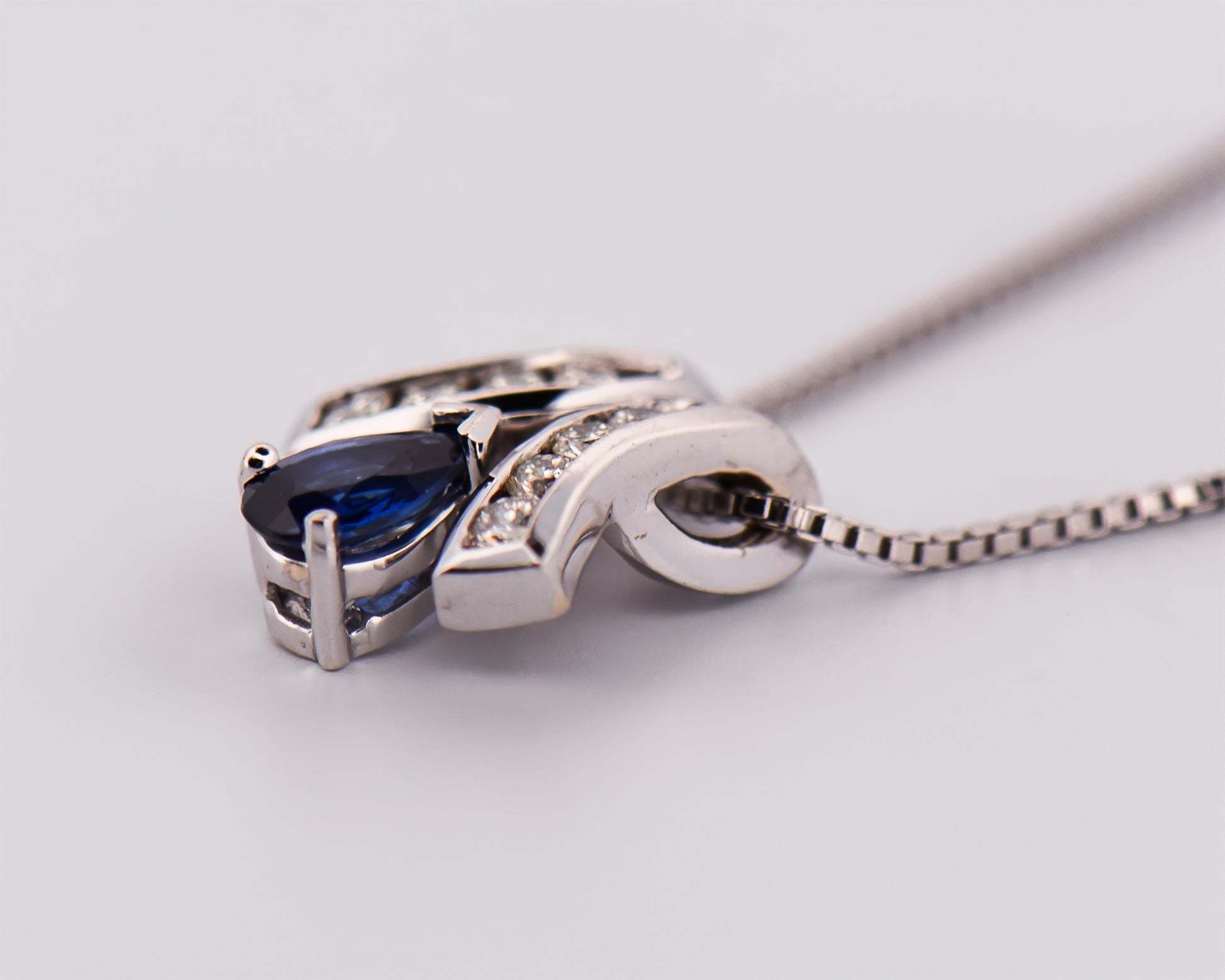 Details: Sapphire and diamond slide pendant in 14k white gold featuring approx. 0.50ct pear-cut sapphire accented by approx. 0.20ctw diamonds (SI clarity, G–H color); estate piece.