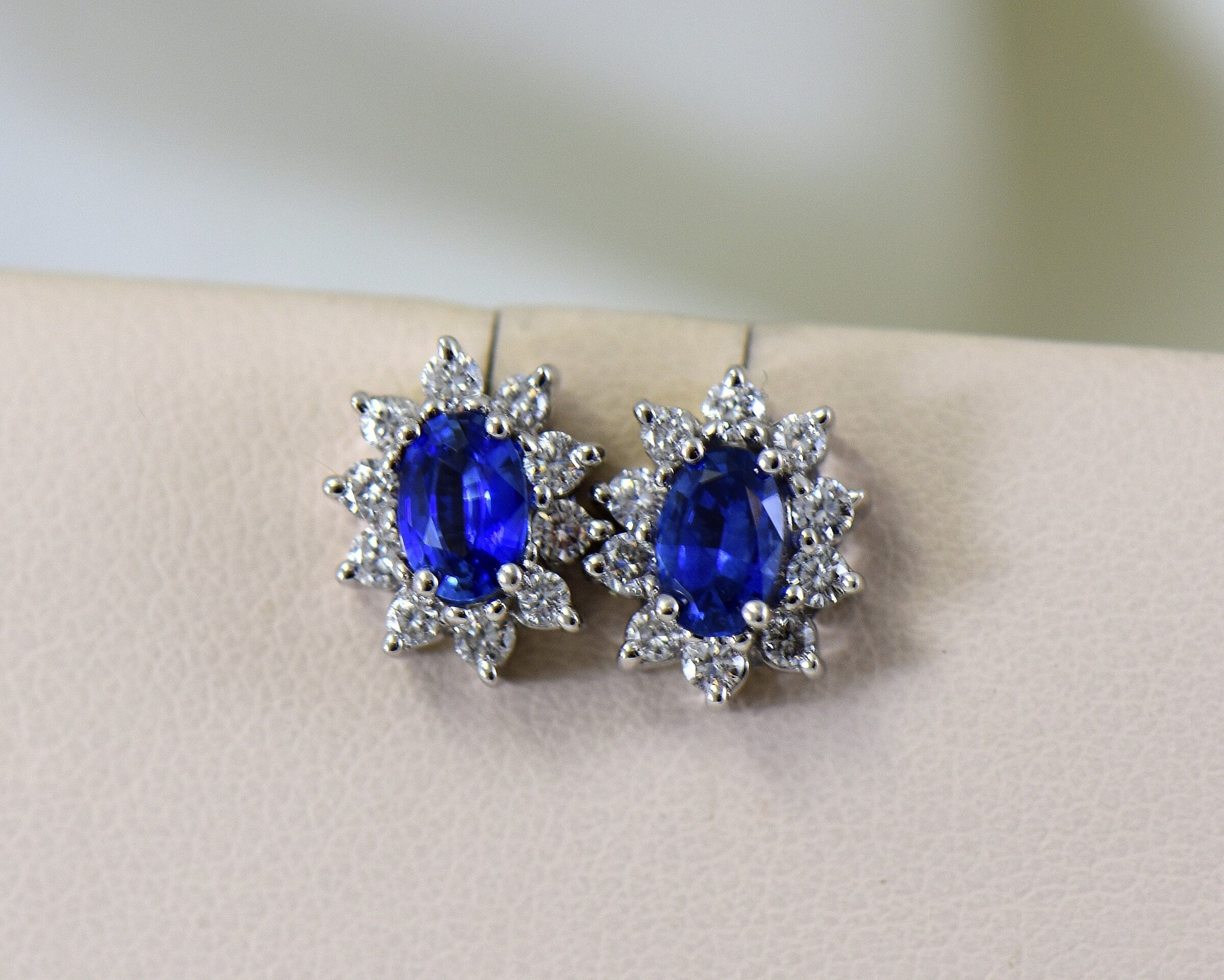 Details: 14k white gold stud earrings set with 1.20 carats total weight of oval blue Ceylon sapphires (heat-treated only) and 0.40 carats total weight of SI-I1 GH diamond accents.