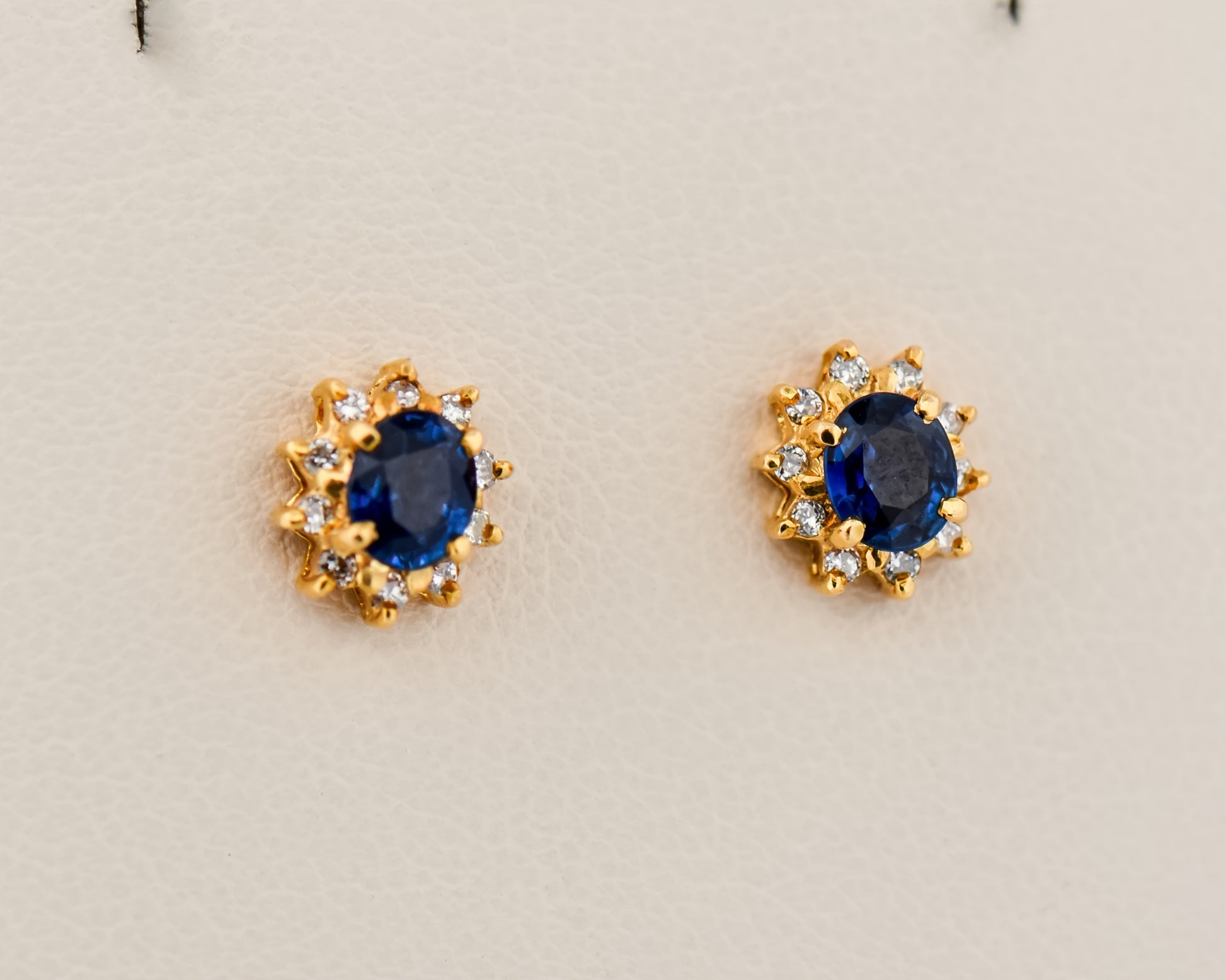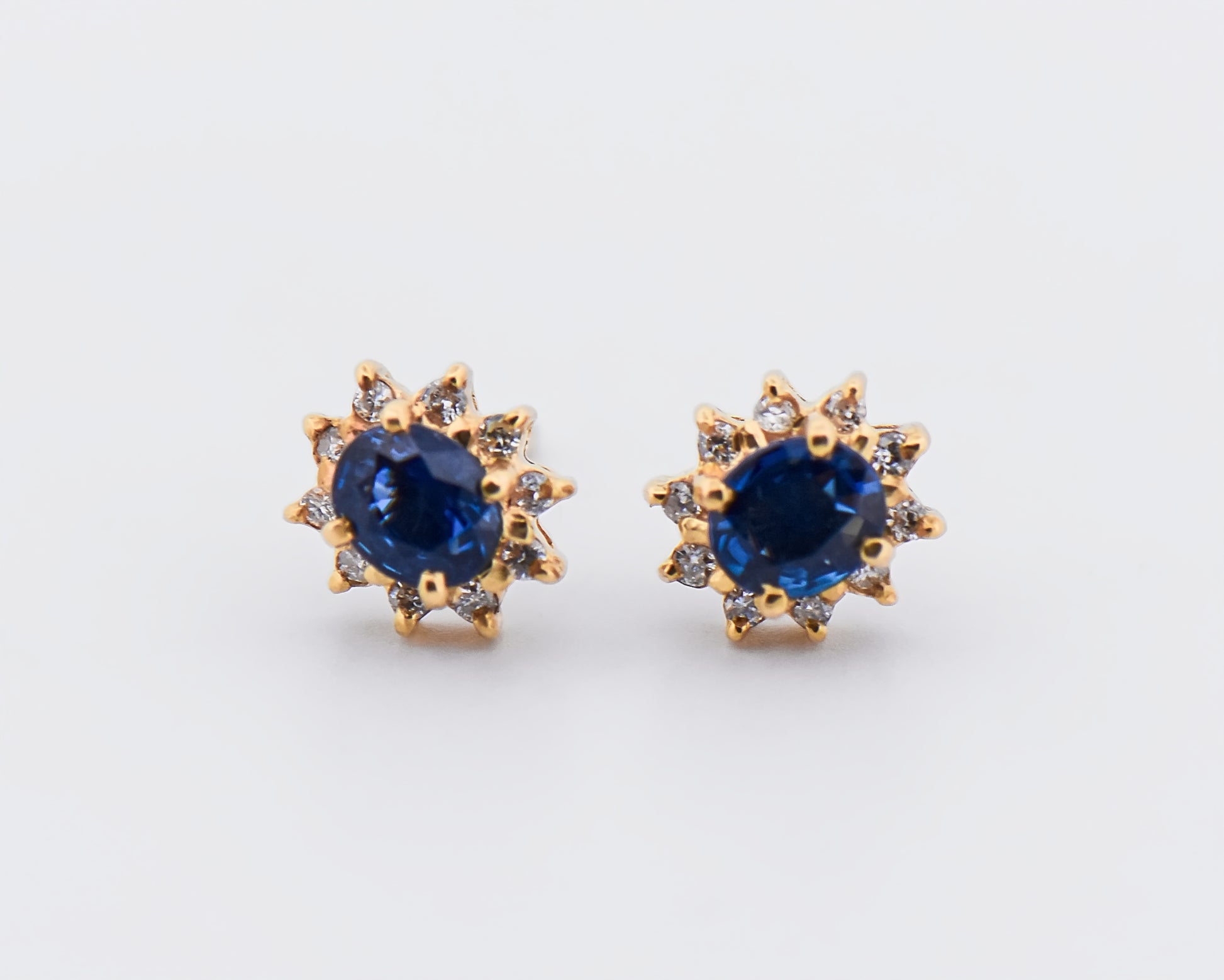 Details: Blue sapphire halo stud earrings in 14k yellow gold featuring sapphires totaling approximately 1.00ctw and diamonds totaling approximately 0.20ctw (SI clarity, H–I color).