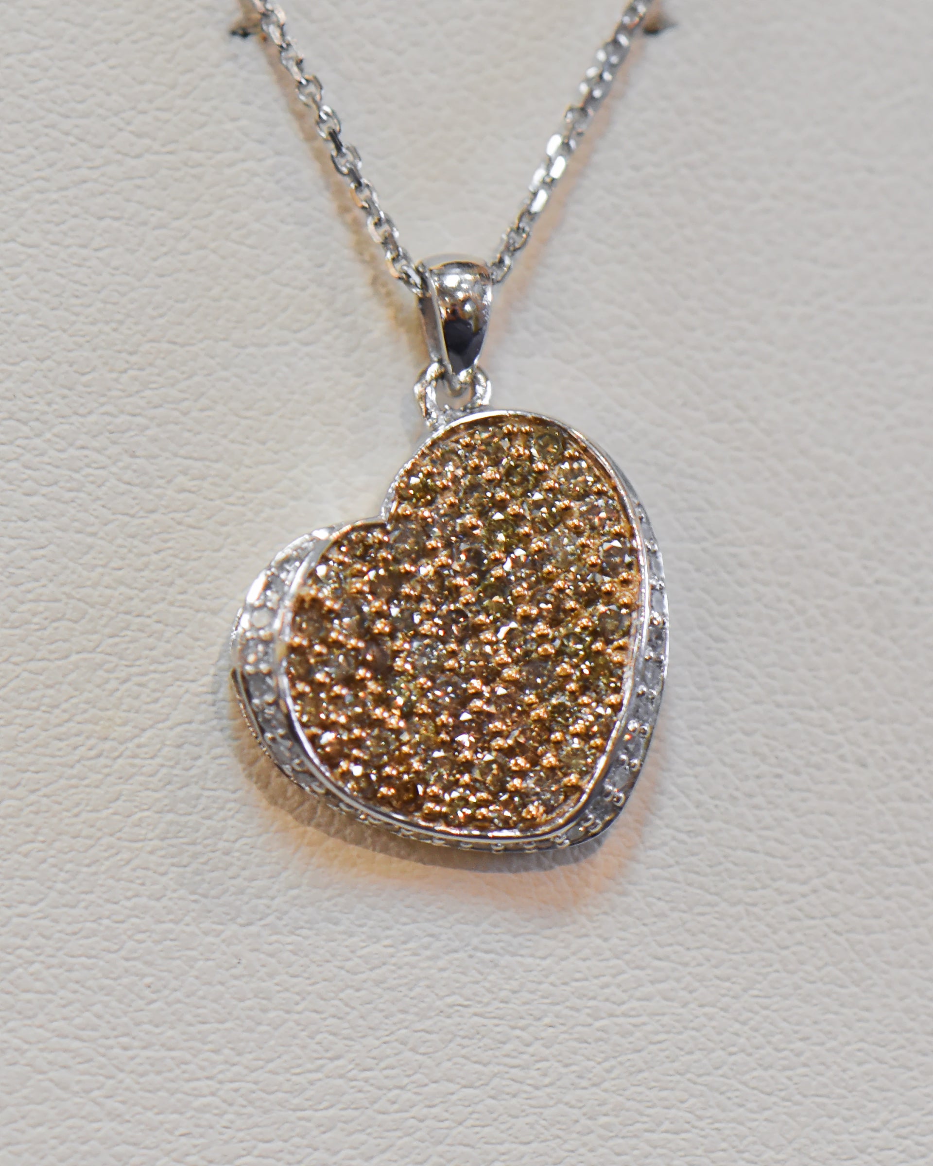 Details: Champagne diamond heart pendant in 14k white gold featuring approx. 1.50ctw champagne diamonds (SI–I1 clarity); estate piece.