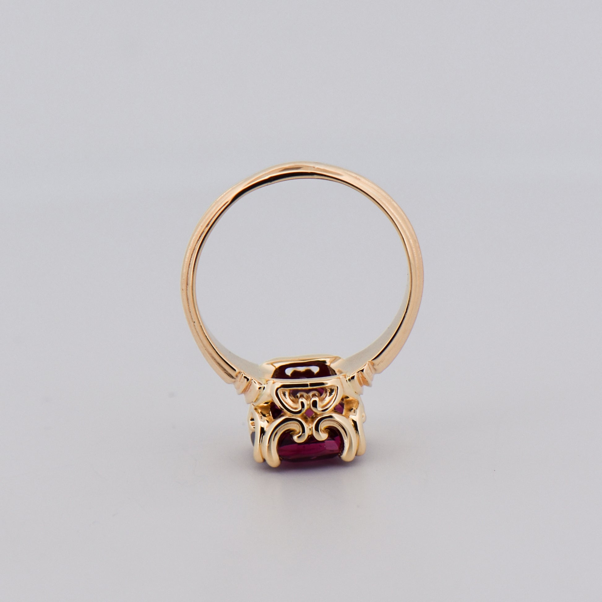 We selected this stunning rhodolite garnet to serve as the new centerpiece of the ring. Not only is it large—nearly 10mm across—but it also boasts a fantastic color. Rhodolite is a unique blend of two red varieties of garnet—almandine and pyrope—that merge to create a rarer purplish-red hue. The color of this gem reminds us of ripe raspberries or fresh summer cherries, showcasing vibrant red tones intermingled with intense purple and pink hues.