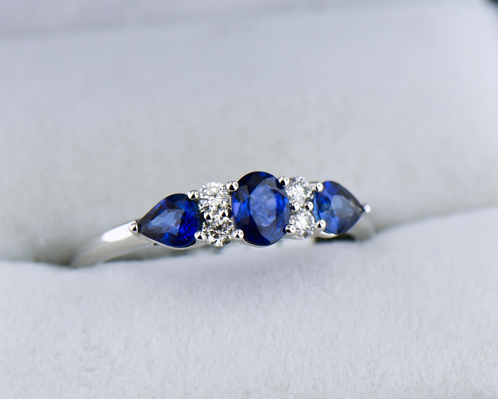 Why change a classic? Five-stone rings have been a favorite choice for over 100 years, worn on the right hand and as an engagement ring, and our version offers a modern twist on the traditional design. We alternate between royal blue sapphires and diamonds, featuring an oval-shaped sapphire in the center and pear-shaped sapphires on the outer sides. Additionally, we’ve added a pair of sparkling accents instead of a single diamond between each sapphire. The sapphires and diamonds are of the highest quality, showcasing a vibrant crushed velvet blue hue that stands out beautifully—truly elegance at its finest.