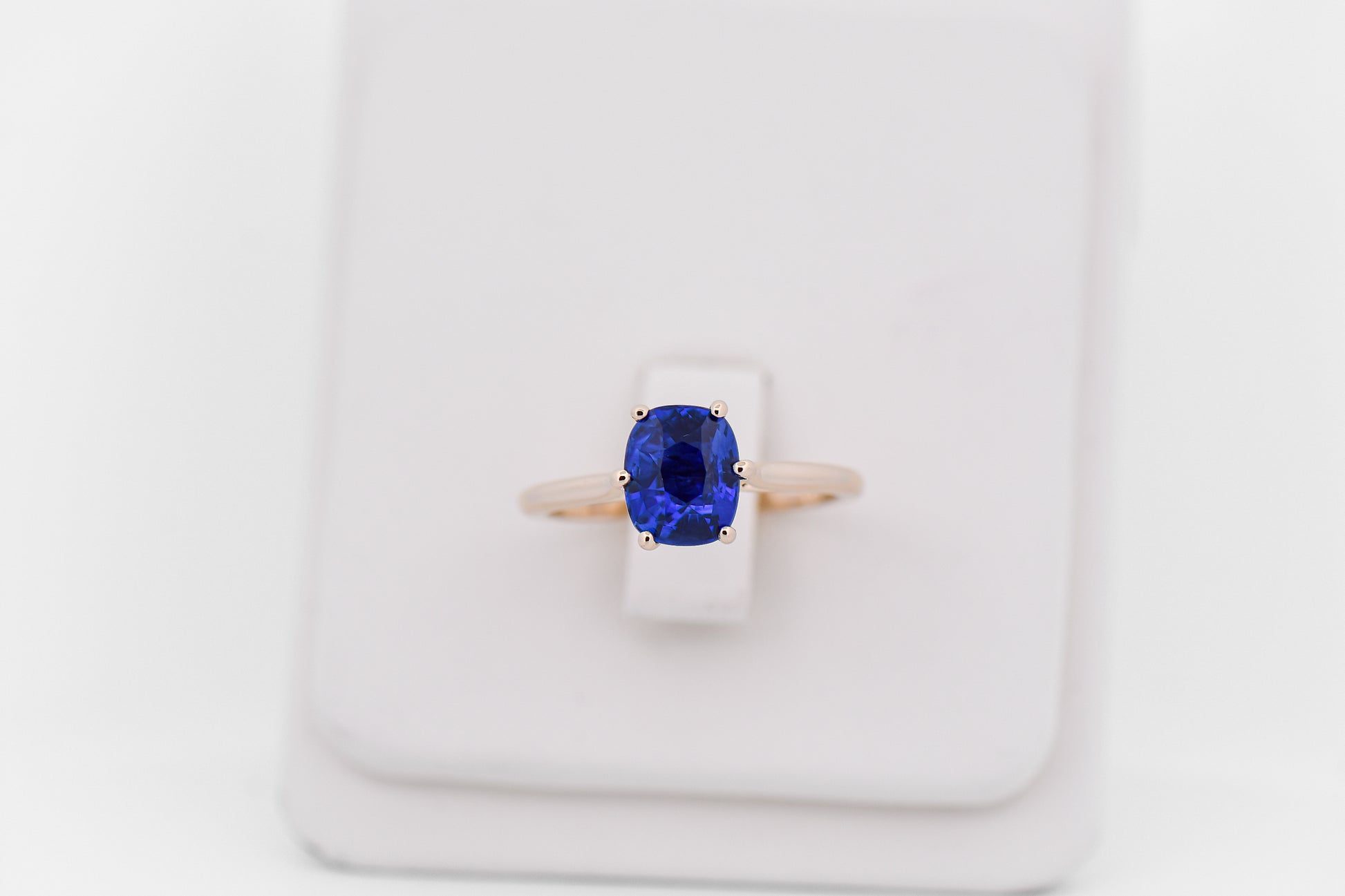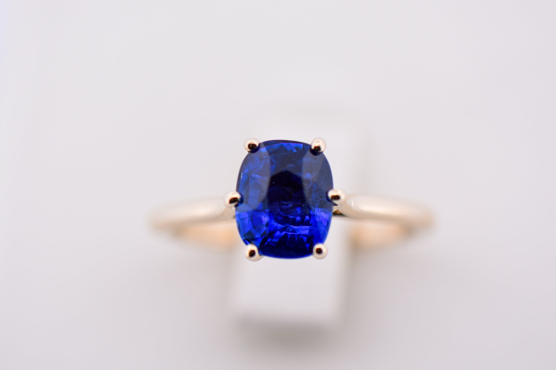 Details: Sapphire solitaire ring in 14k yellow gold featuring a 2.55ct cushion-cut royal blue sapphire from Sri Lanka (heat-treated).
