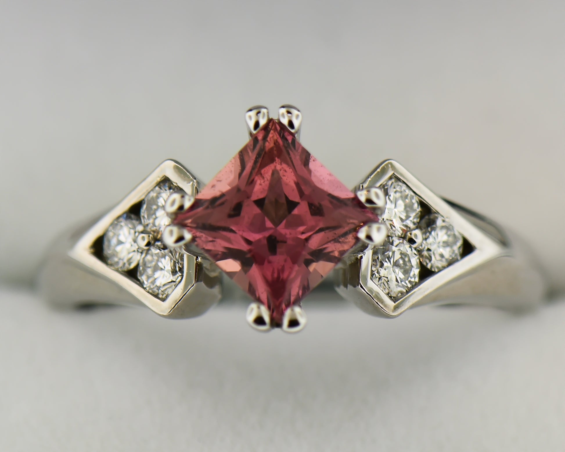 Details: Custom 14k white gold ring set with a 1.29ct square copper sapphire (Madagascar, untreated) and .35ctw of diamond accents (SI GH).