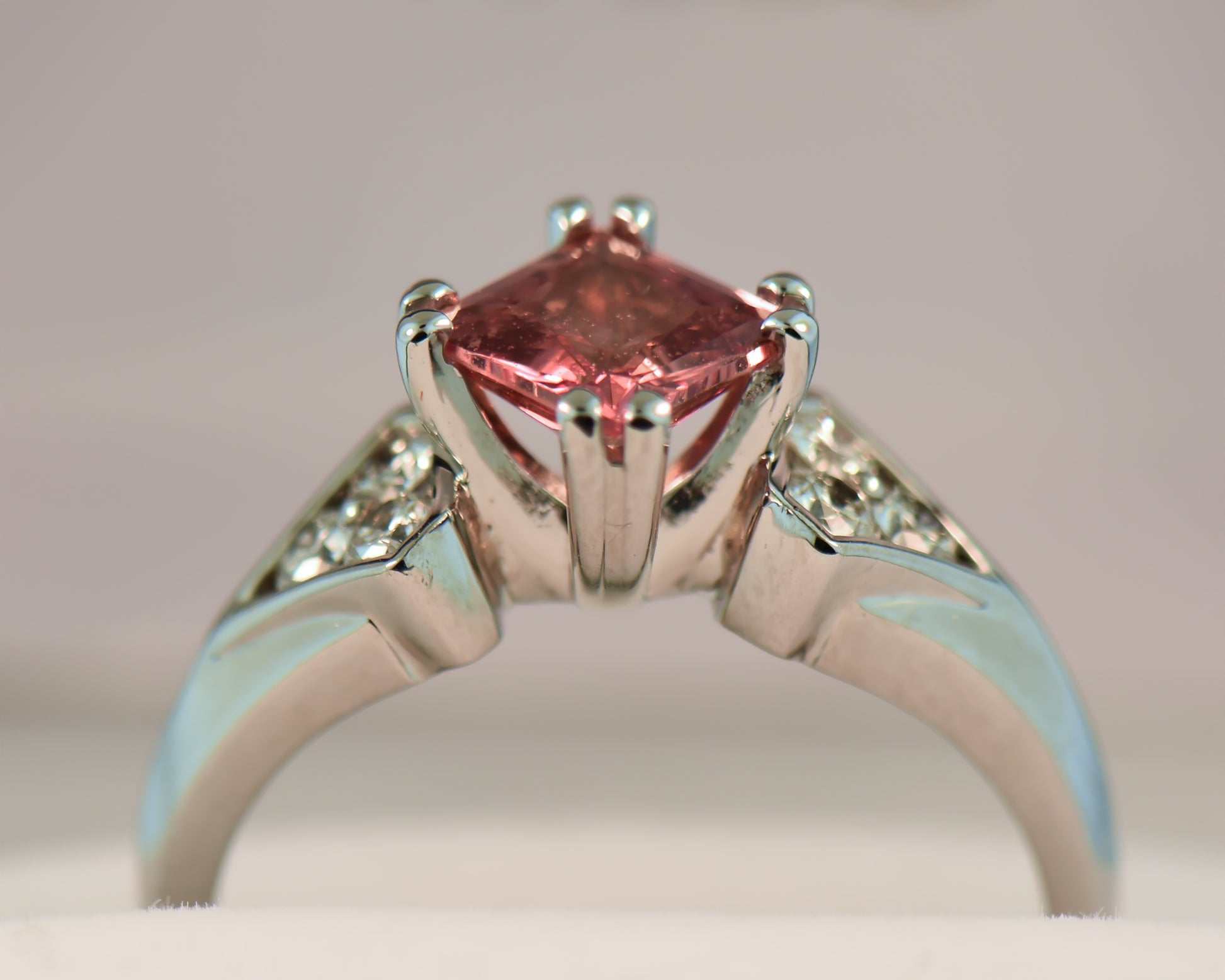 This engagement ring showcases a stunning fancy color sapphire with a hue that's challenging to classify—Is it orange? Pink? Salmon? Padparadscha? After careful consideration, we have decided to refer to it as a "copper sapphire" to capture the unique essence of this captivating gem. The square radiant sapphire is set on point with double prongs, ensuring both protection and display of the stone.