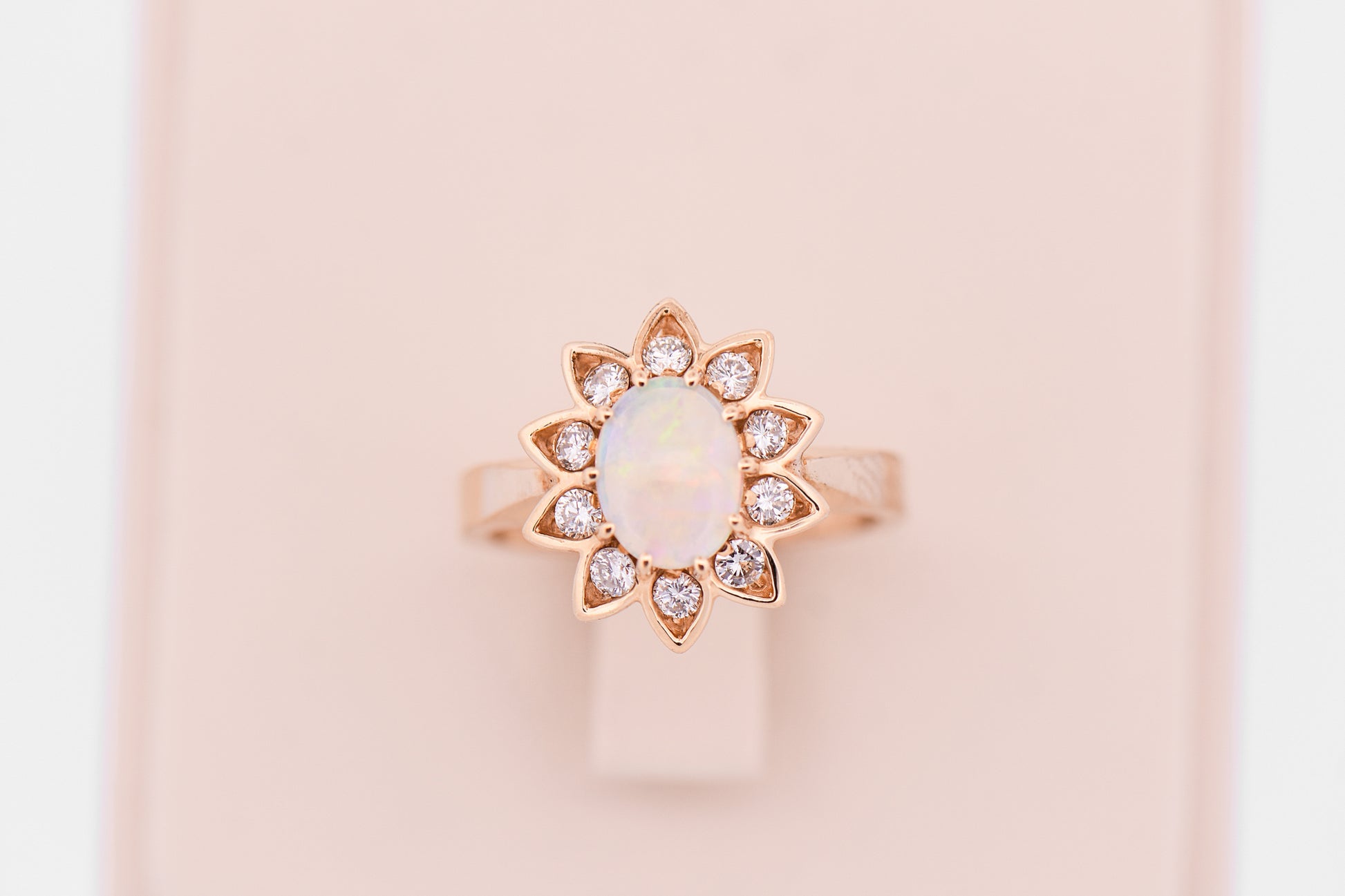 Surrounding the center stone is a graceful, floral-inspired halo of sparkling diamonds, each petal-like setting adding brilliance while enhancing the romantic, nature-inspired design. The combination of the opal’s ethereal glow and the diamond halo creates a ring that feels both elegant and whimsical.