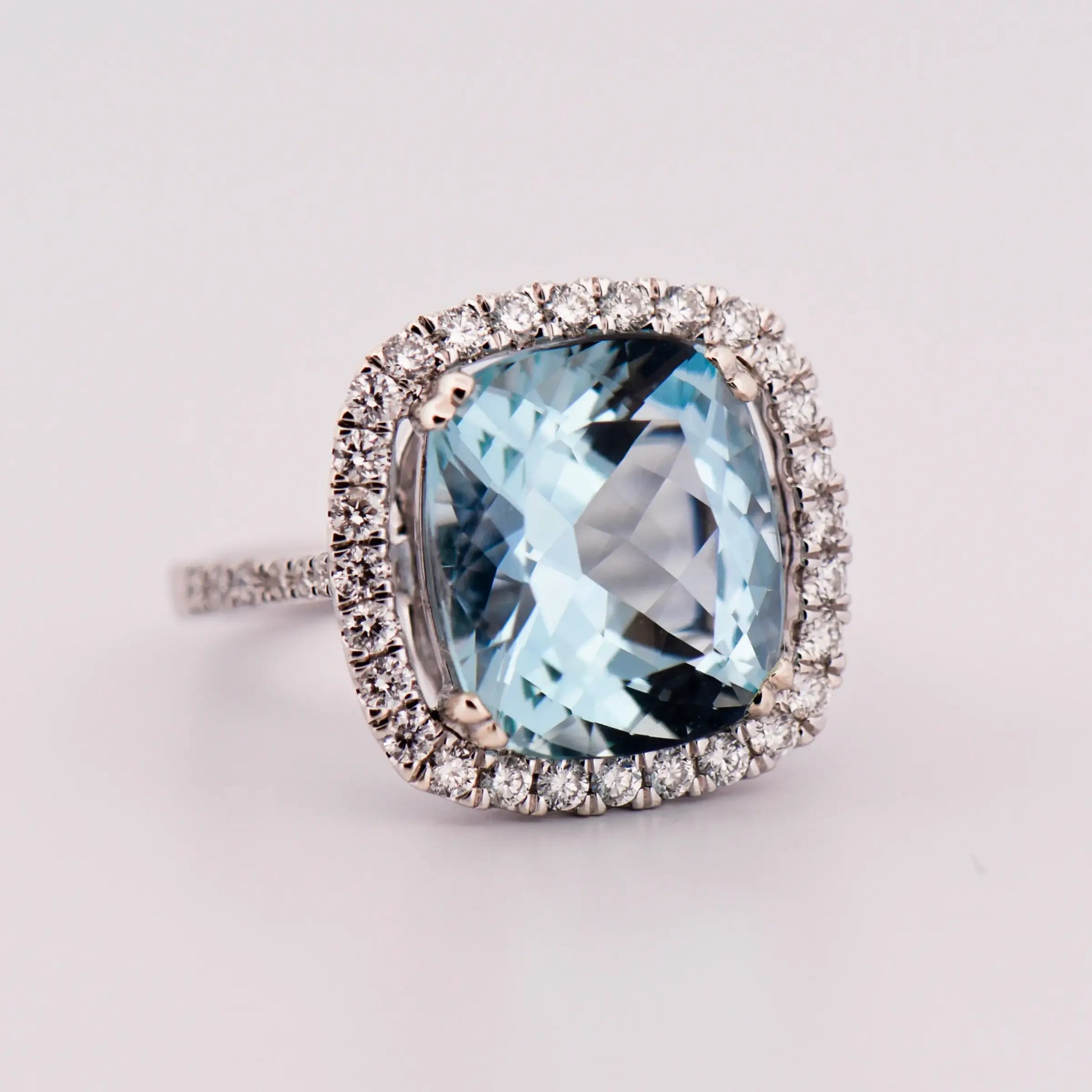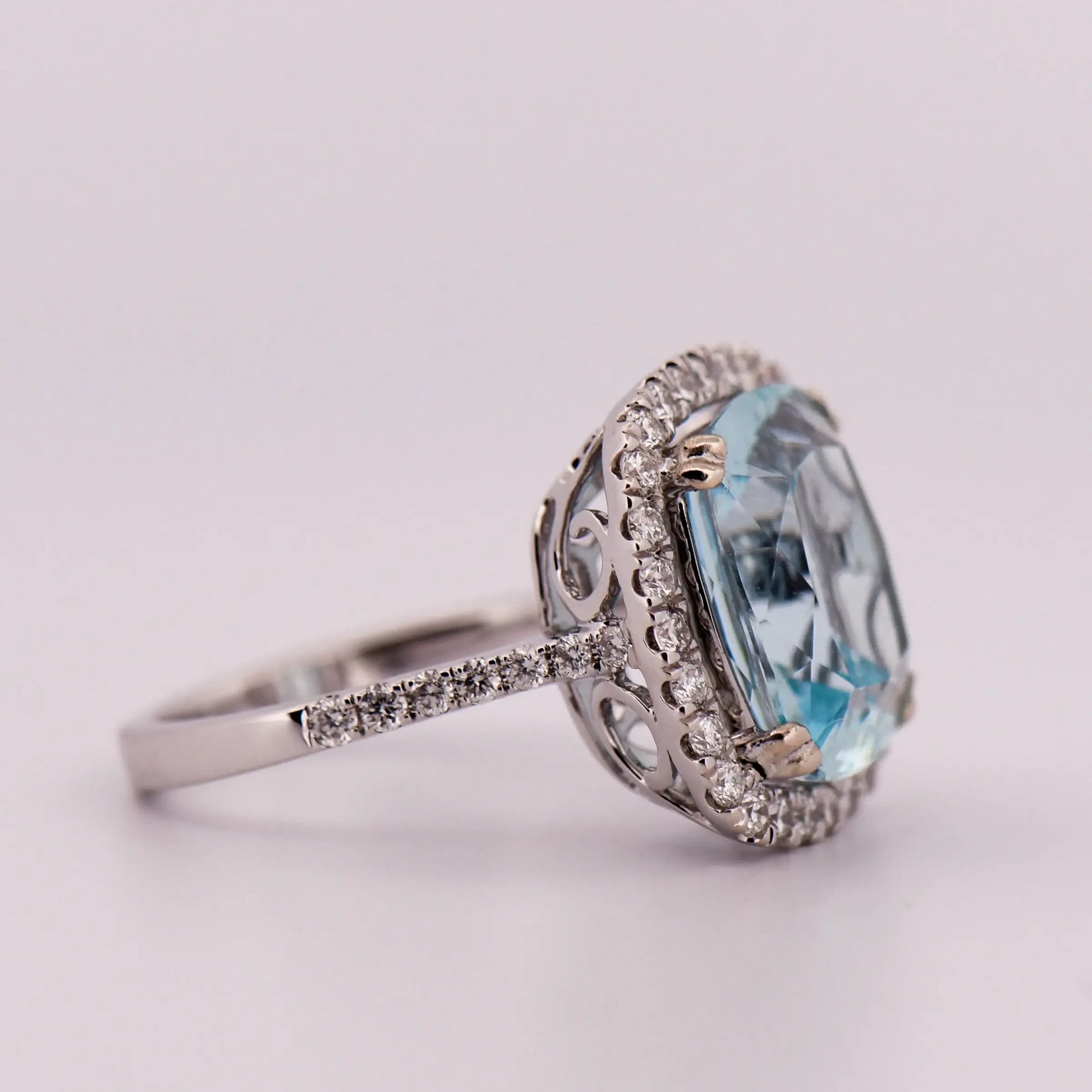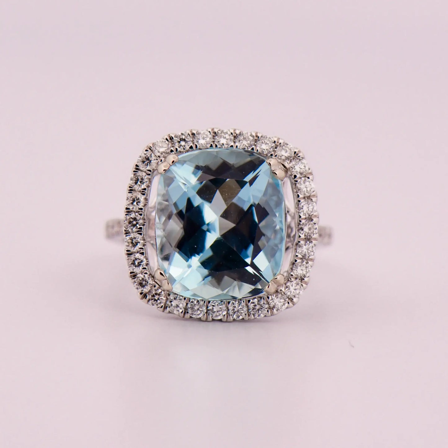Cushion Cut Aquamarine & Diamond Halo Ring