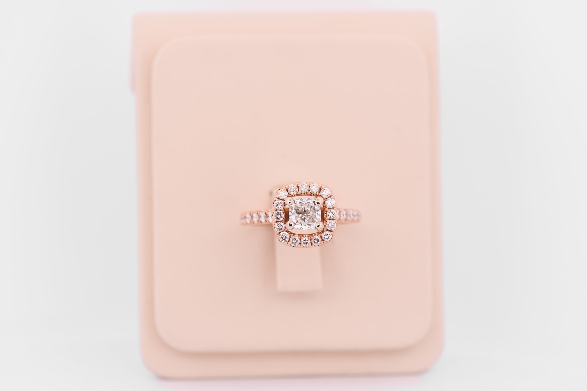 Elegant and romantic, this cushion-cut diamond halo ring offers timeless brilliance with a warm rose gold glow. Crafted in 14k rose gold, the design centers on a sparkling cushion-cut diamond framed by a halo of smaller diamonds that enhance the center stone’s presence and light.
