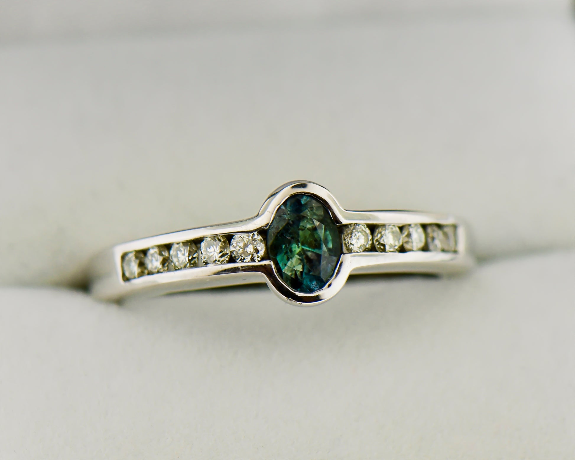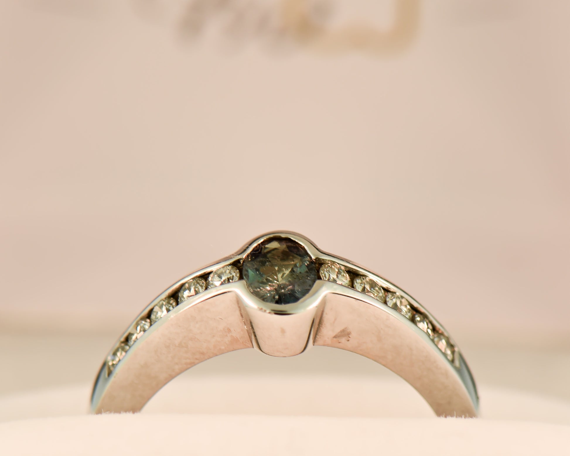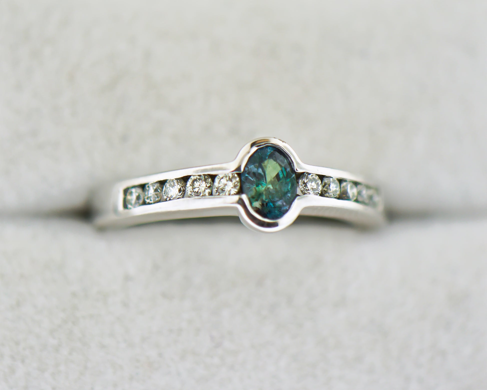 Details: Custom-made 14k white gold ring set with a 0.50ct oval alexandrite (Brazil, moderate-strong color change, moderately included) and 0.30ctw round natural diamonds (SI HI).