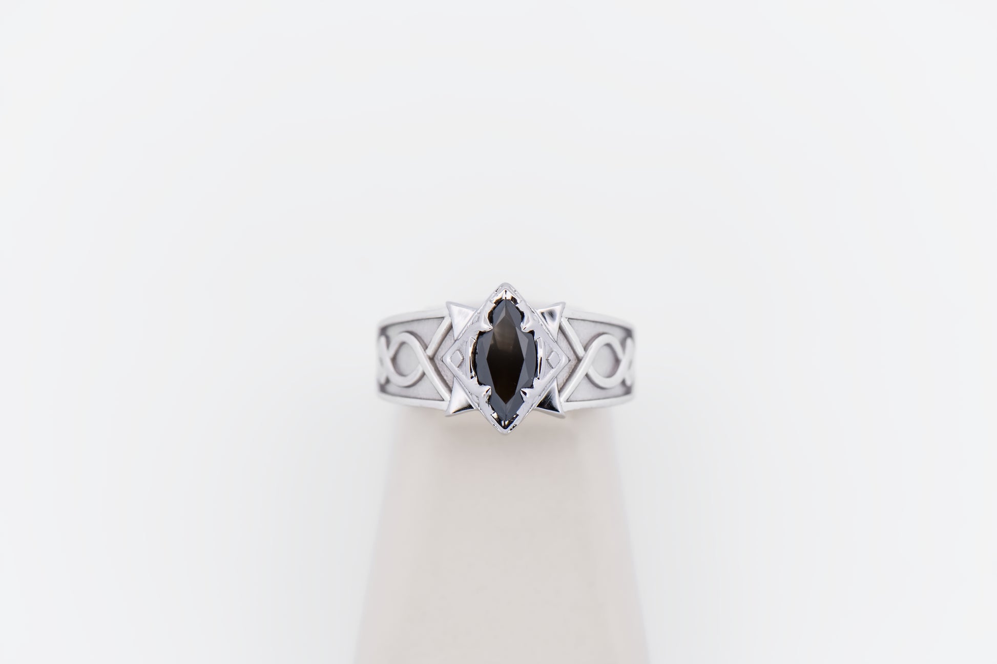 Custom Fantasy Themed Wedding Ring with Marquise Black Diamond